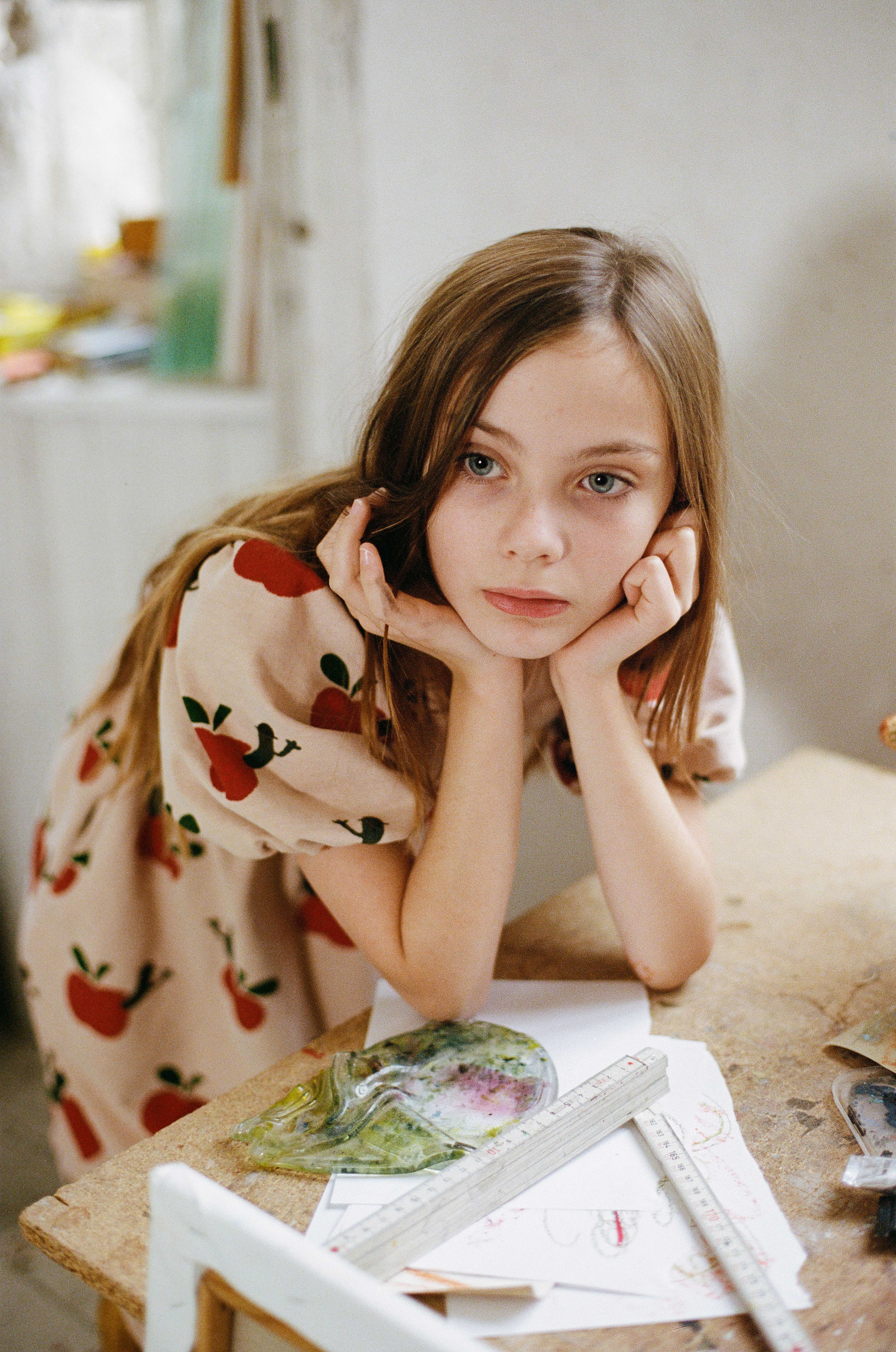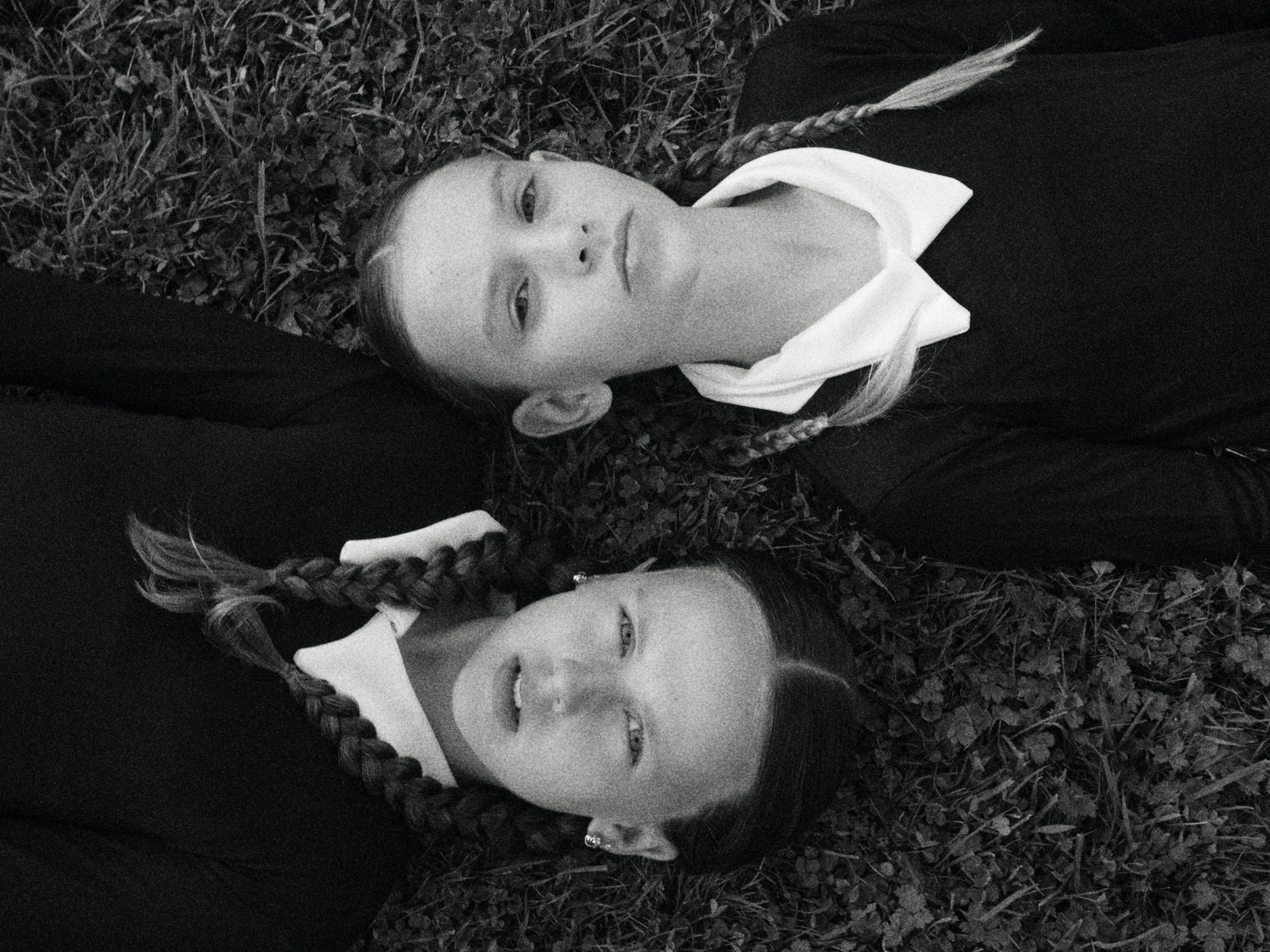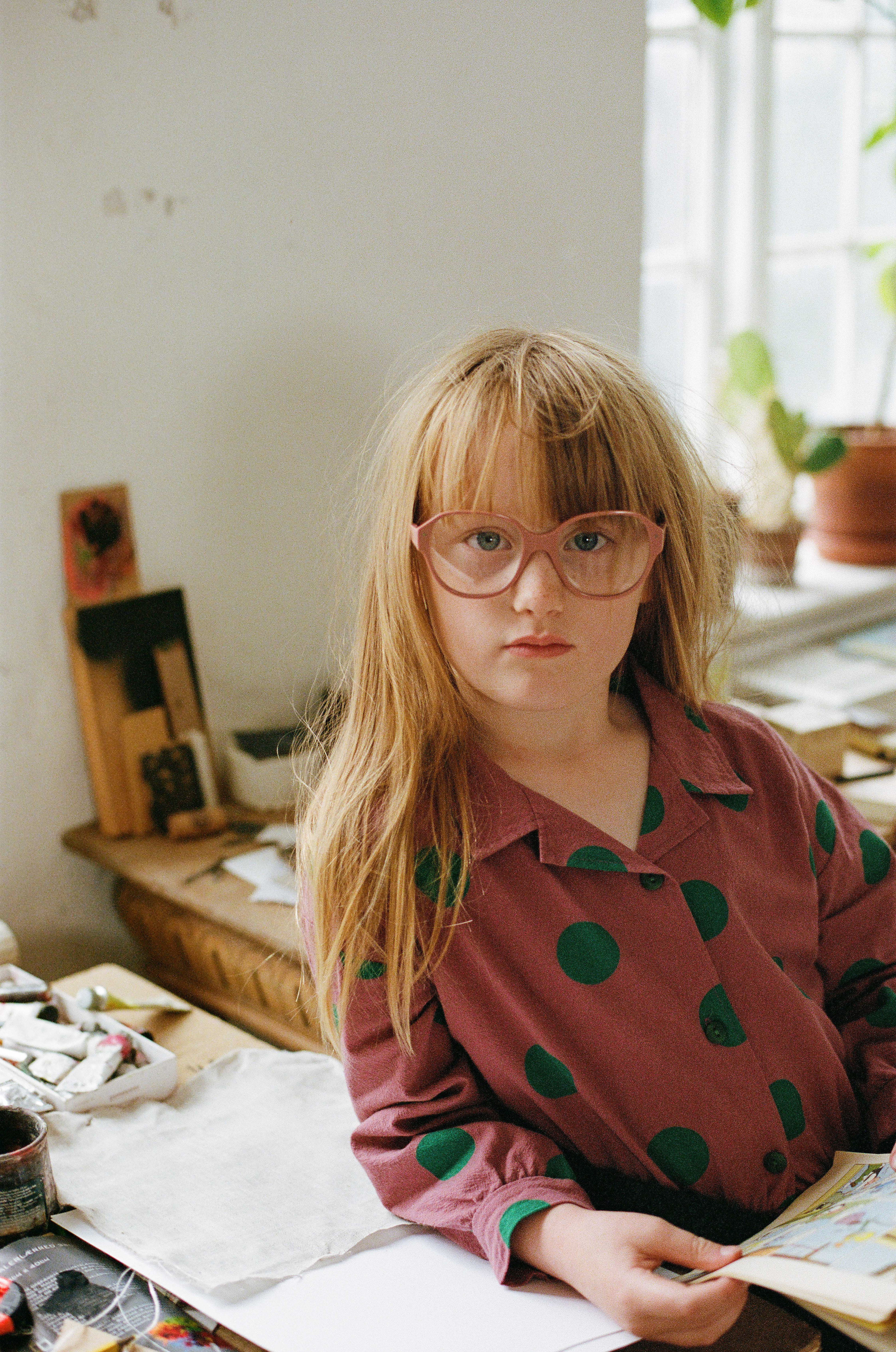 Lykke (left) wears dress by Weekend House Kids. Frigg (right) wears dotted dress and knit by The Campamento, glasses by Very French Gangsters.