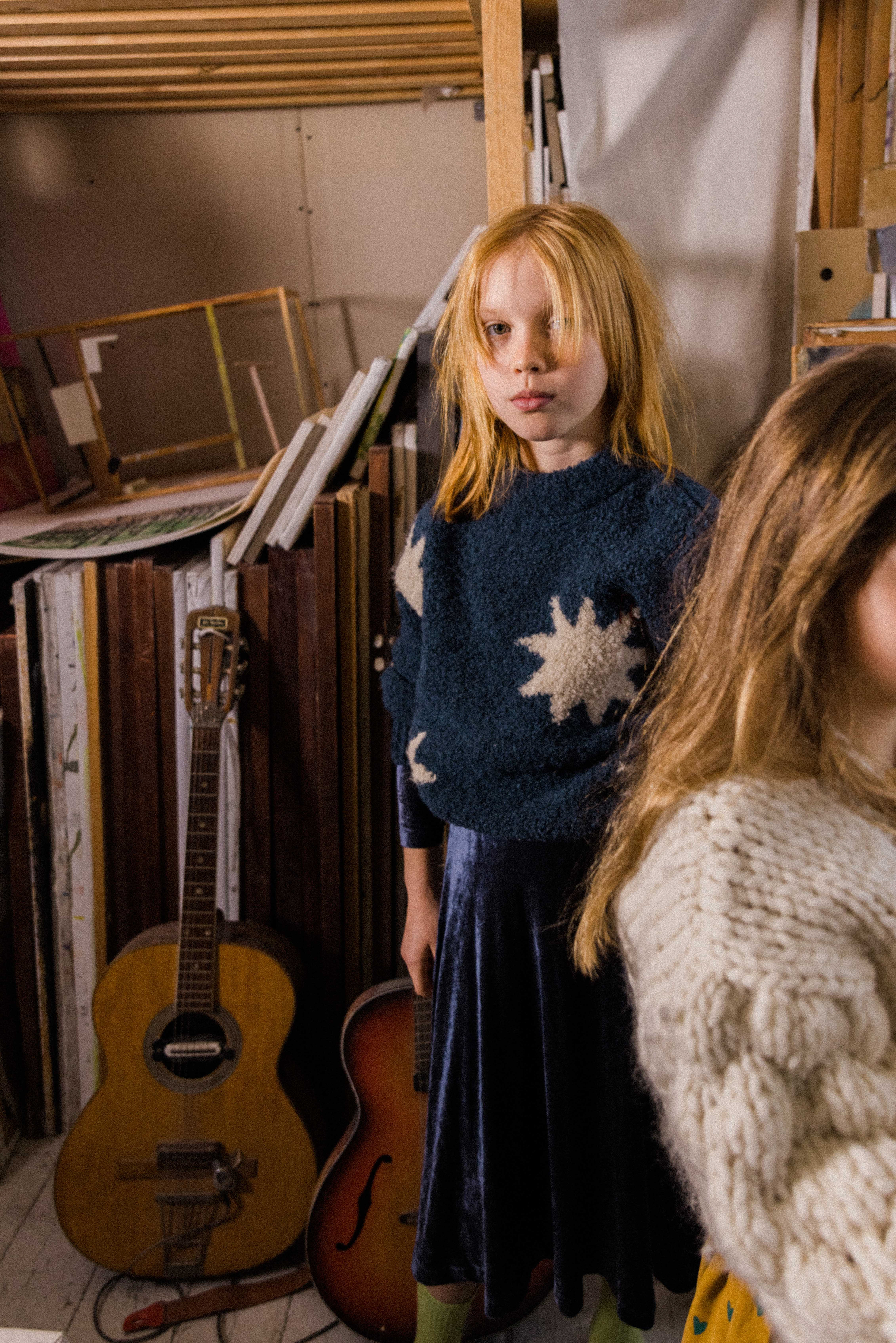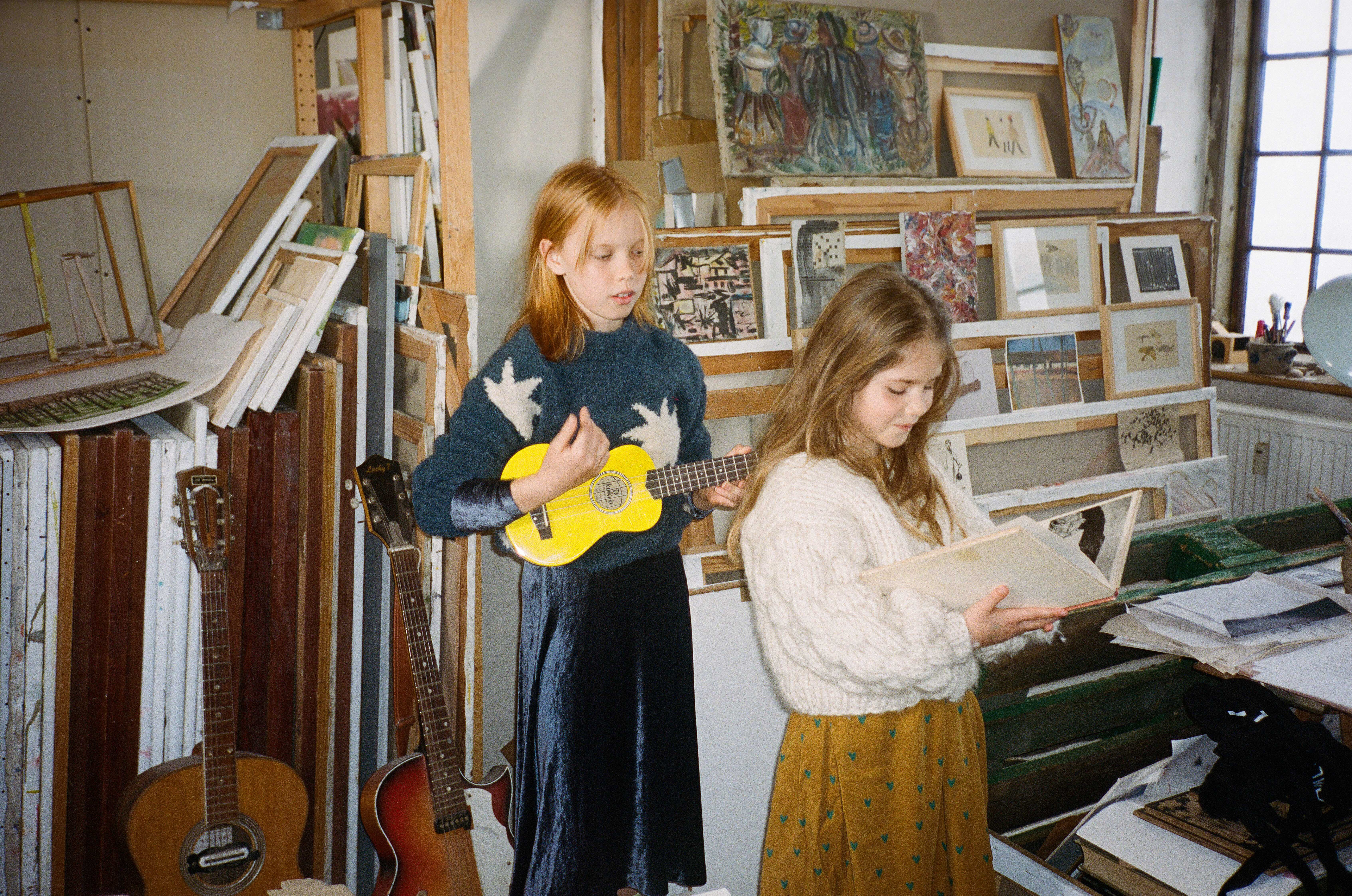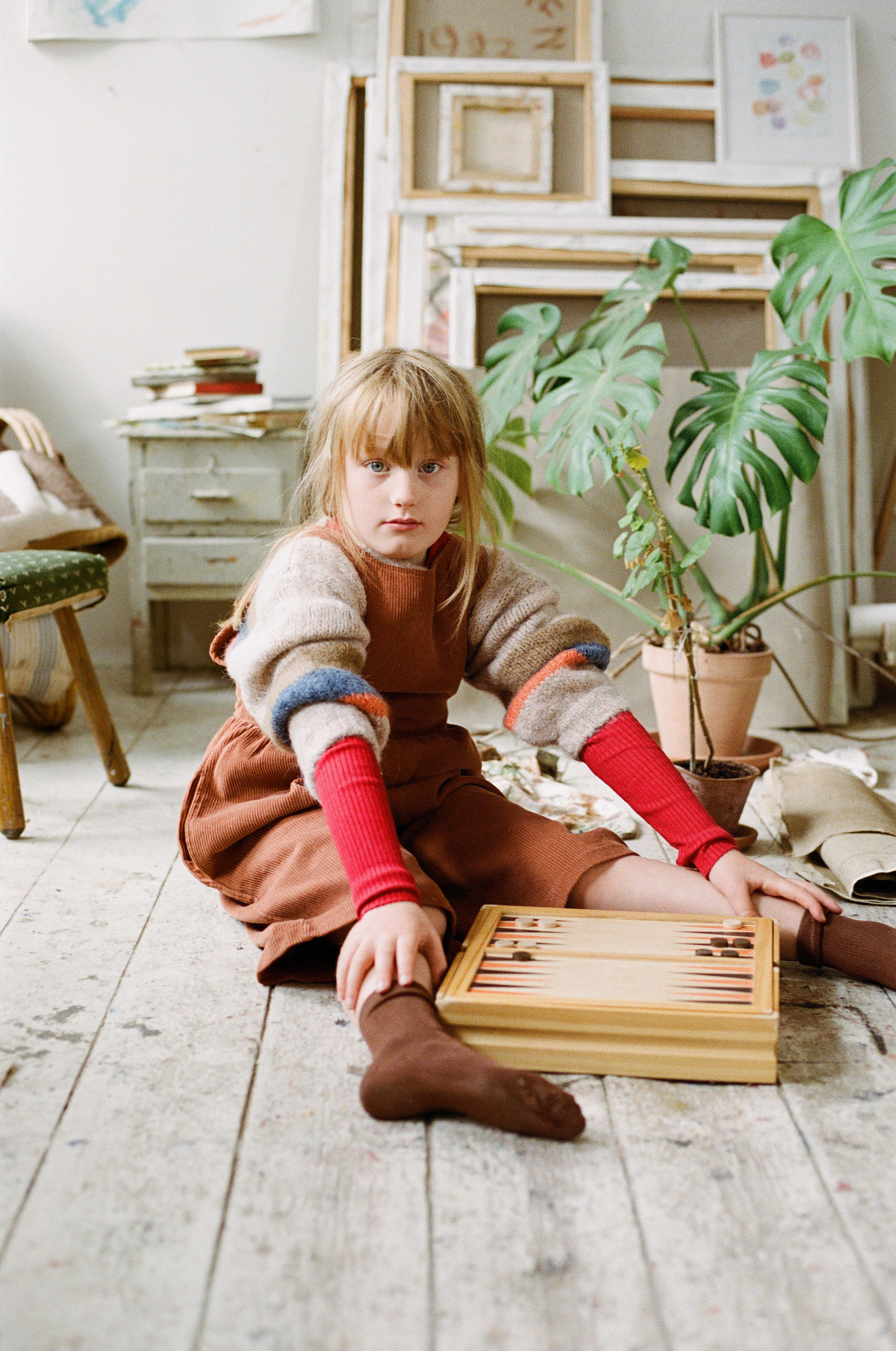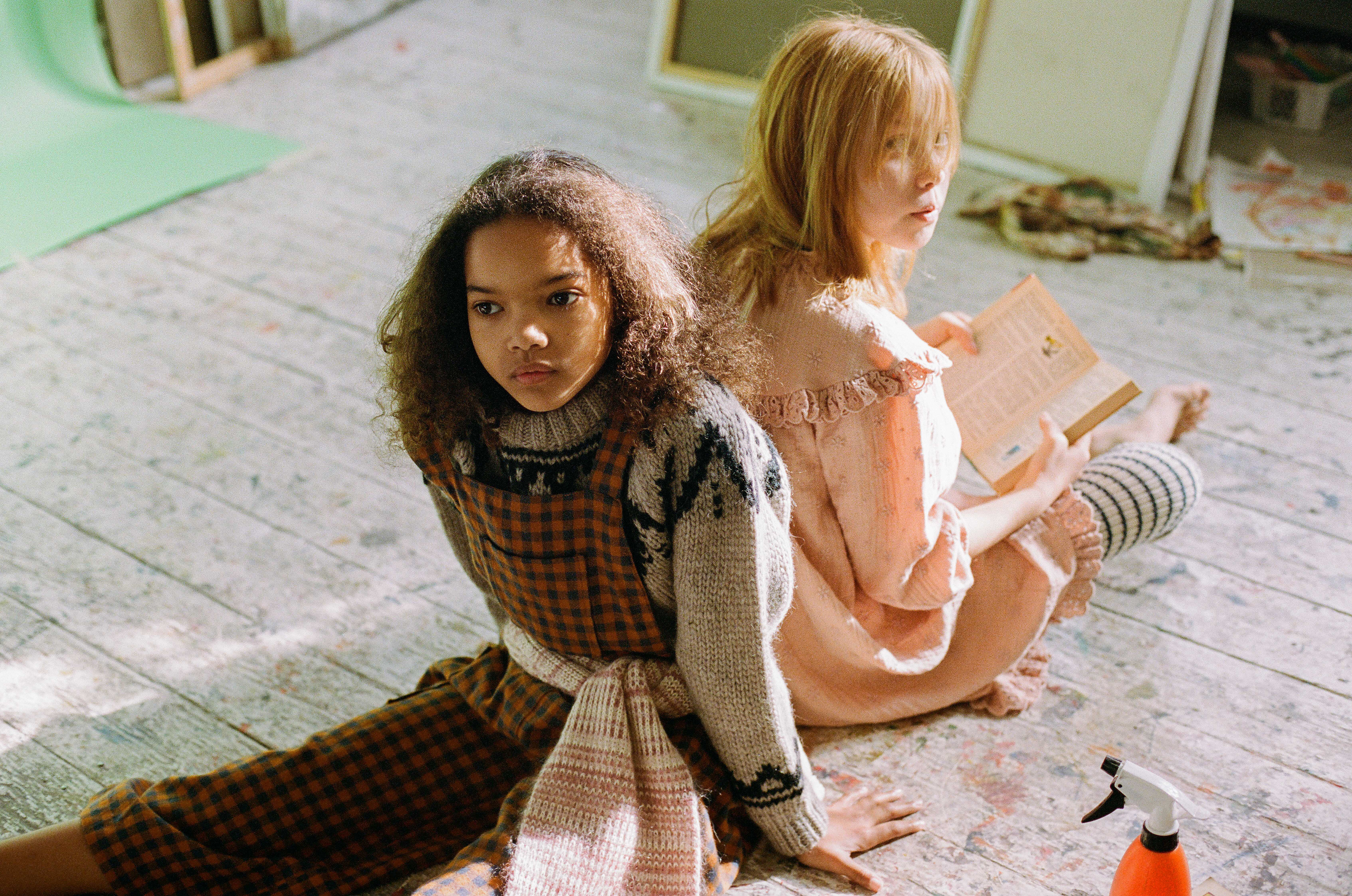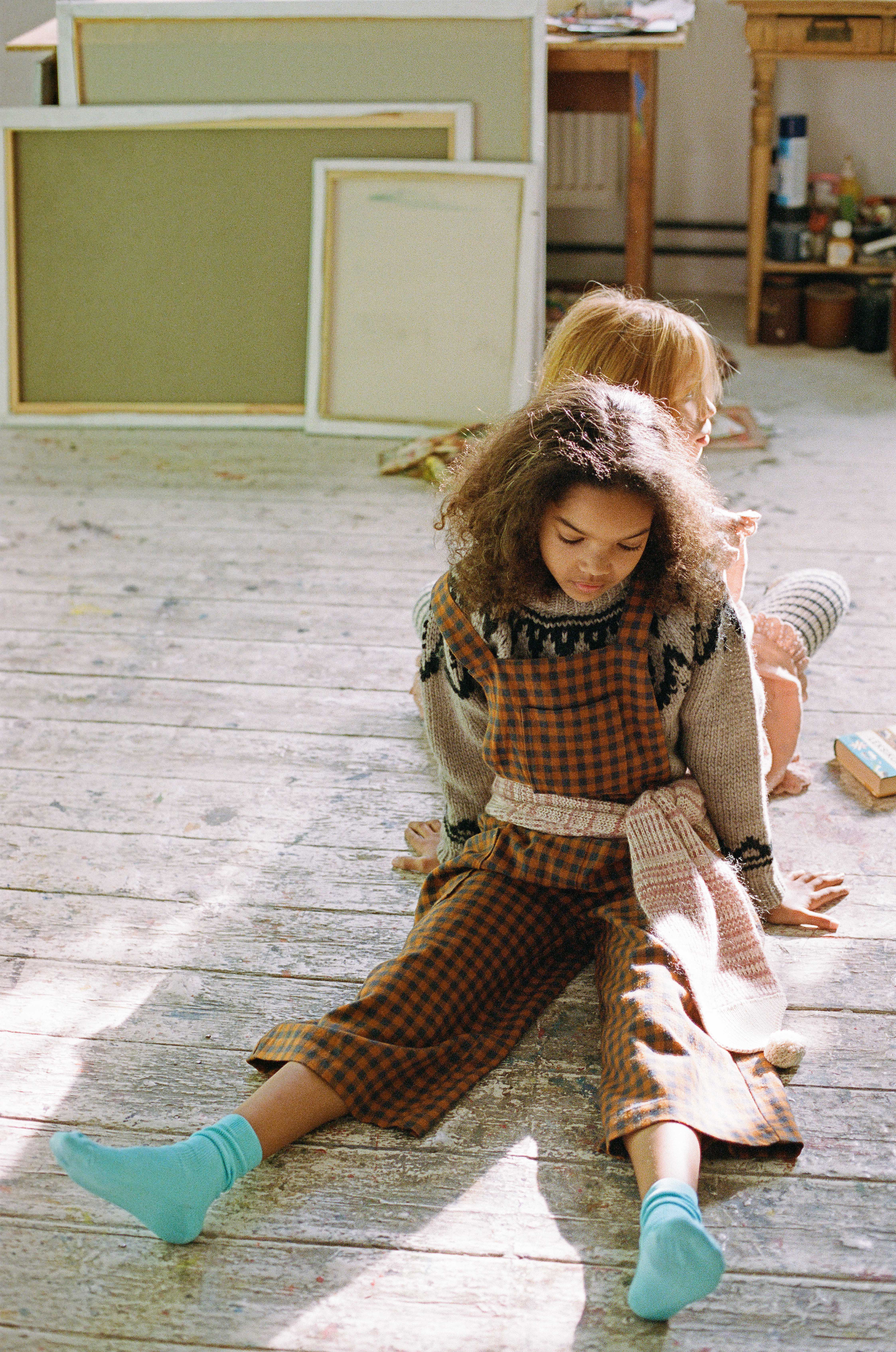 Flora is wearing wool sweater from Oeuf, stockings from The Campamento. Josefine is wearing knit from The Campamento and velvet dress by Bellerose.