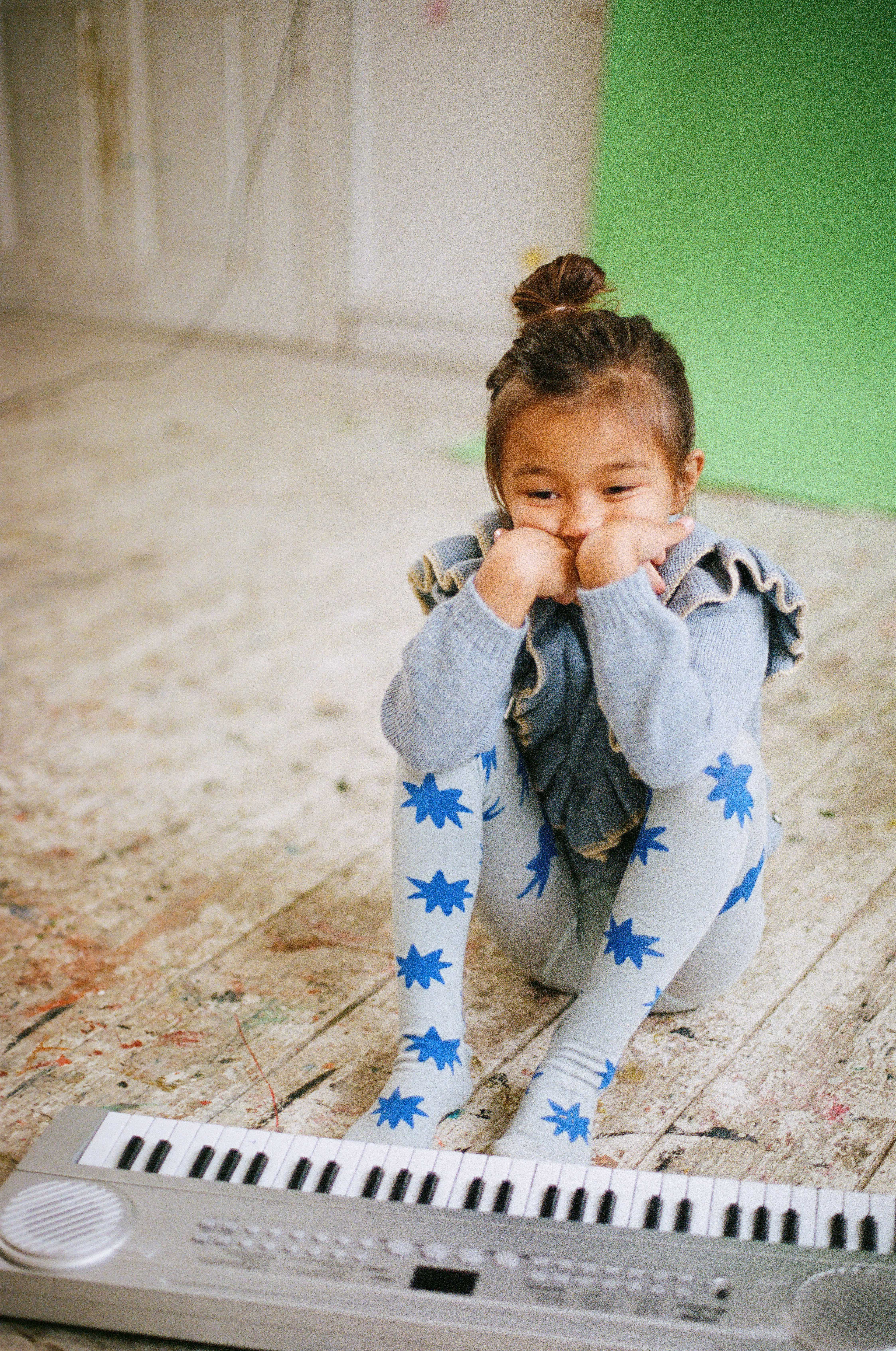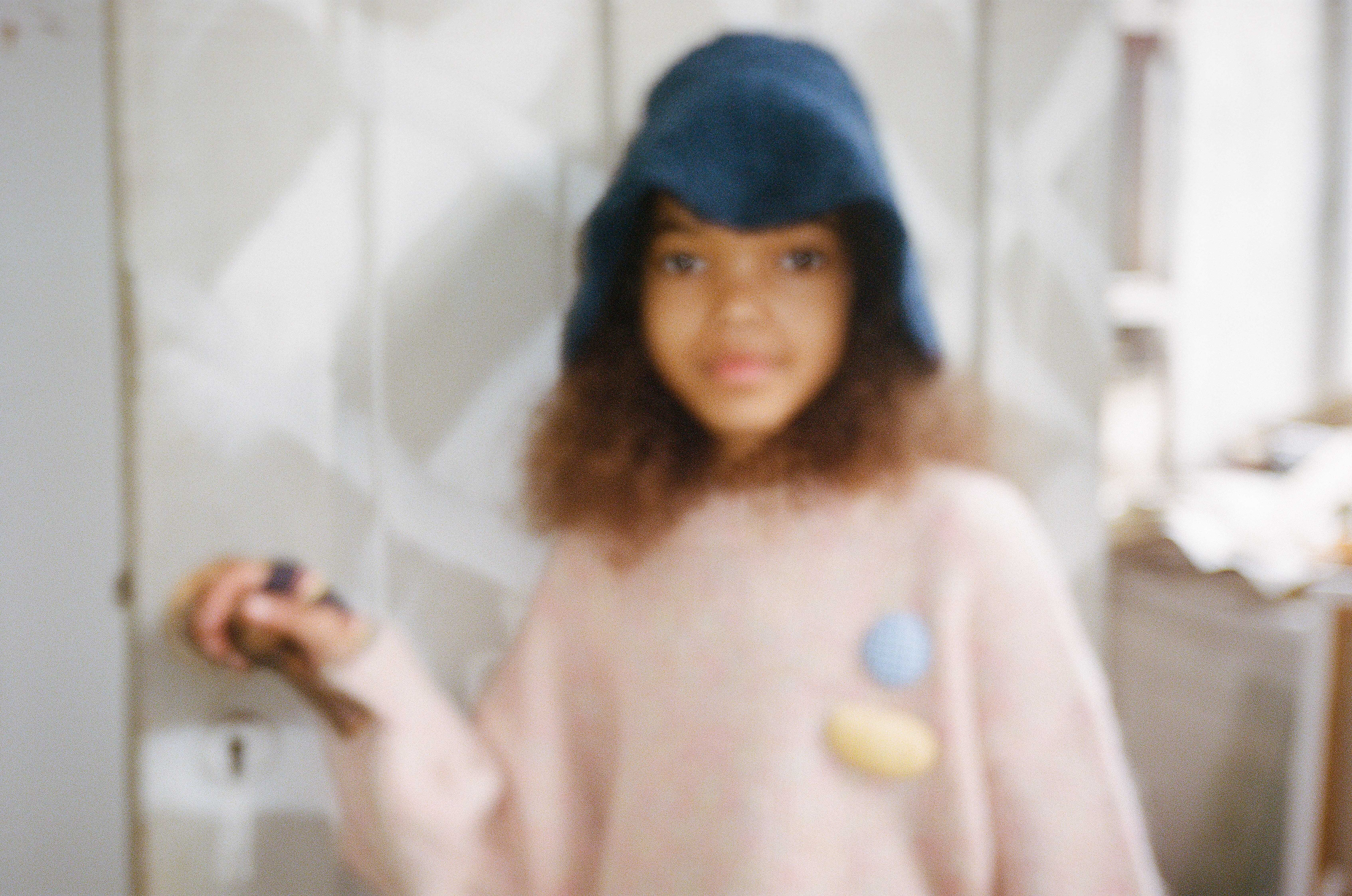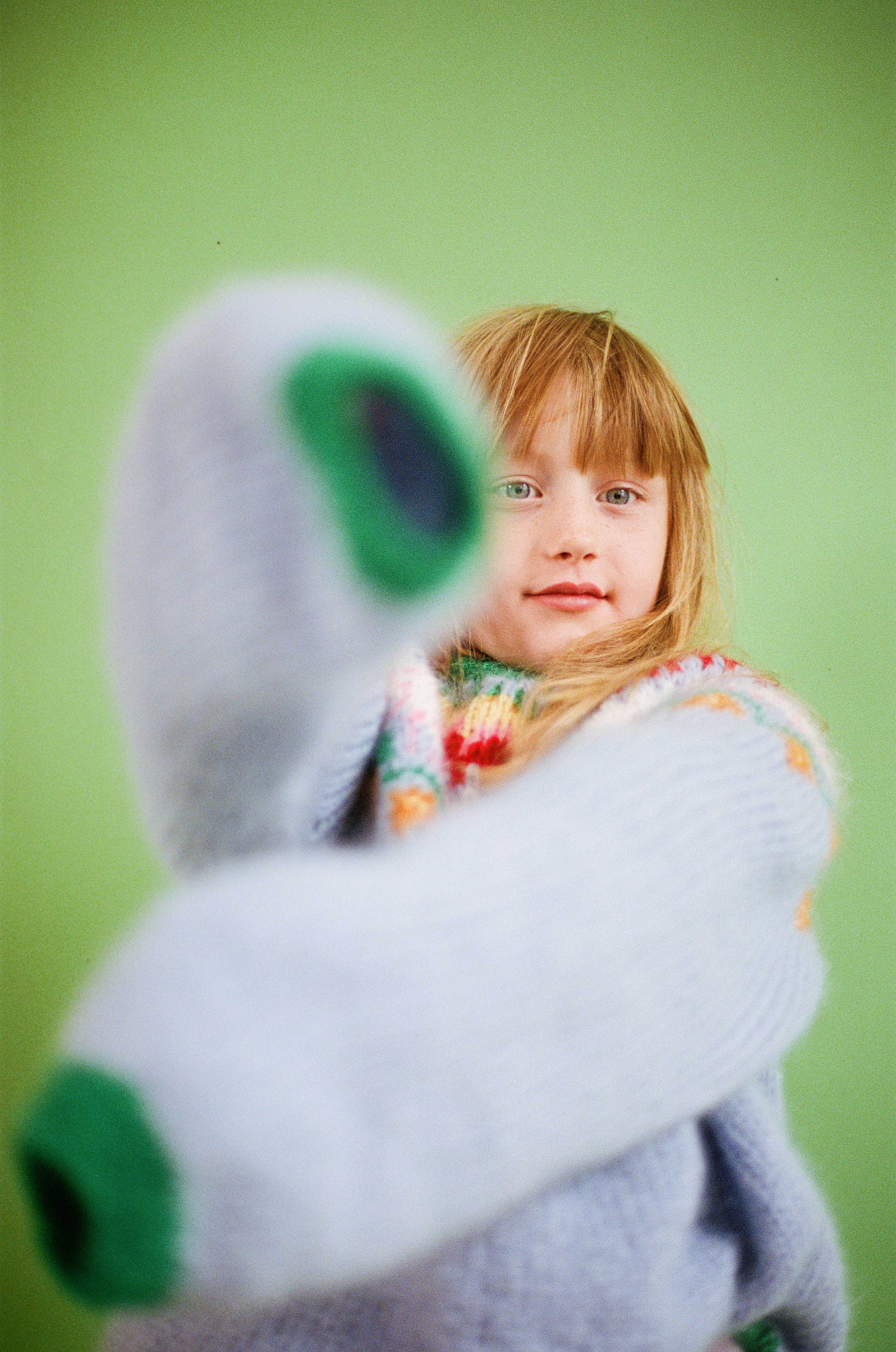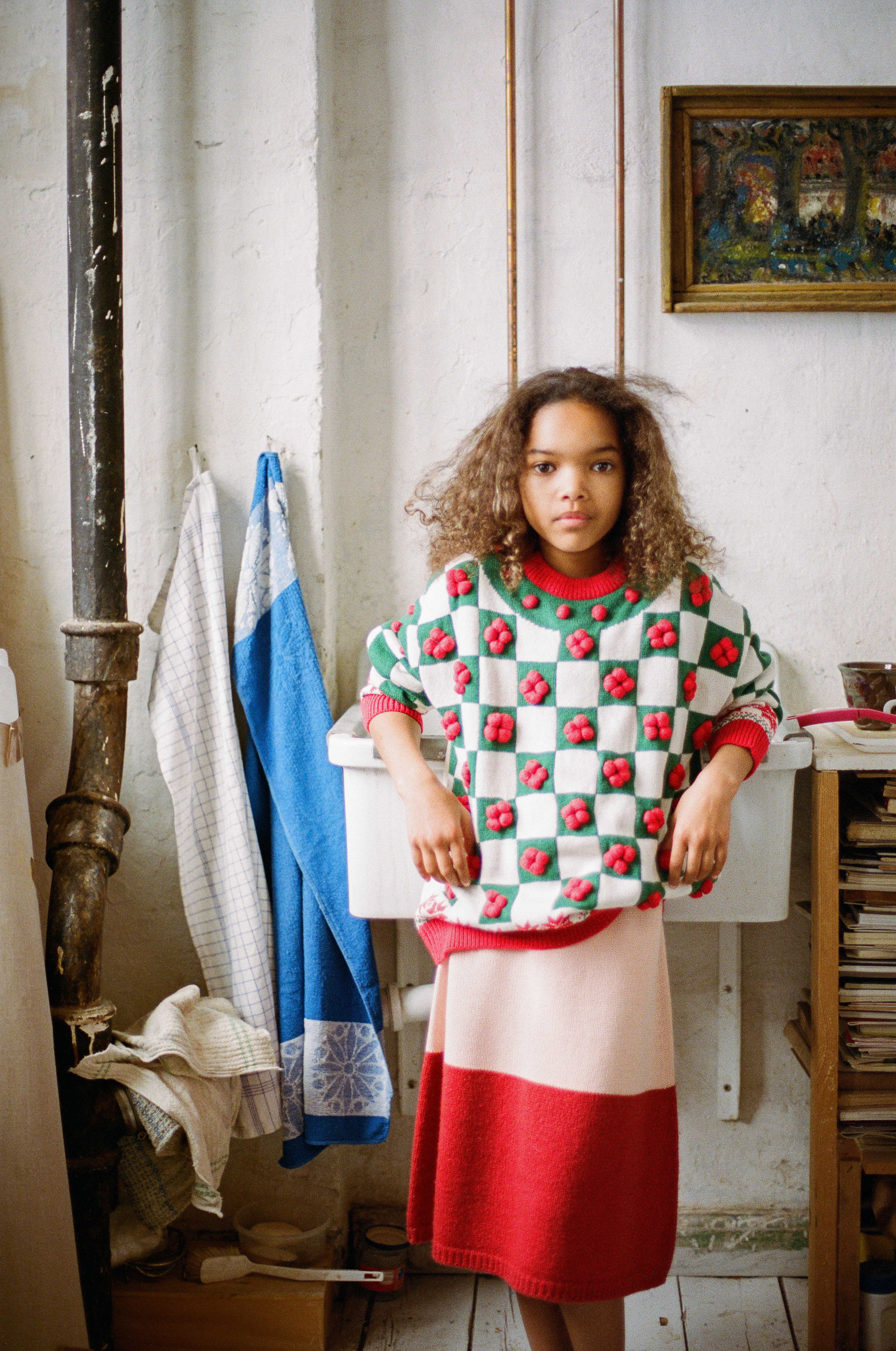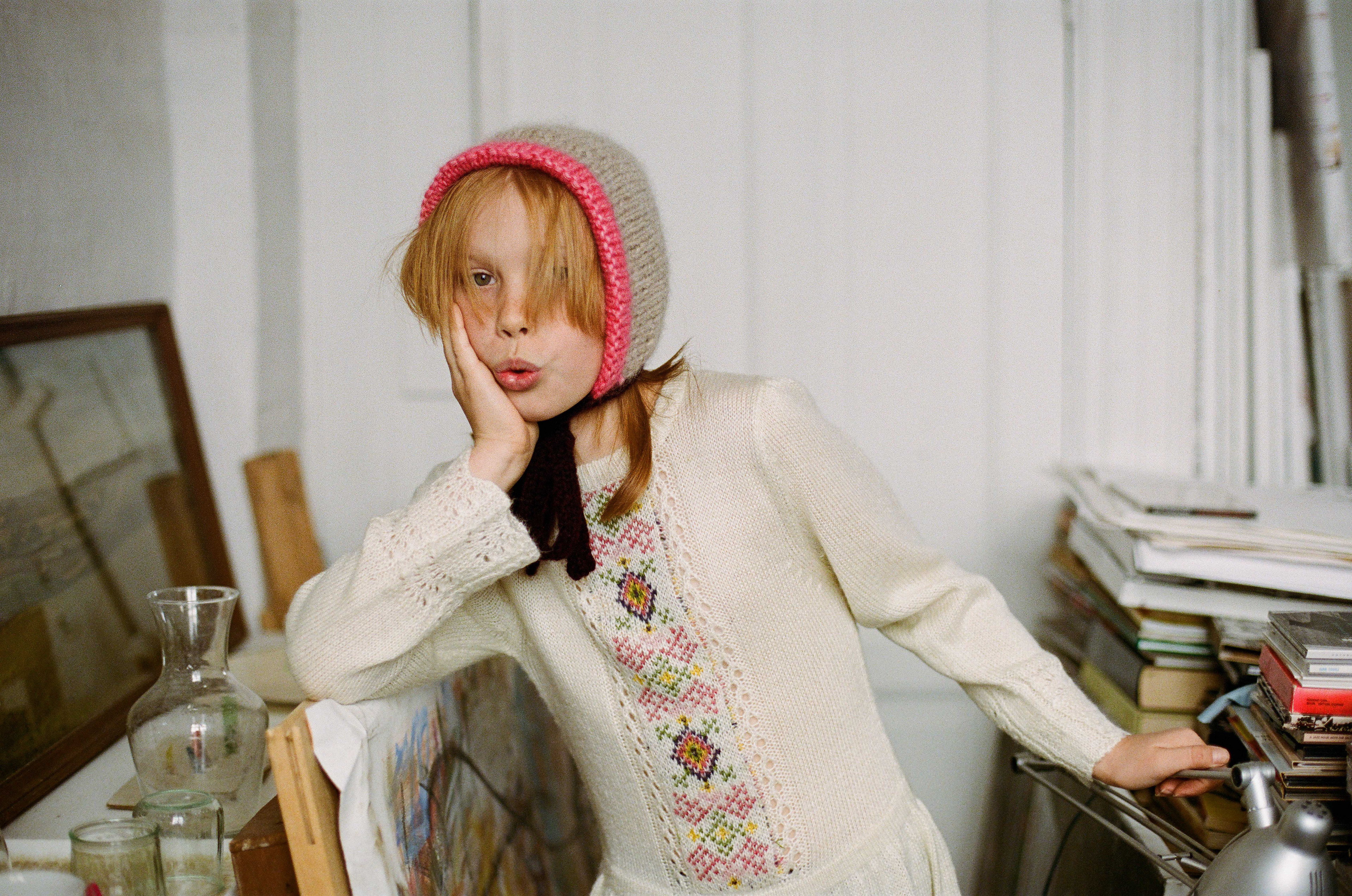 Flora is wearing wool sweater from Oeuf, stockings from The Campamento. Josefine is wearing knit from The Campamento and velvet dress by Bellerose.