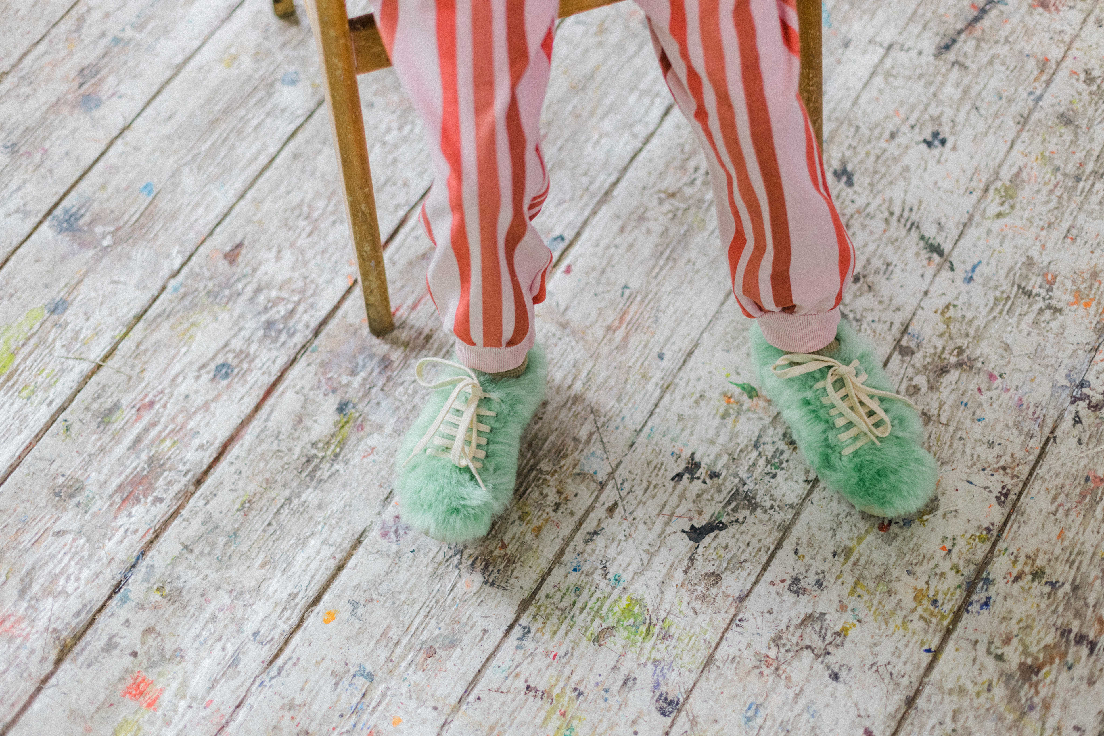 Flora is wearing pants from Weekend House Kids and fuzzy shoes from The Animals Observatory.