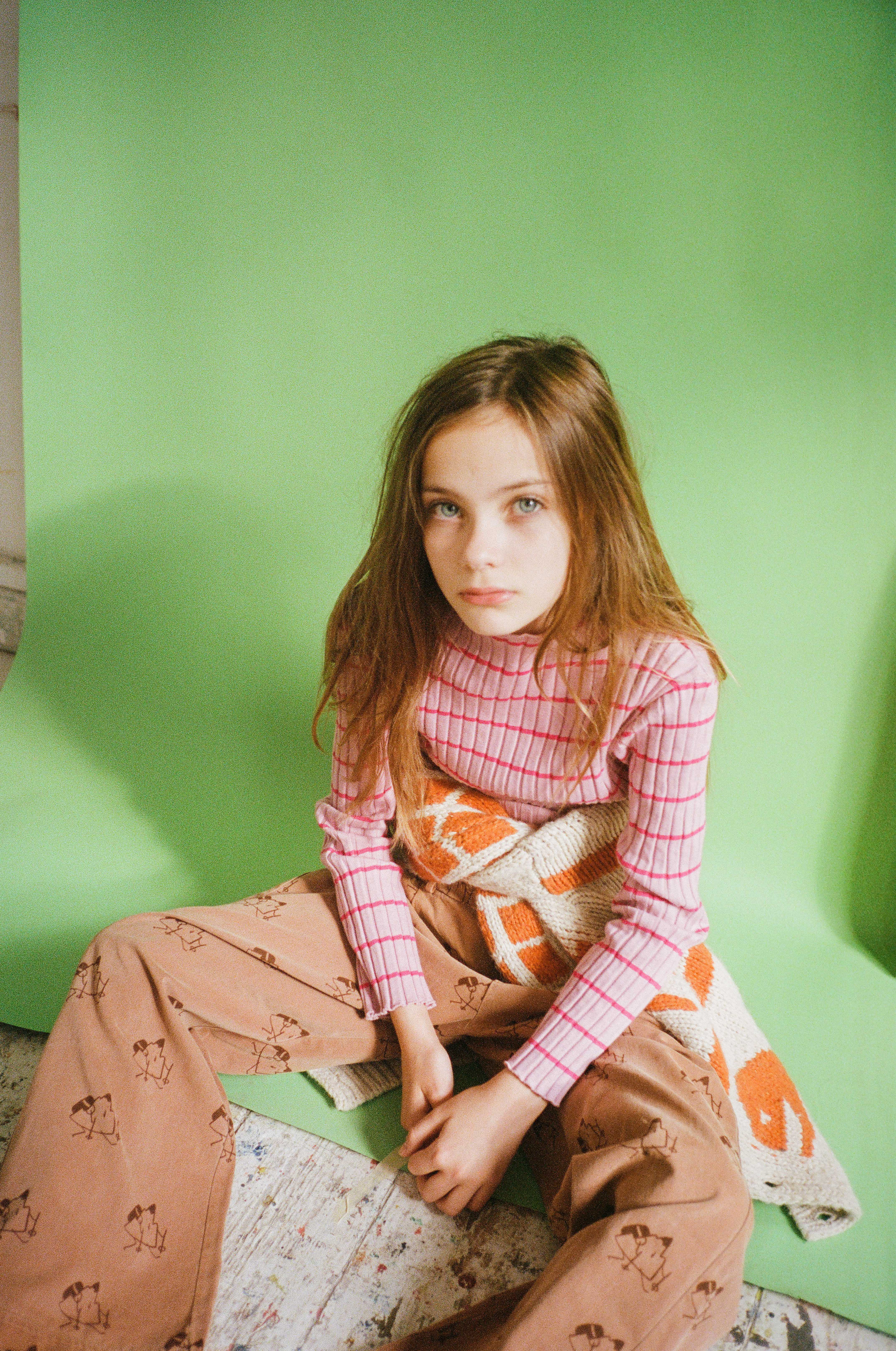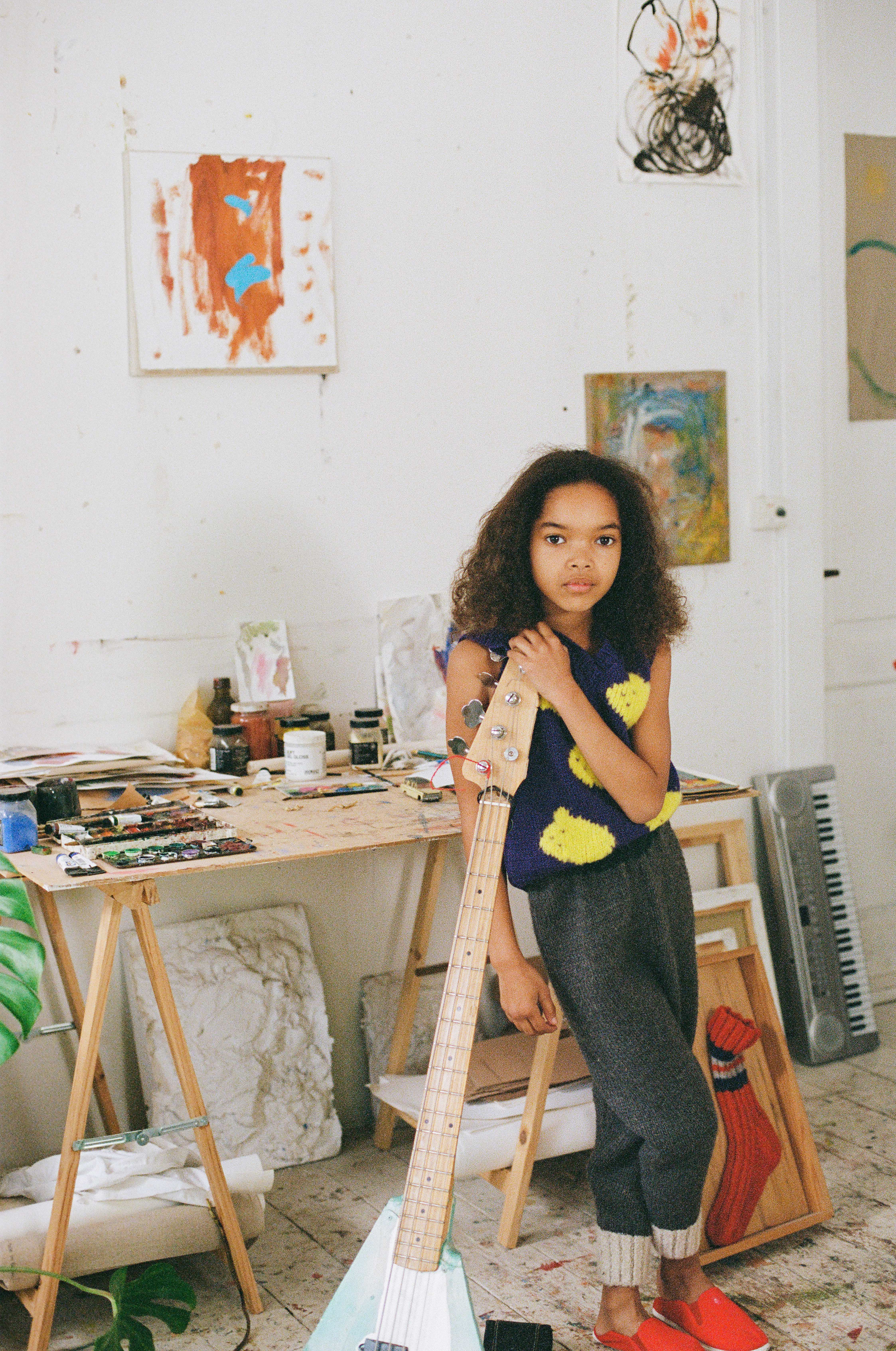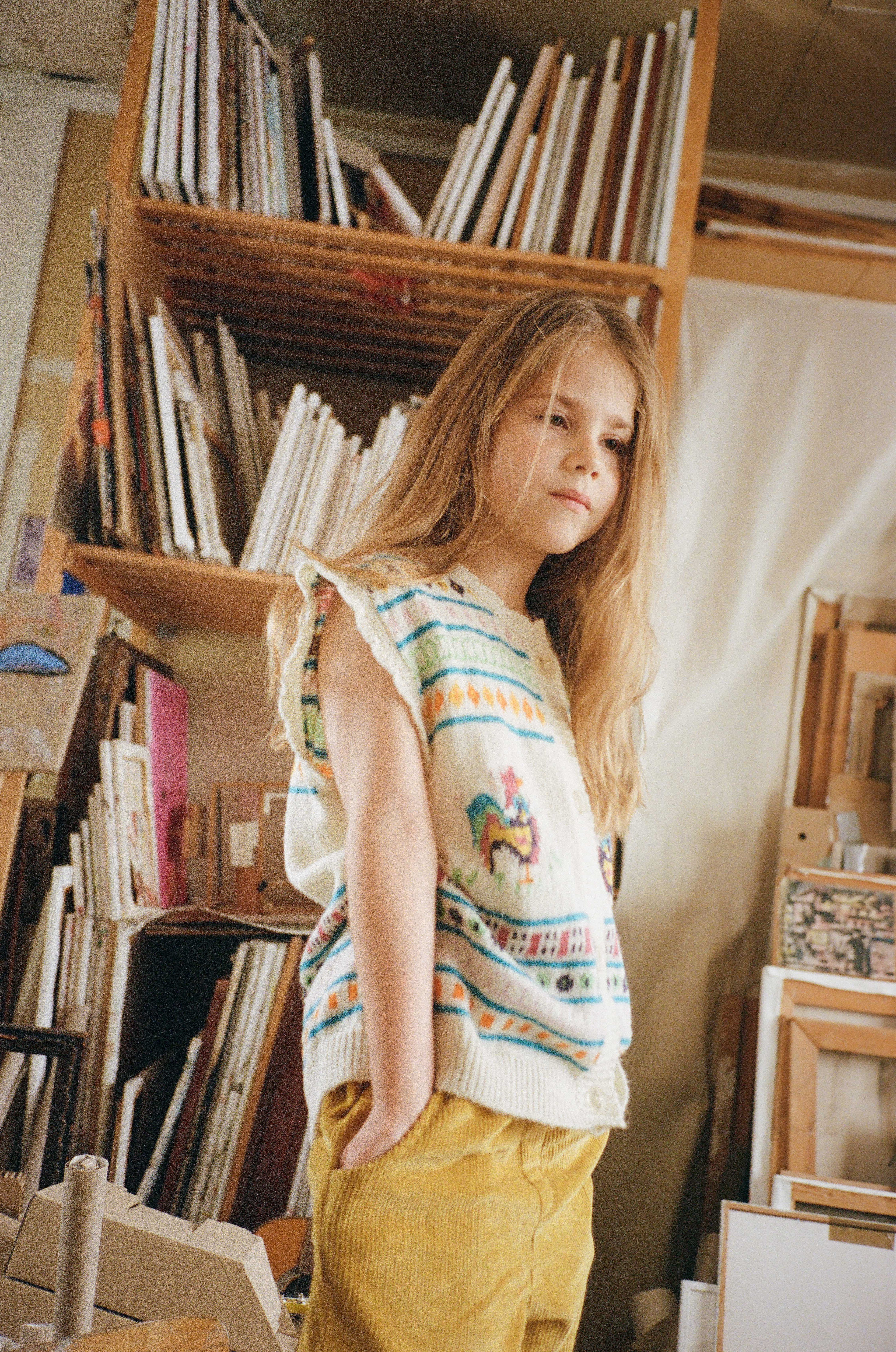 Dahlia is wearing a vest from The Animals Observatory and knitted trousers from The Campamento.