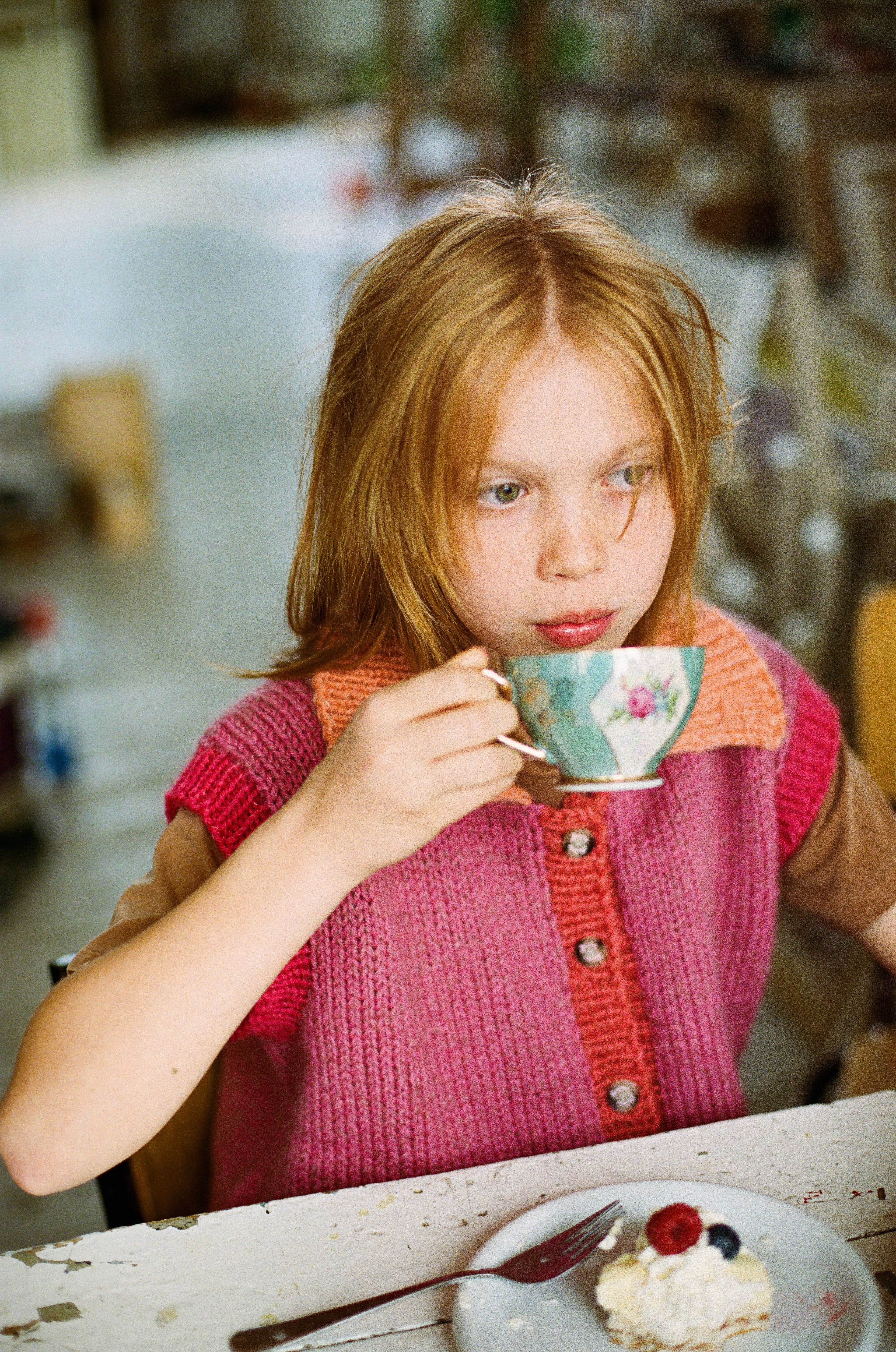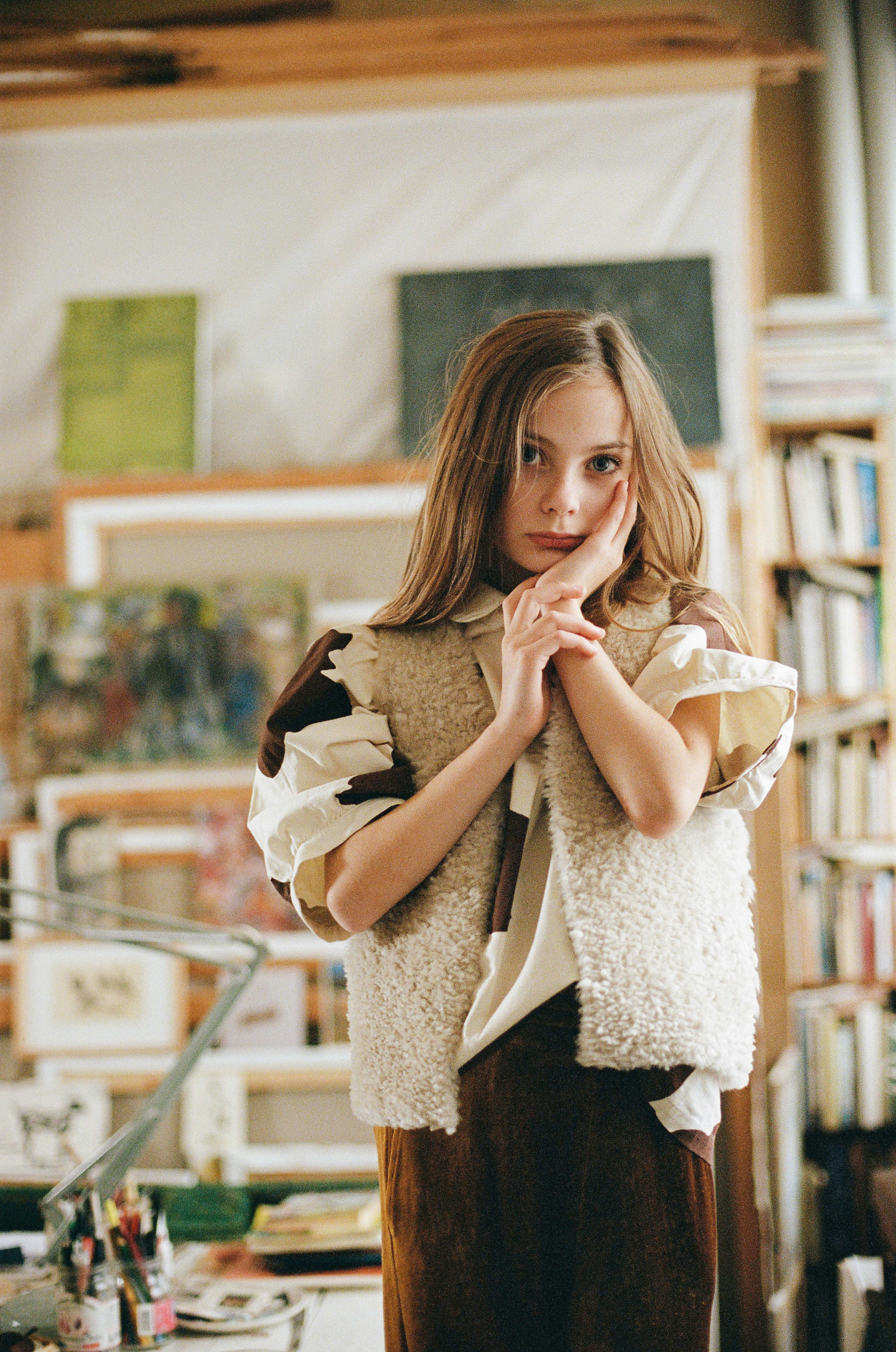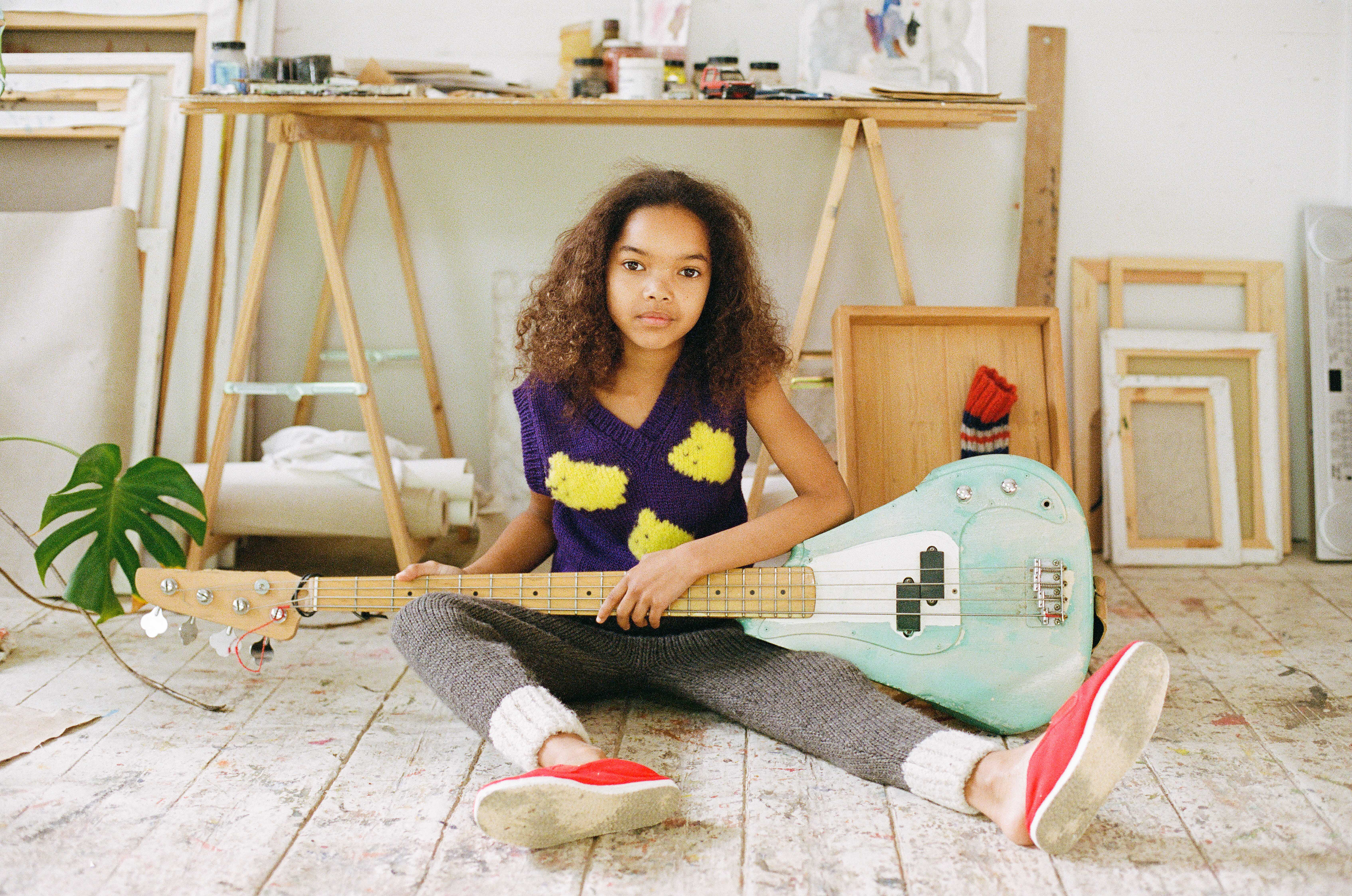 Dahlia is wearing a vest from The Animals Observatory and knitted trousers from The Campamento.