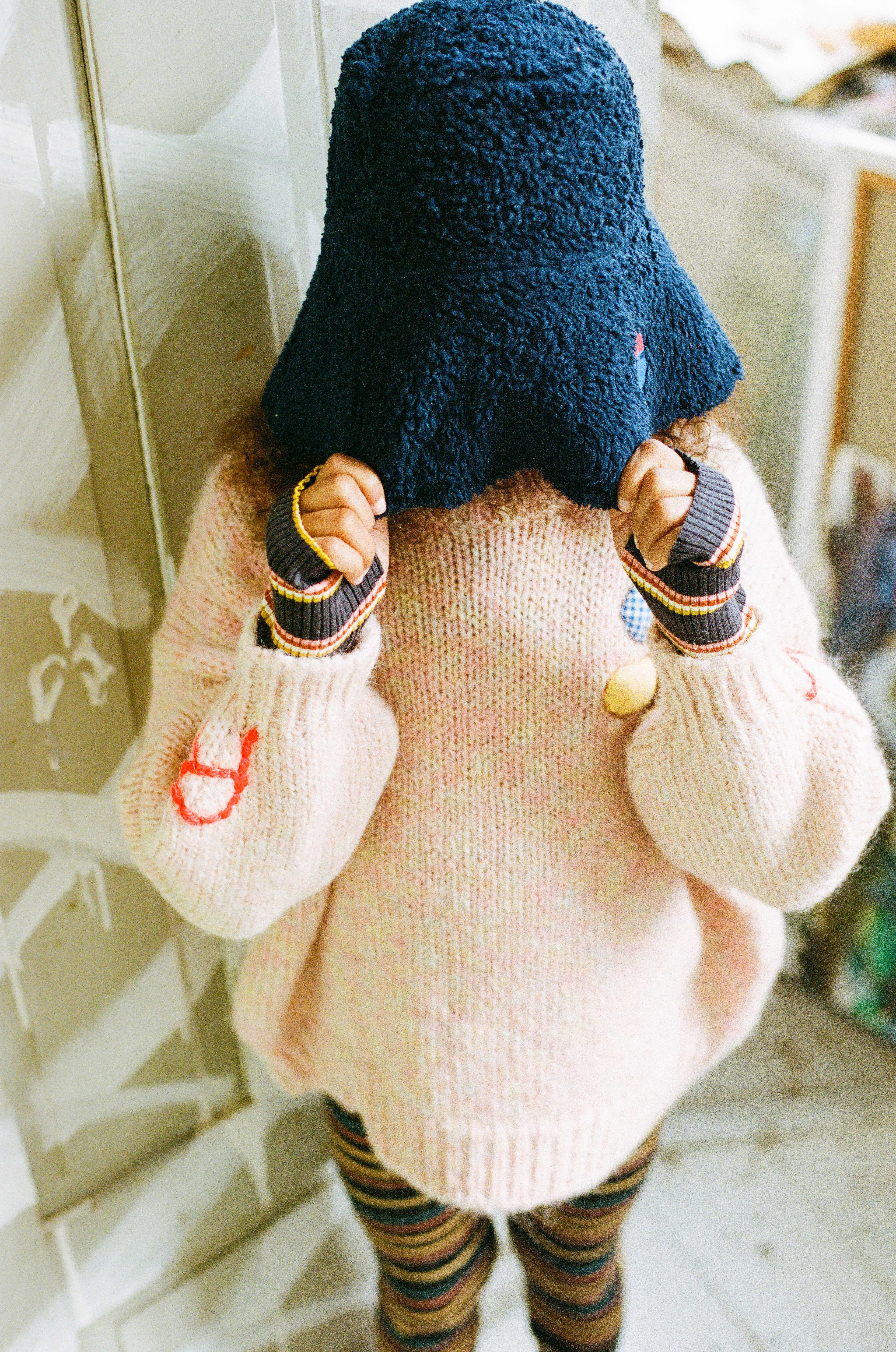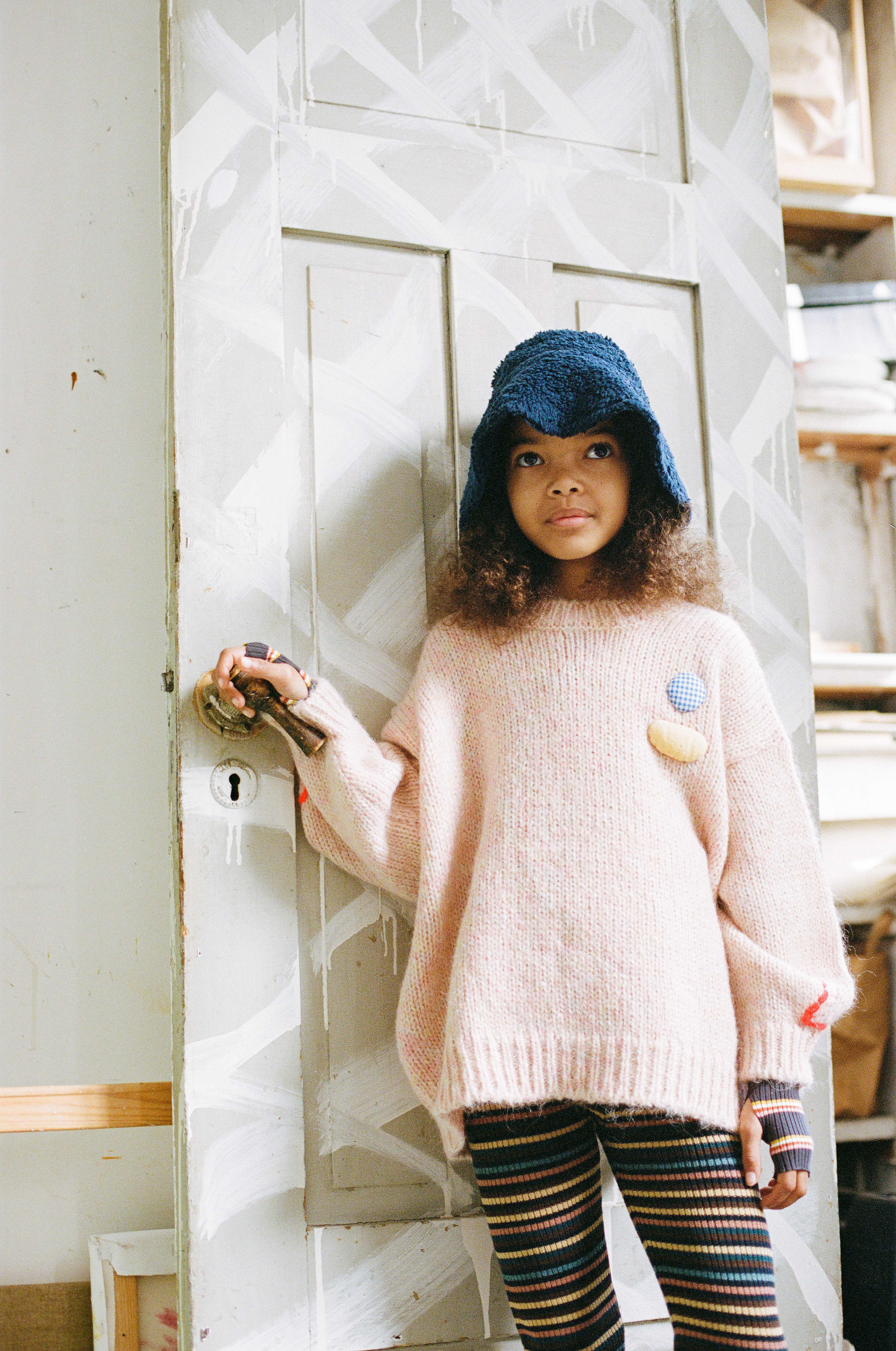 Dahlia wears knit by Tambere, long sleeved top from Molo, stripy leggings by FUB Kids and bucket hat from Bonmot.