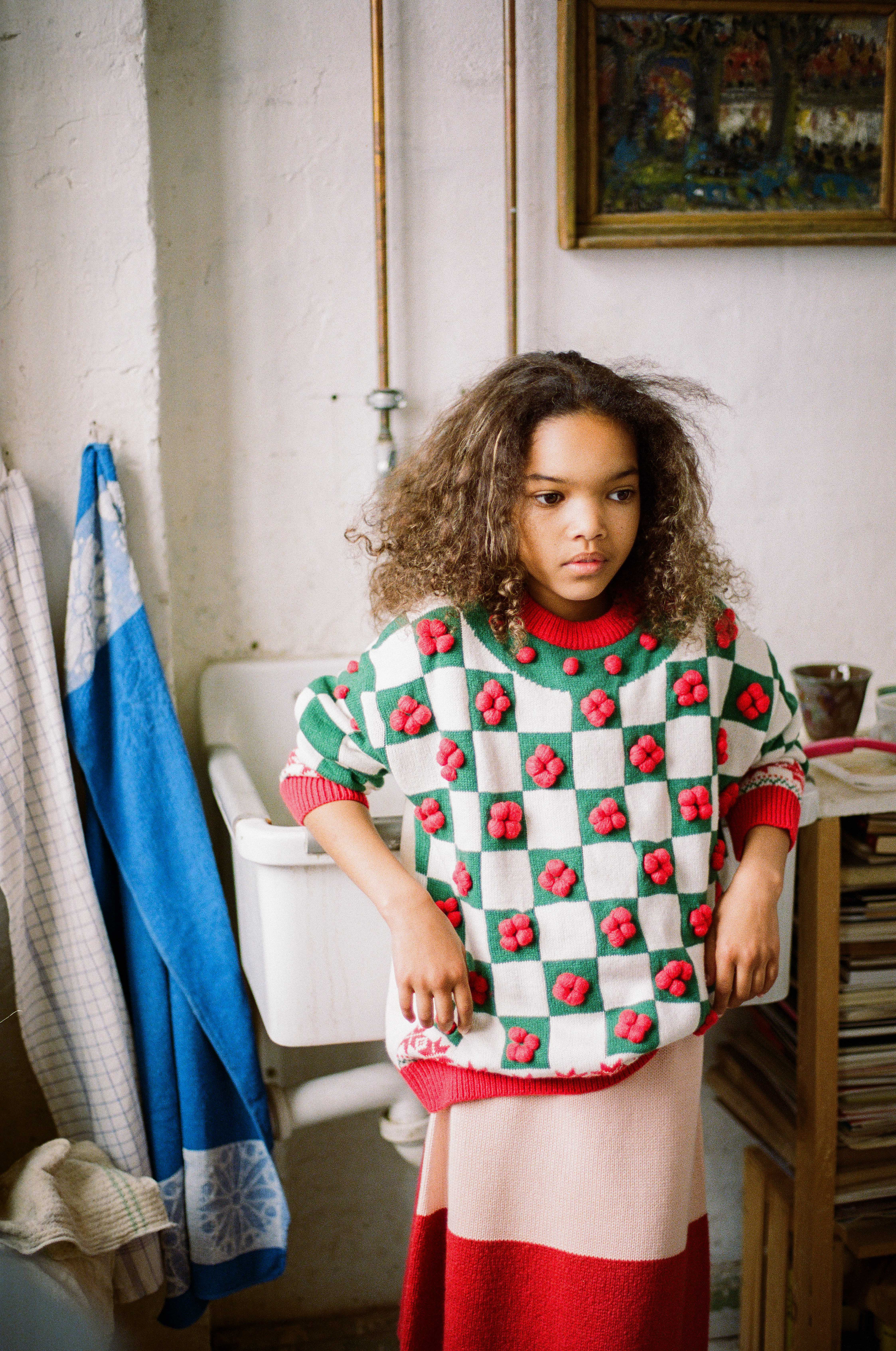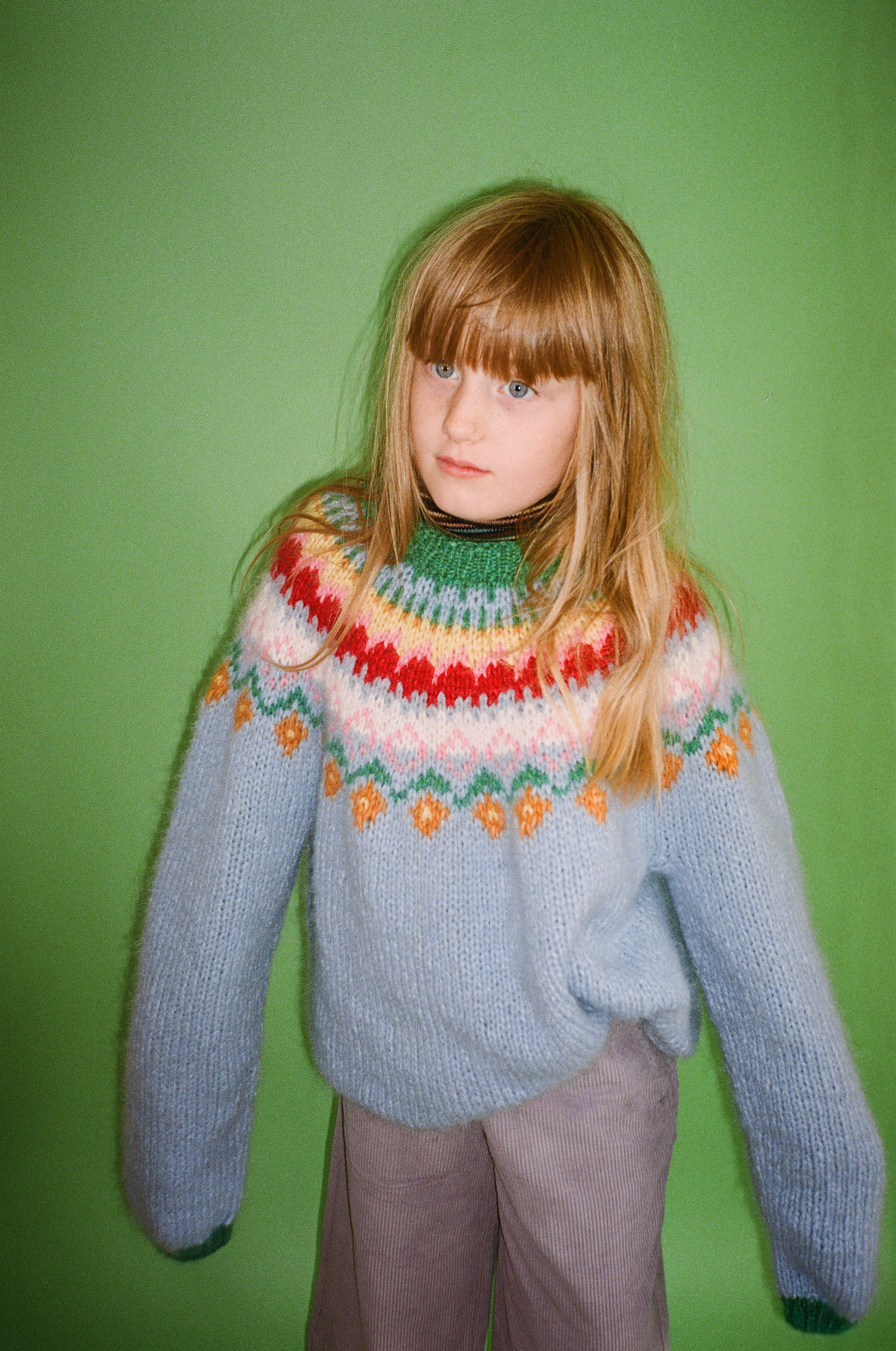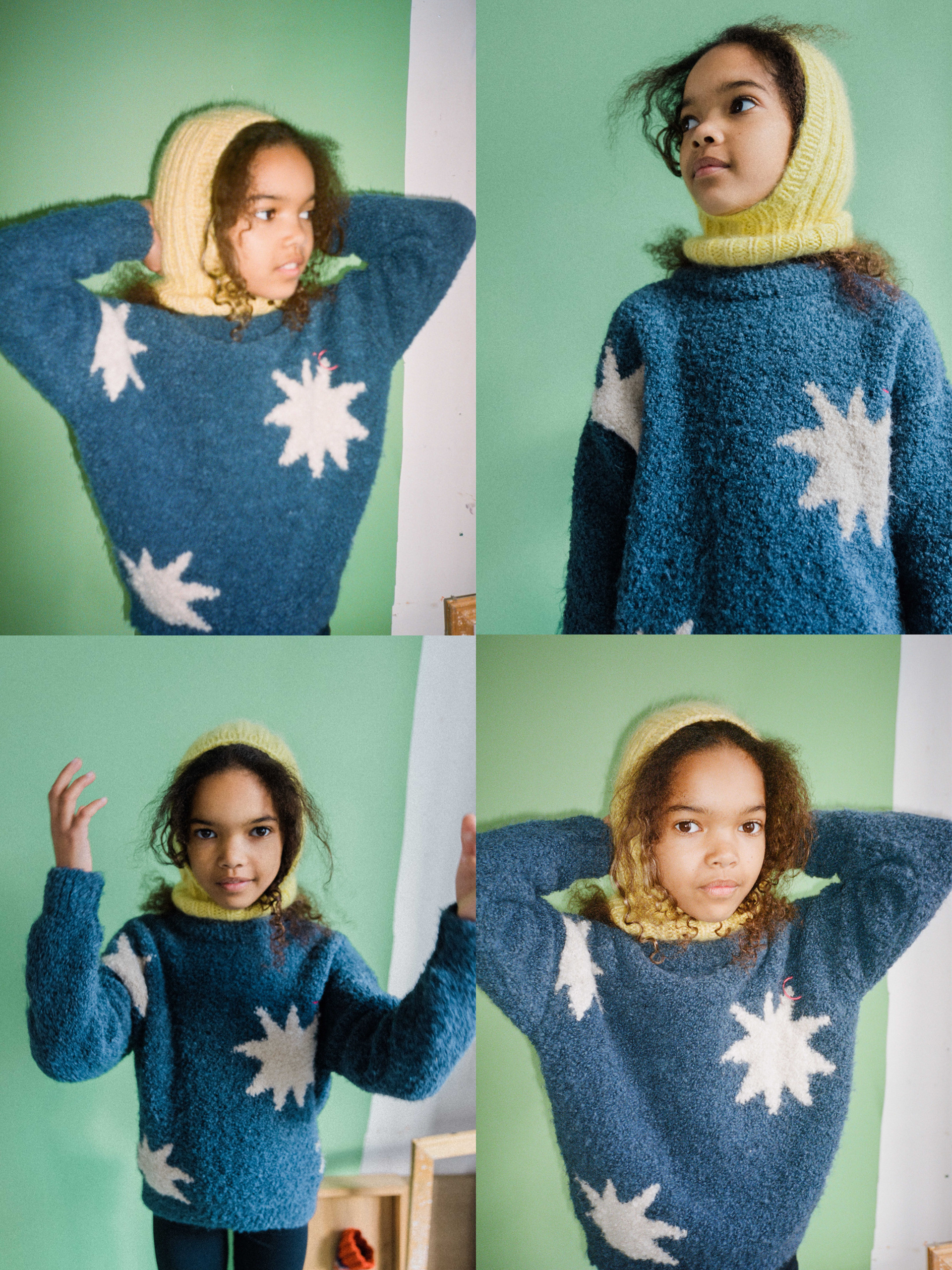 Dahlia (left) is wearing knit from Fish & Kids and skirt from Weekendhouse Kids. Frigg (middle) is wearing knit from Deima Knitwear. Lykke (right) is wearing shirt from The Animals Observatory, vest from Gabriel et Valentin and velvet pants from Bellerose.
