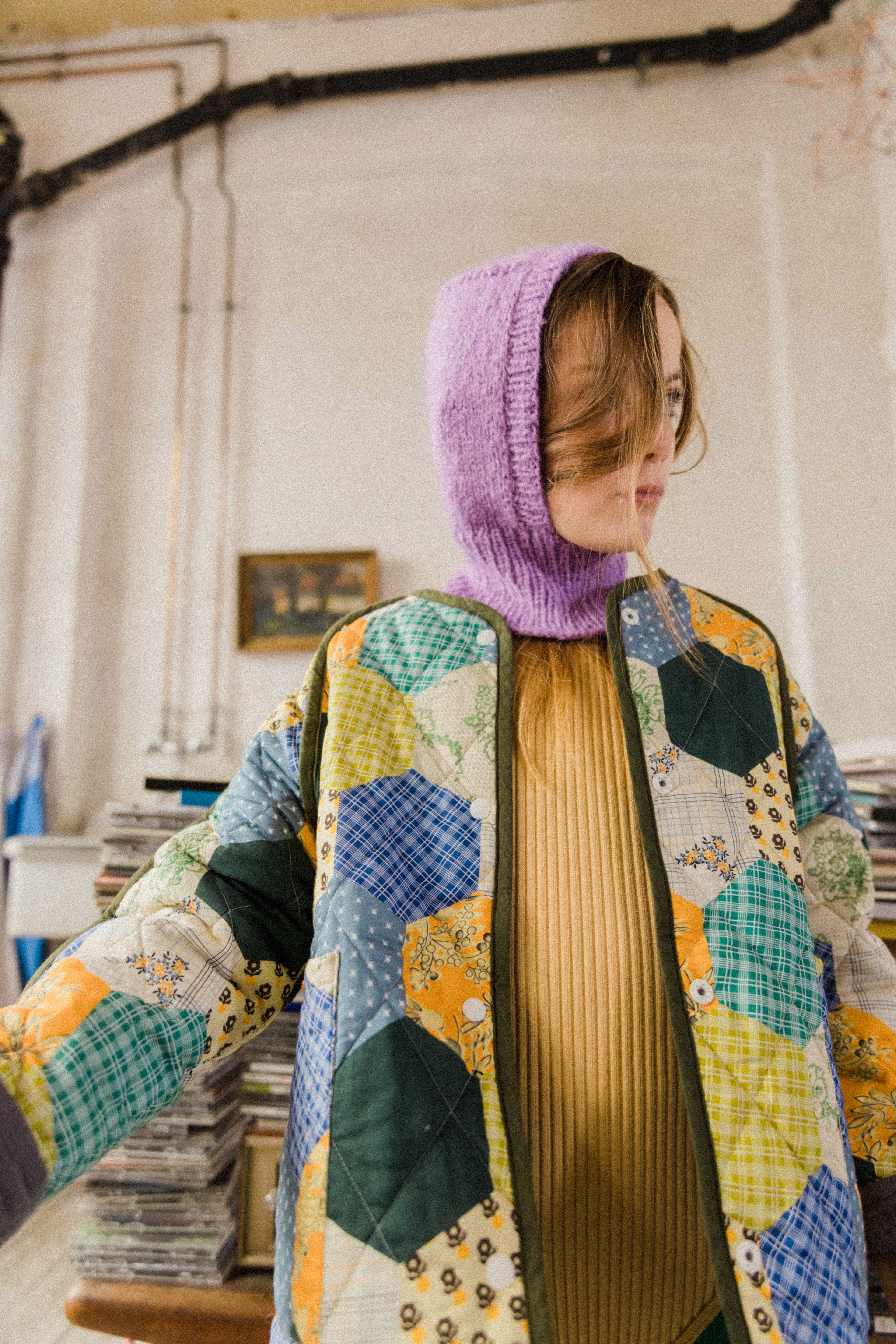 Lykke (left) wears a patchwork jacket by Tambere, Liilu top, green stockings from Repose AMS and lilac balaclava from Deima Knitwear.