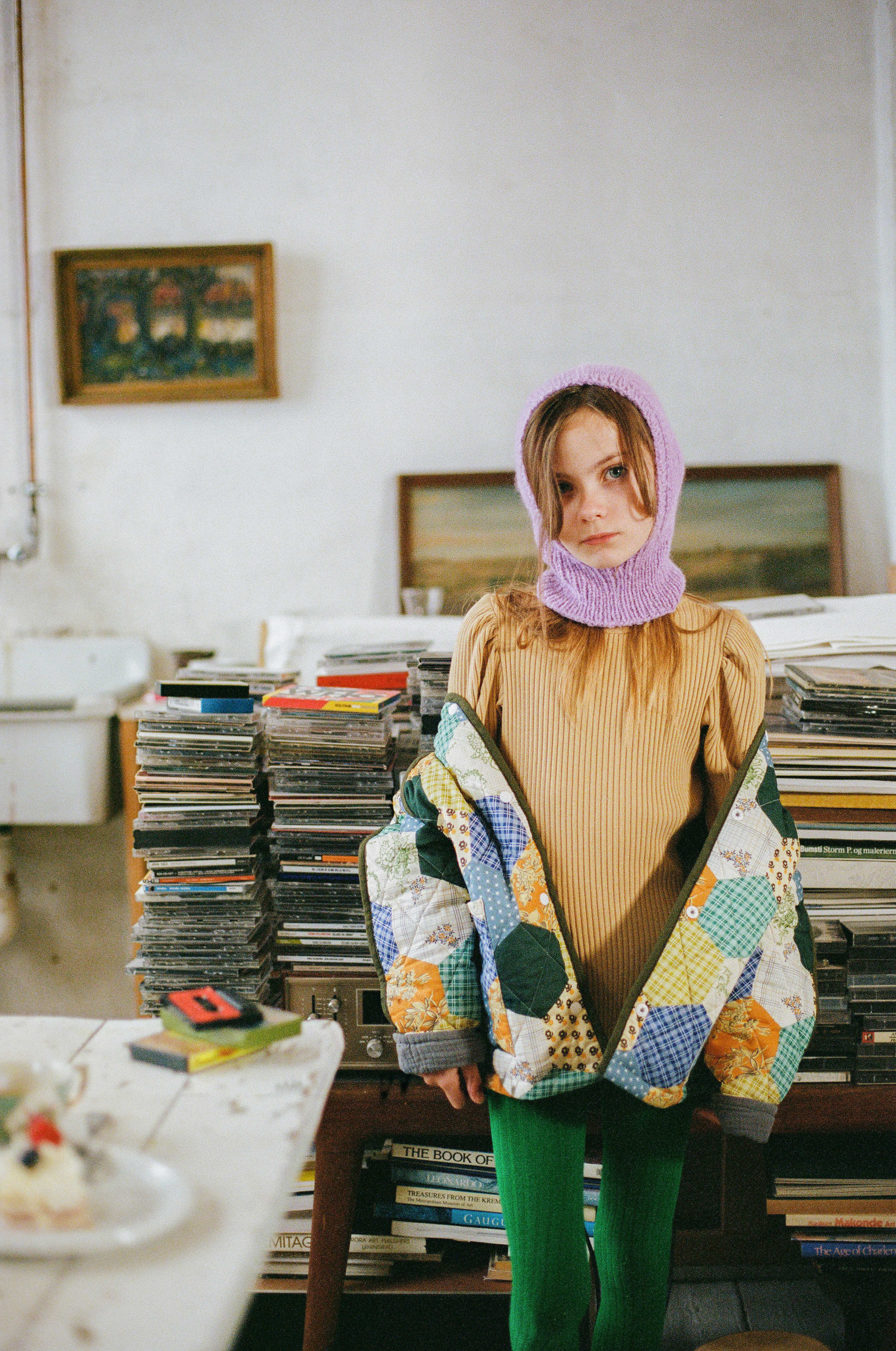 Lykke wears a patchwork jacket by Tambere, Liilu top and lilac balaclava from Deima Knitwear. Frigg wears overalls by Liilu, red top from Molo and knit from A Monday in Copenhagen. Josefine is wearing dress by Liilu, hat is vintage.