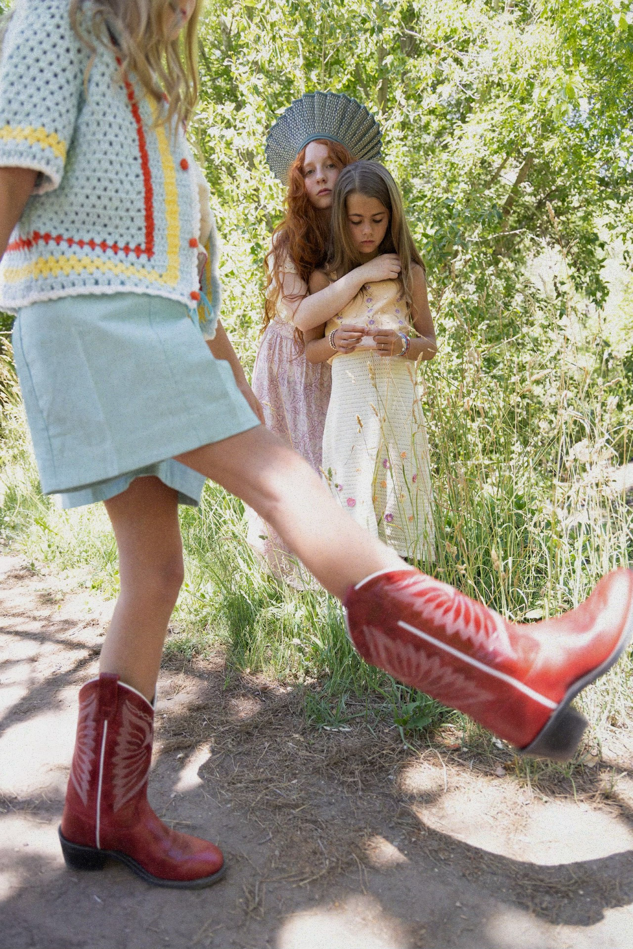 Bowe: Crochet Top and Shorts Tia Cibani, Tank Bebe Organic, Boots Bootstock