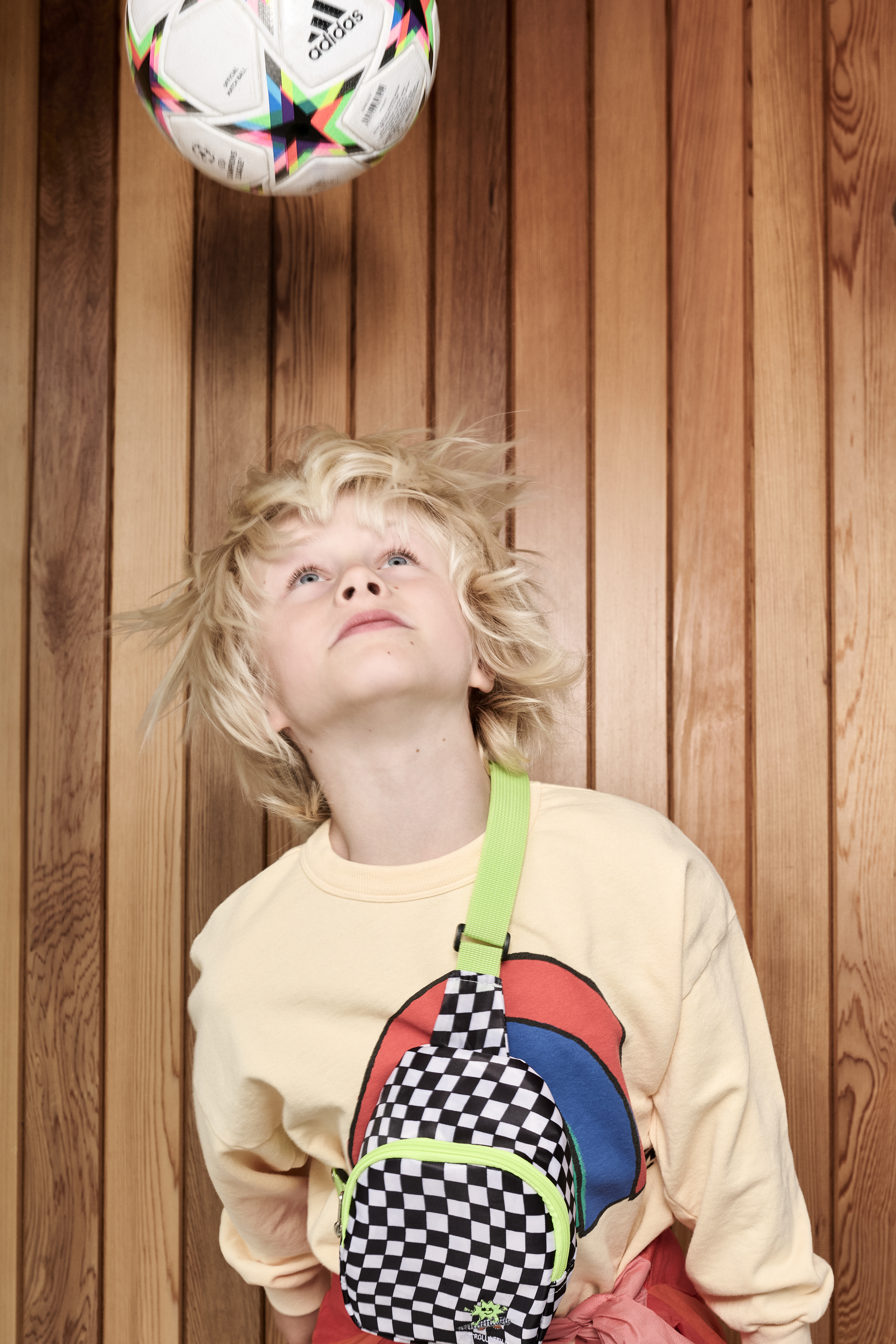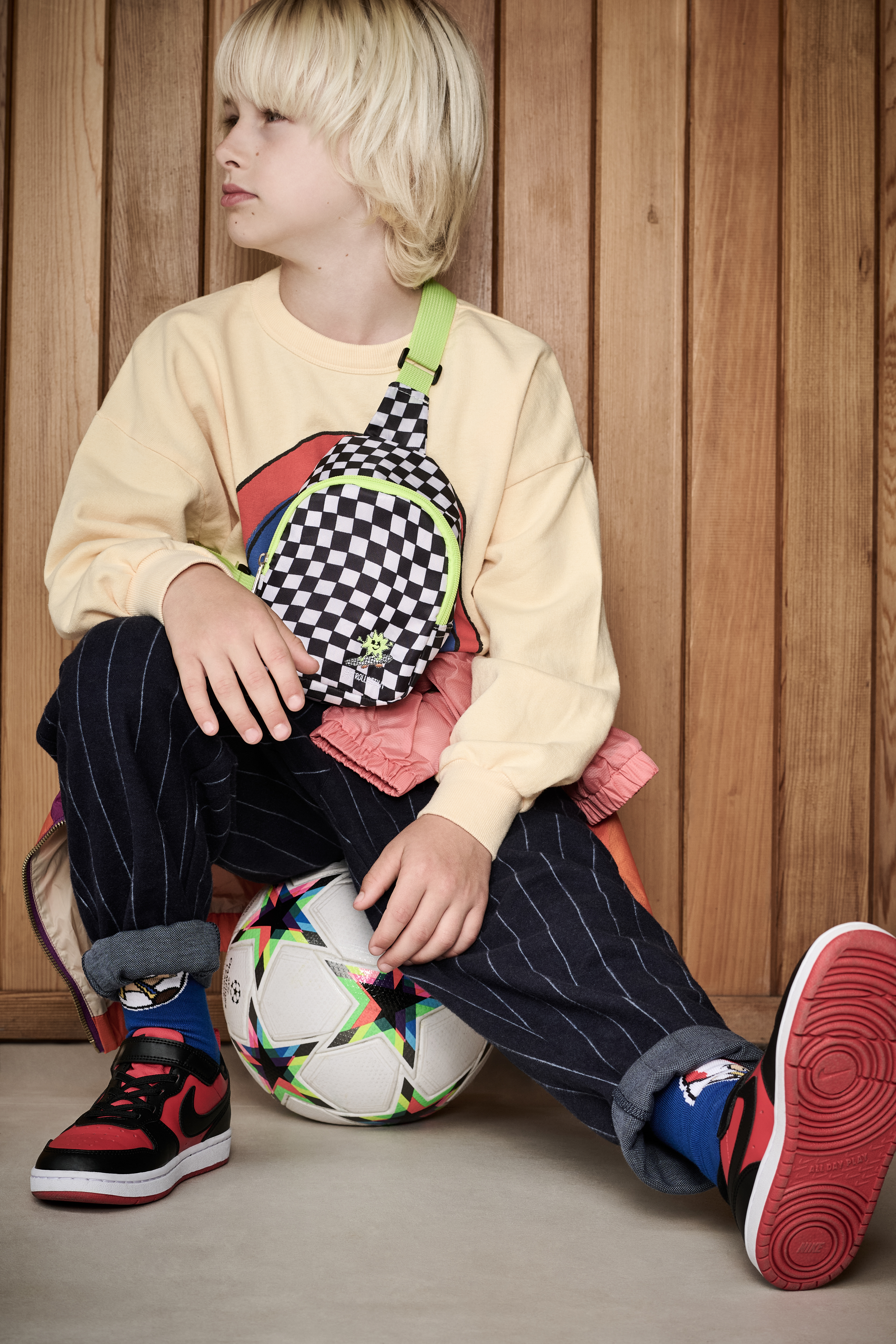 Sweatshirt, Bobo Choses. Jacket, (tied around waist) A Monday in Copenhagen. Checked skater bag, Monsoon Kids. Pinstripe trousers, Arket. Super Mario socks, sold in a pack of 5, SockShop. Nike hightop trainers, Deichmann