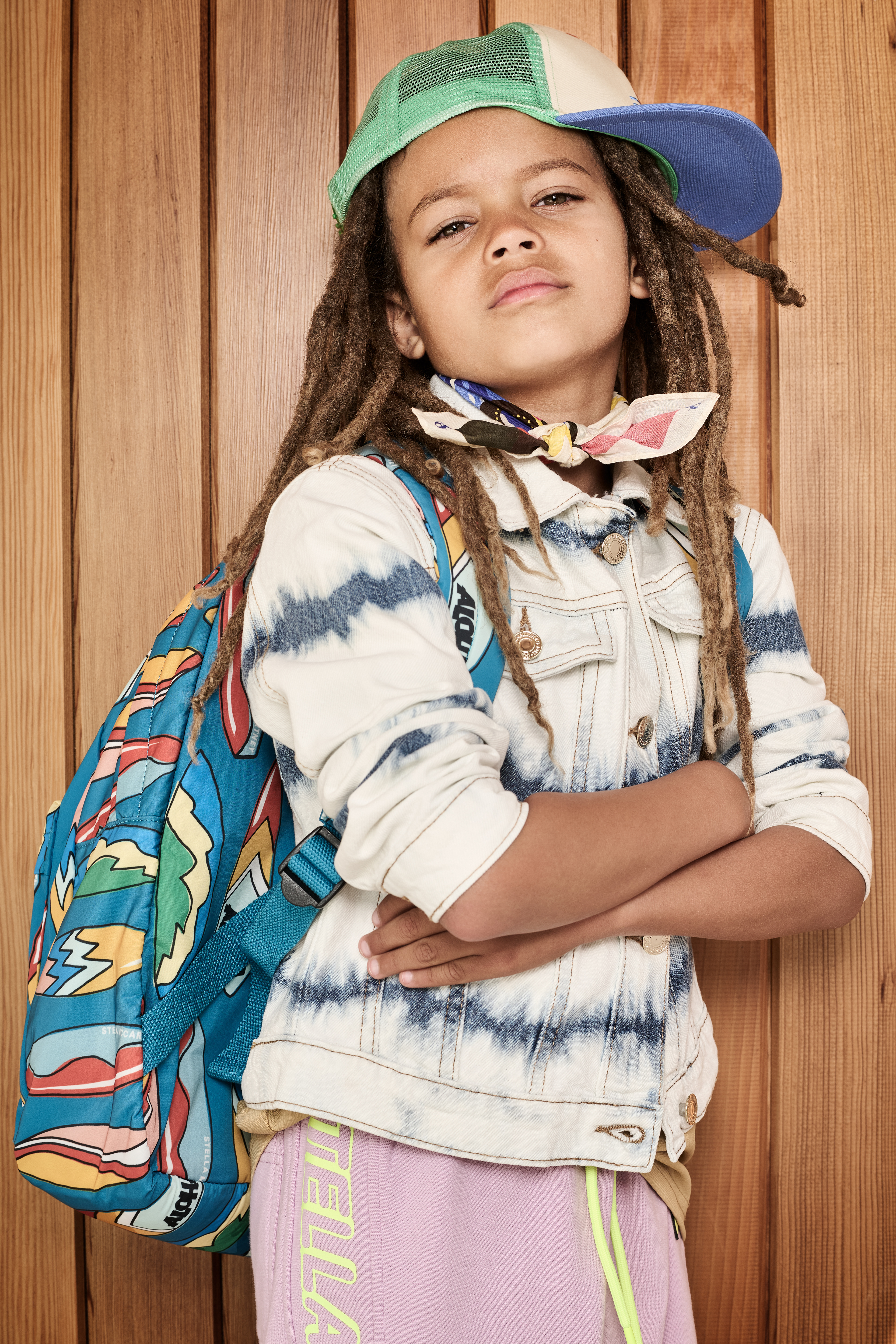 Cap, Monsoon Kids. Scarf, Scotch & Soda. Tie-dye denim jacket, Guess Kids. T-shirt, H&M. Pink joggers and backpack, both Stella McCartney Kids. Friendship Friday with Elmer patchworks socks, SockShop. Adidas trainers, Deichmann