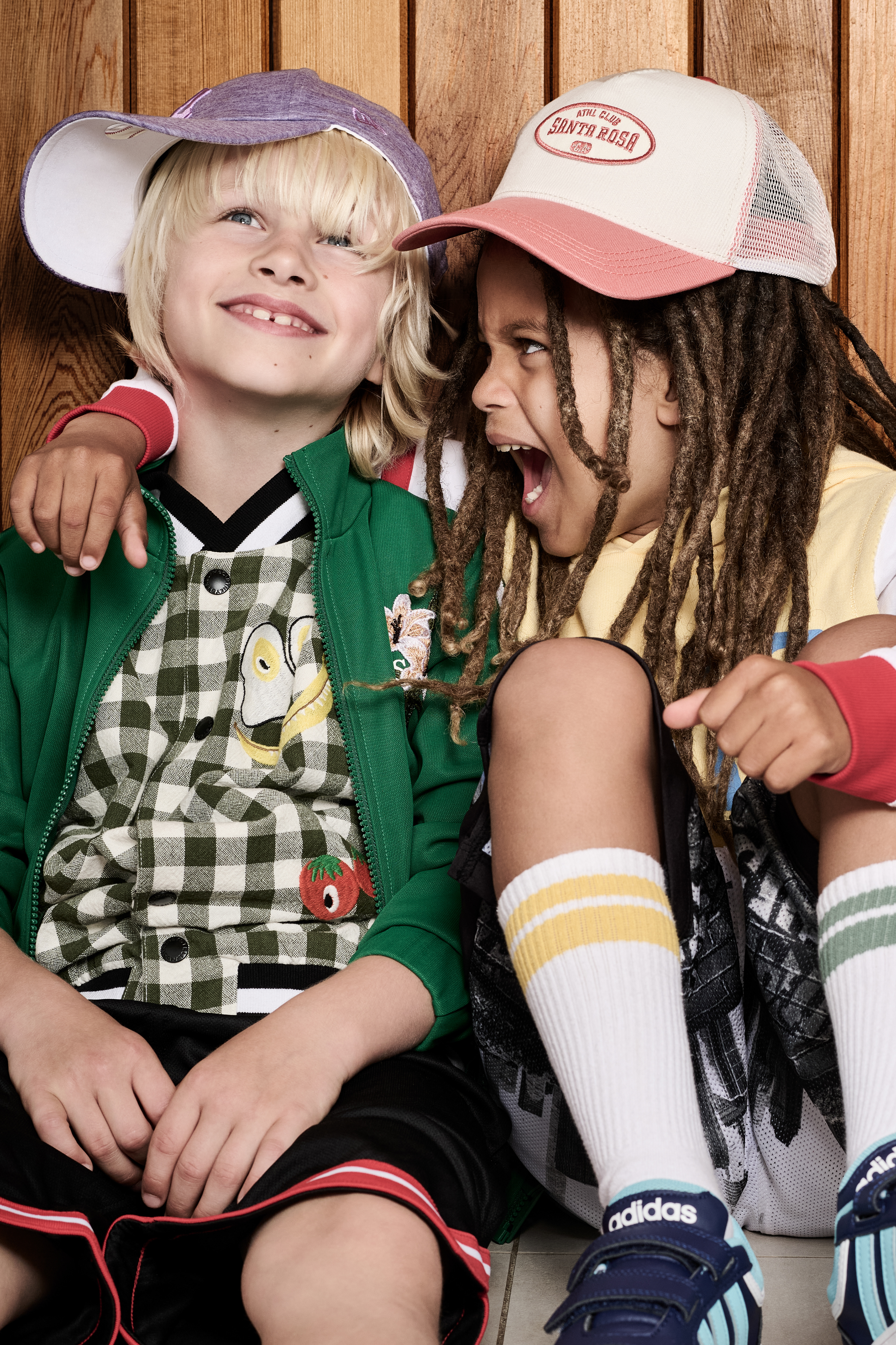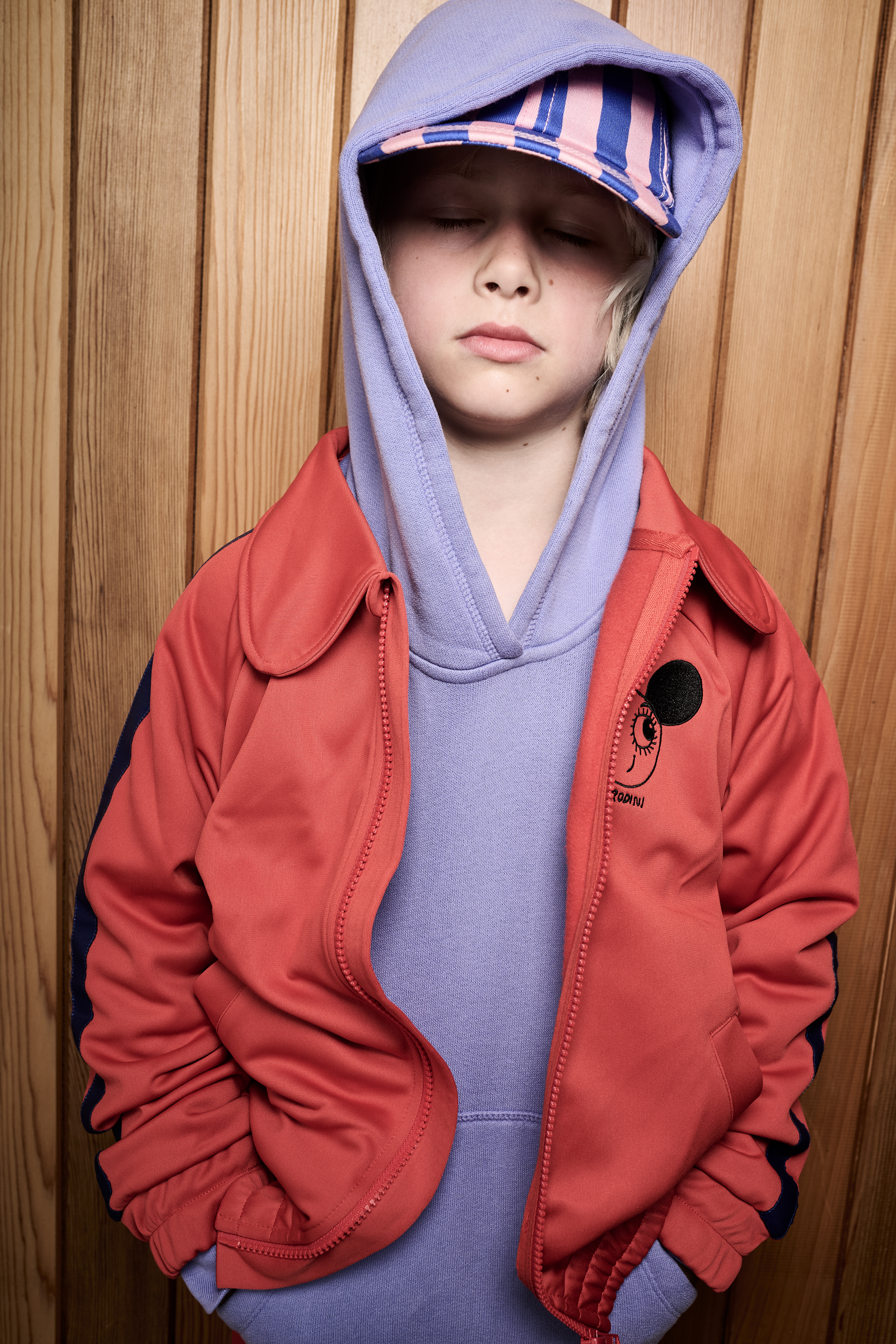 Hoodie, American Vintage. Tracksuit jacket and matching joggers, both Mini Rodini. Striped cap, Arket. Hightop trainers, Vans