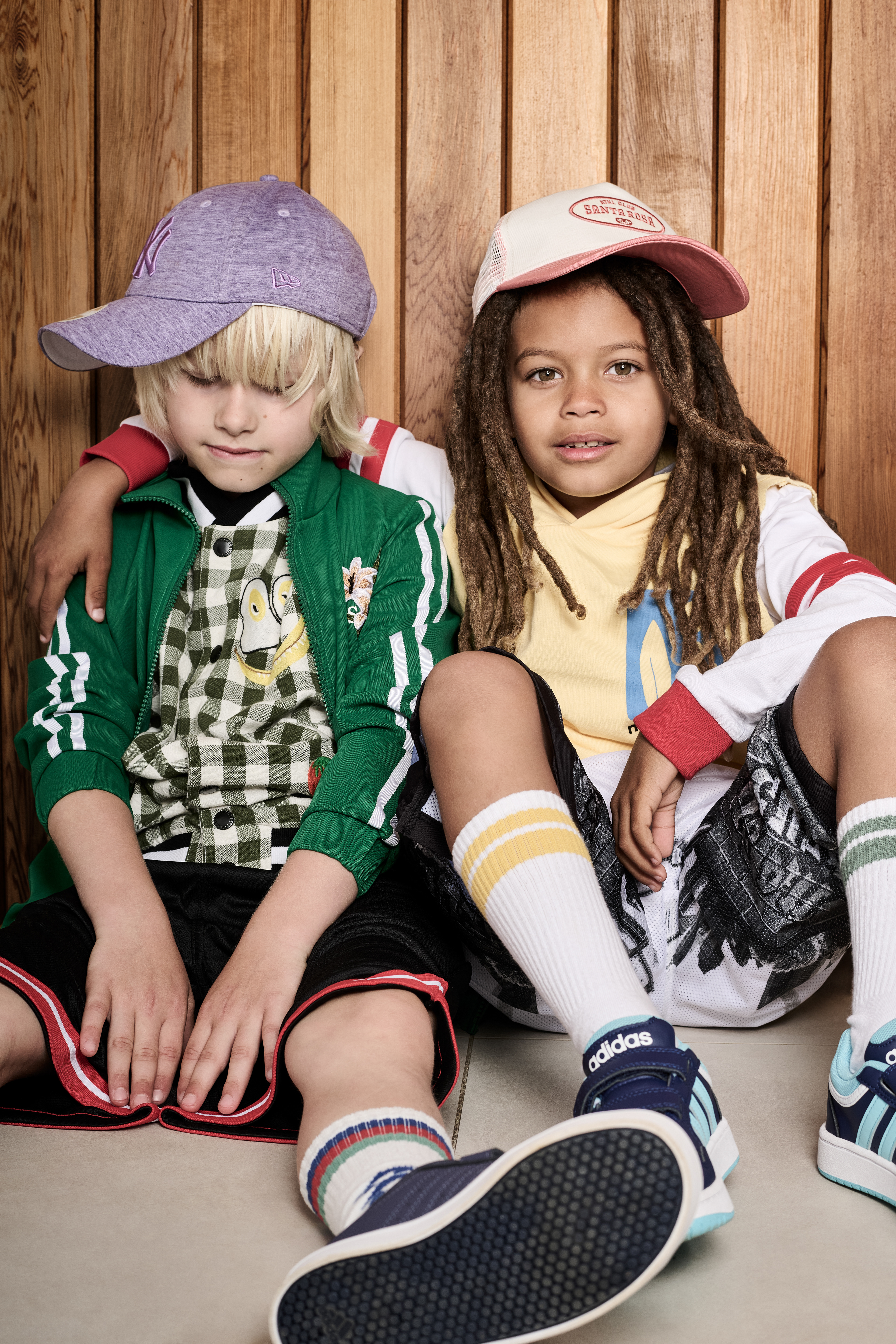 Lilac cap, New Era. Green tracksuit jacket, Guess Kids. Shorts, H&M. Socks, Bobo Choses. Adidas trainers, Deichmann
