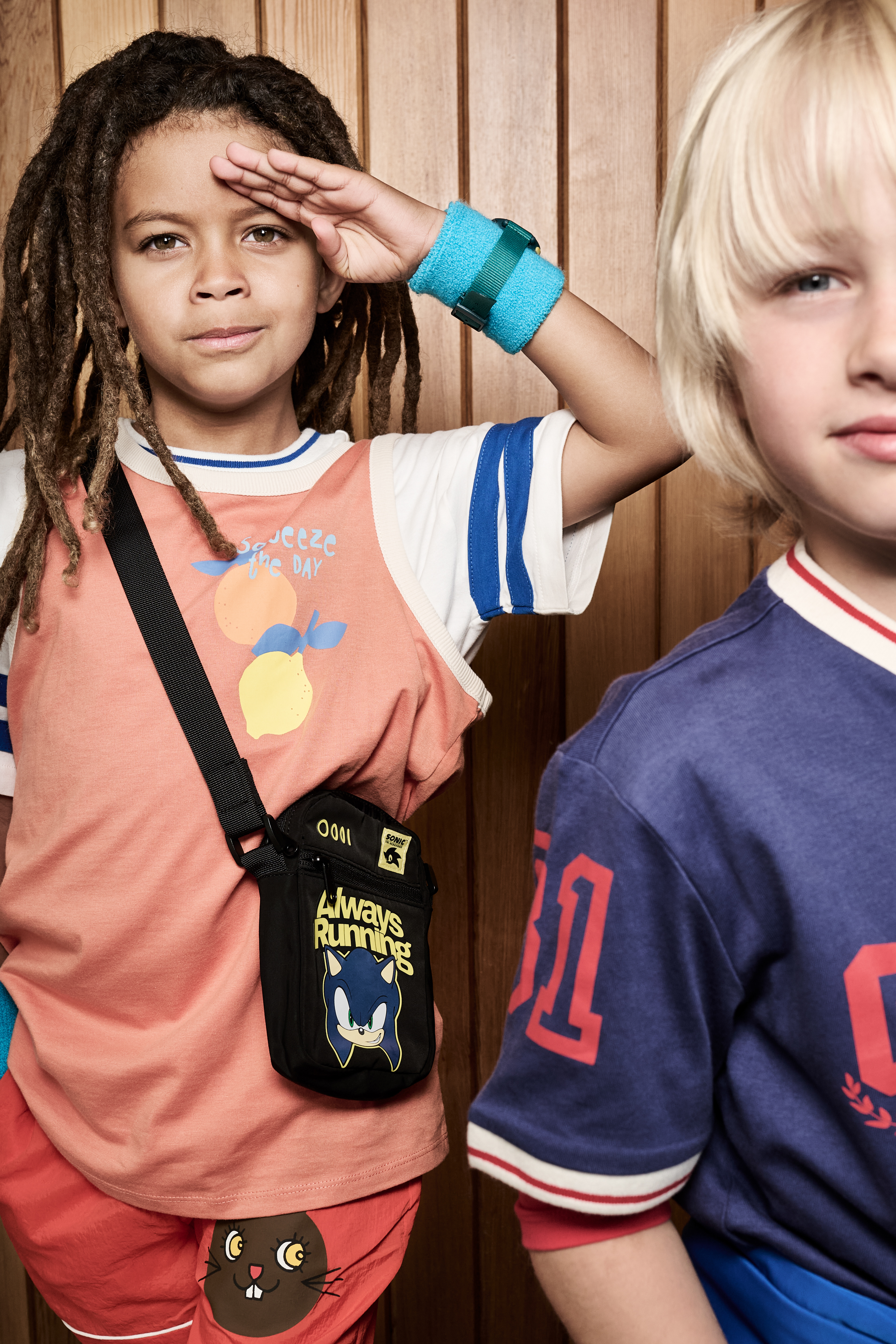 Orange vest, part of 2-piece set, H&M. White t-shirt, Guess Kids. Sonic Hedgehog crossbody bag, H&M. Sweatbands, H&M. Digital watch, Djeco. Nylon joggers, Mini Rodini.