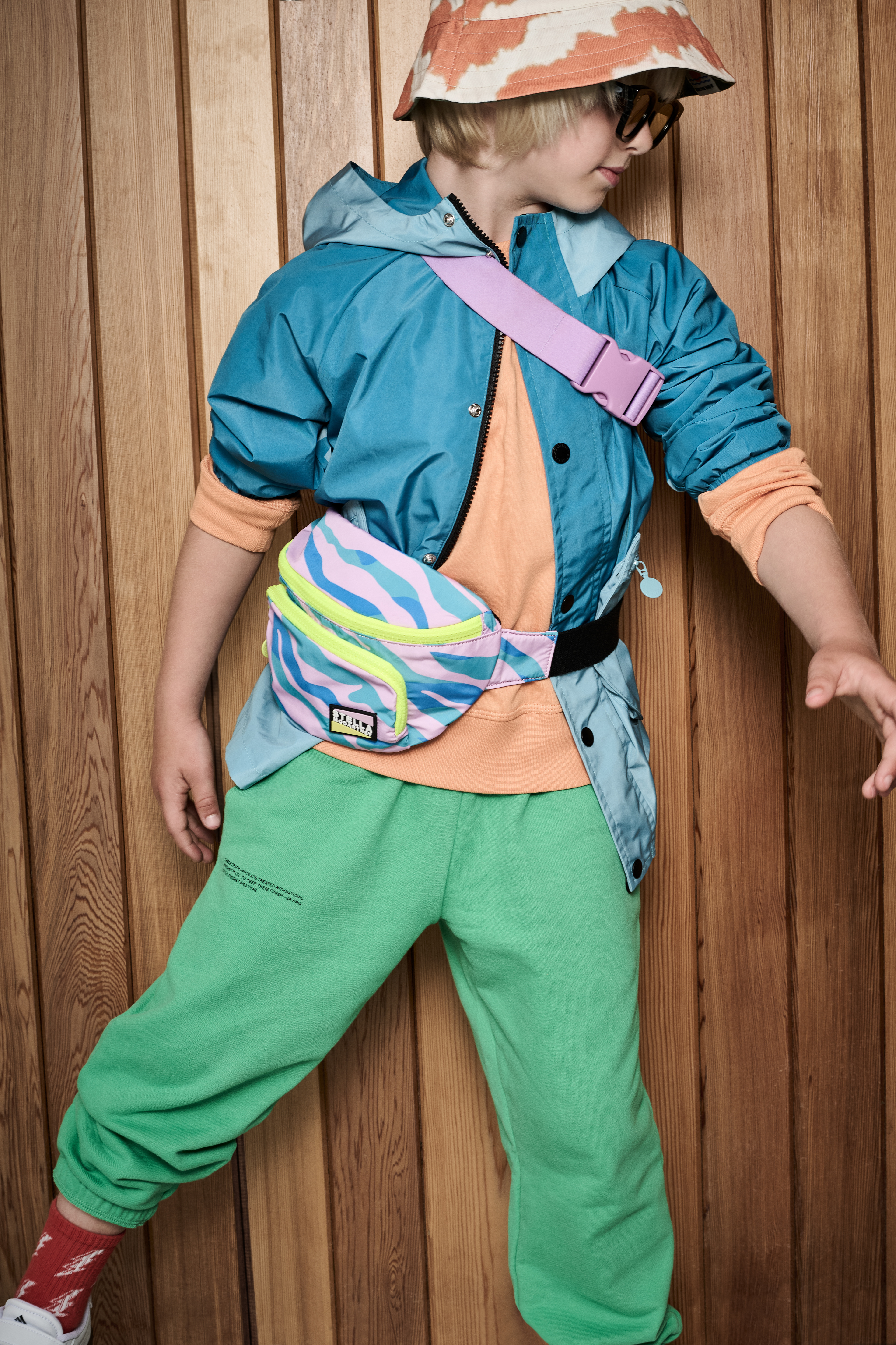 Tie-dye hat, Monsoon Kids. Sunglasses, AKILA Kids. Hoodie jacket, and bumbag, both Stella Kids. Lilac belt, stylist's own. Orange sweatshirt, Arket. Green joggers, Pangaia. Socks, TK Maxx. Adidas trainers, Deichmann