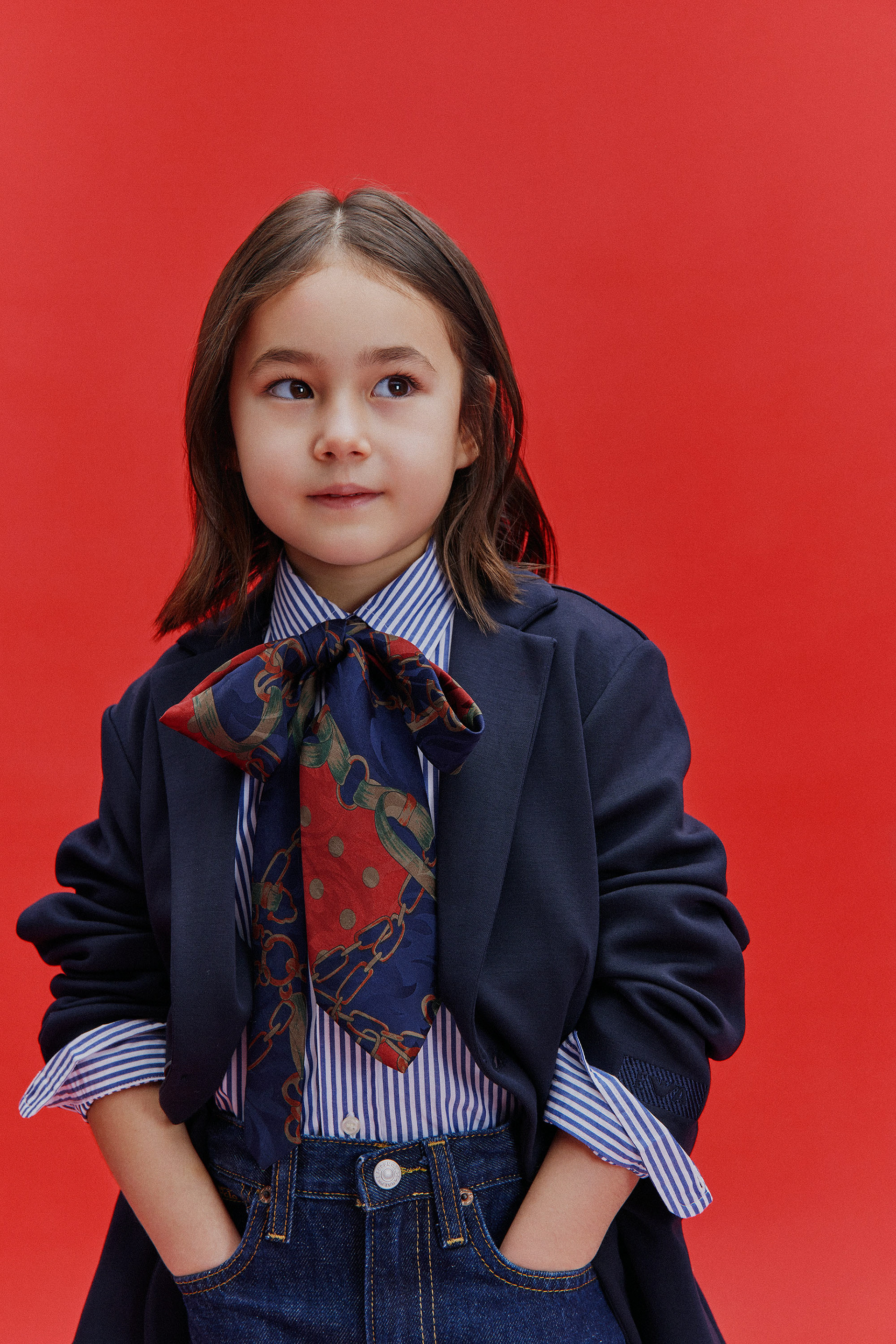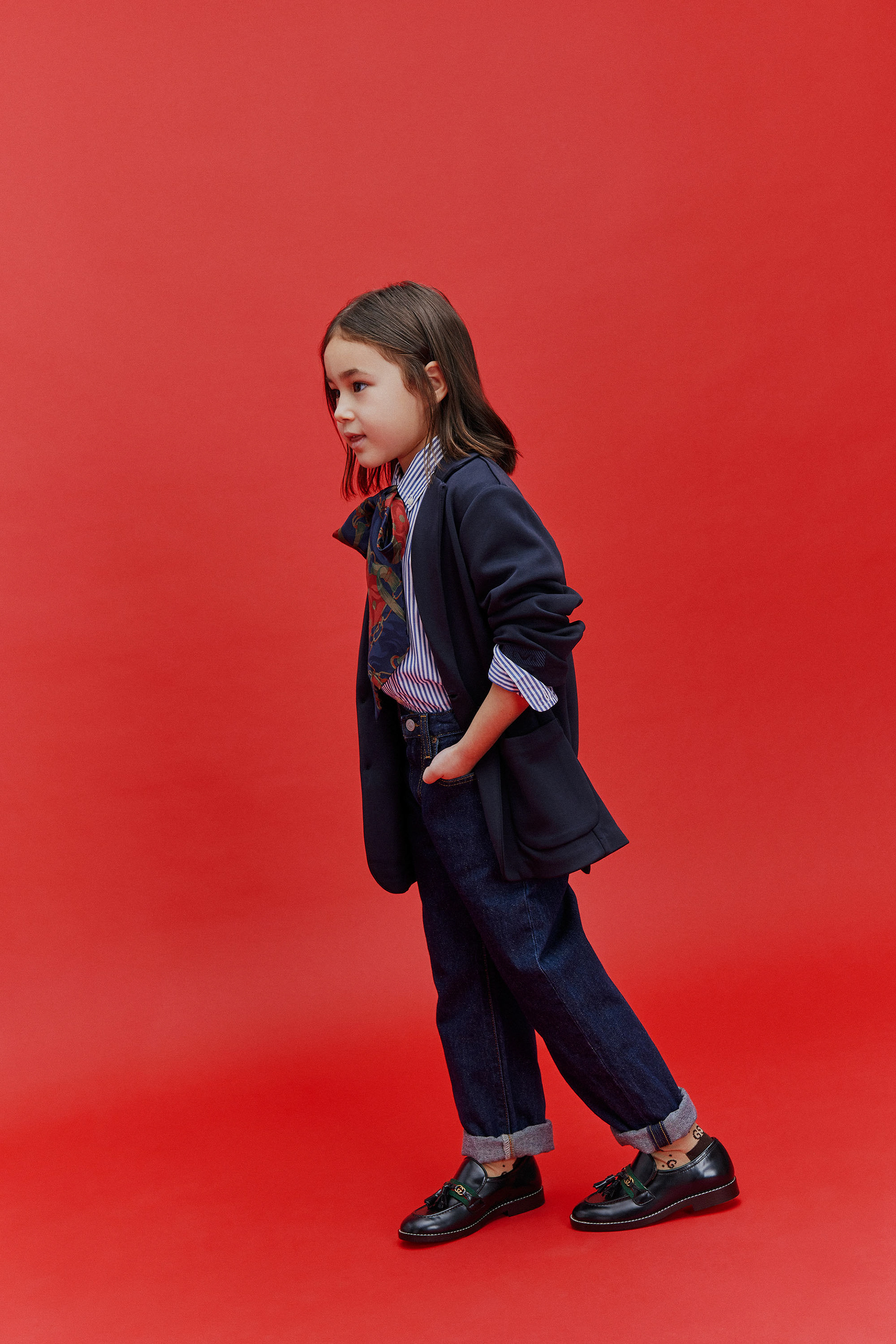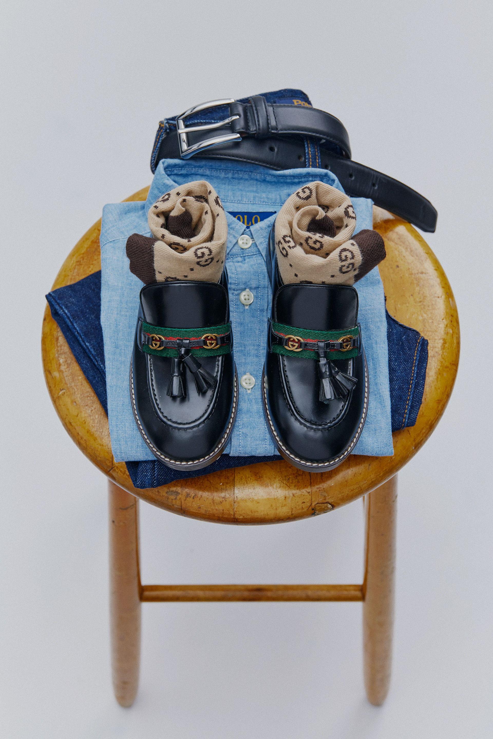 Aimée: Suit Jacket: Emporio Armani, Shirt: Polo Ralph Lauren, Jeans: Polo Ralph Lauren, Silk Tie: Vintage via Humana, Socks: Gucci, Loafers: Gucci