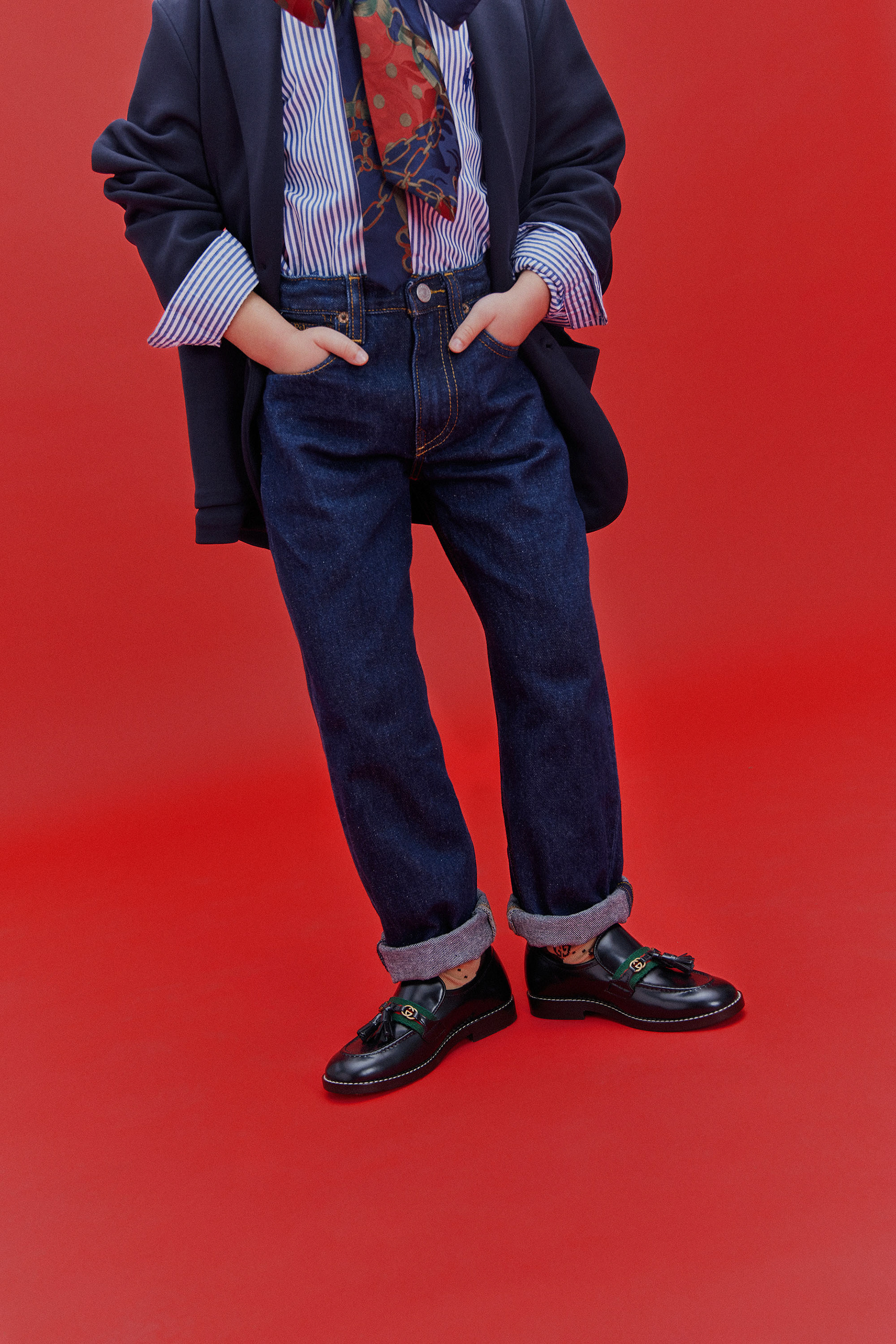 Aimée: Suit Jacket: Emporio Armani, Shirt: Polo Ralph Lauren, Jeans: Polo Ralph Lauren, Silk tie: Vintage via Humana, Socks: Gucci , Loafers: Gucci