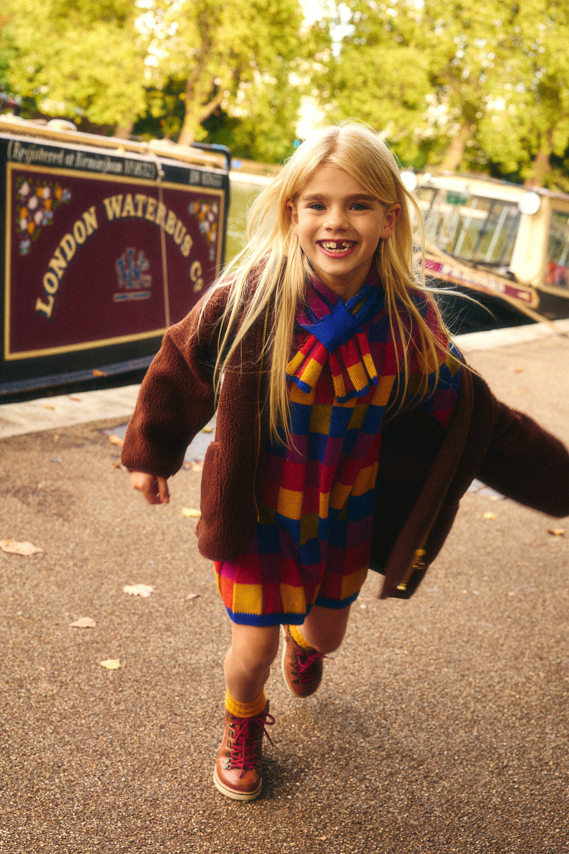 Lyra: Dress, Sweater, Scarf- Mabli, Jacket- Mini Rodini, Boots- Young Soles, Socks- La Coqueta