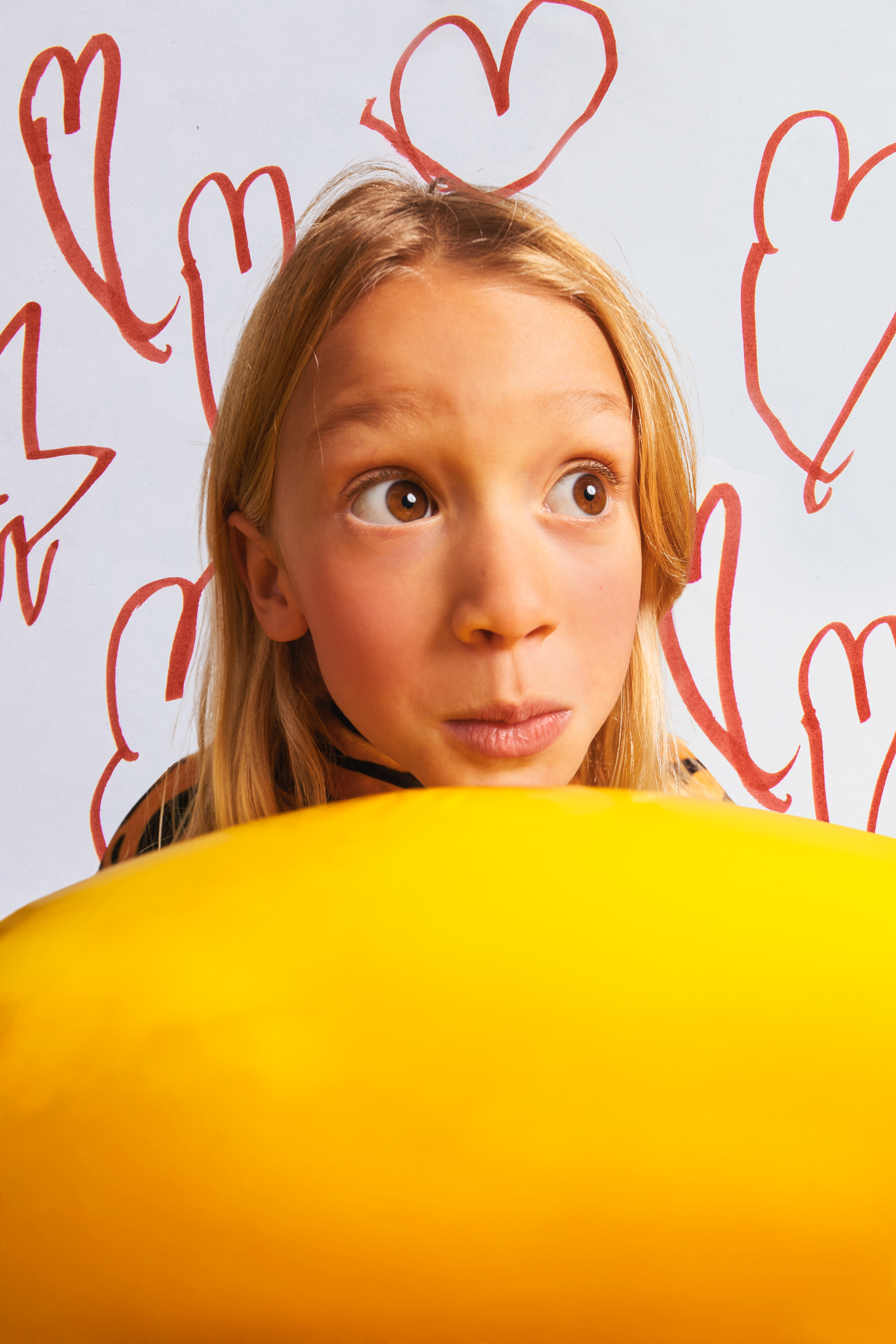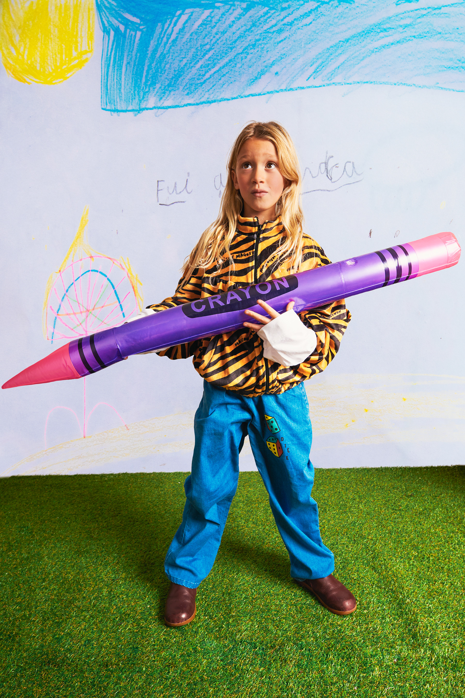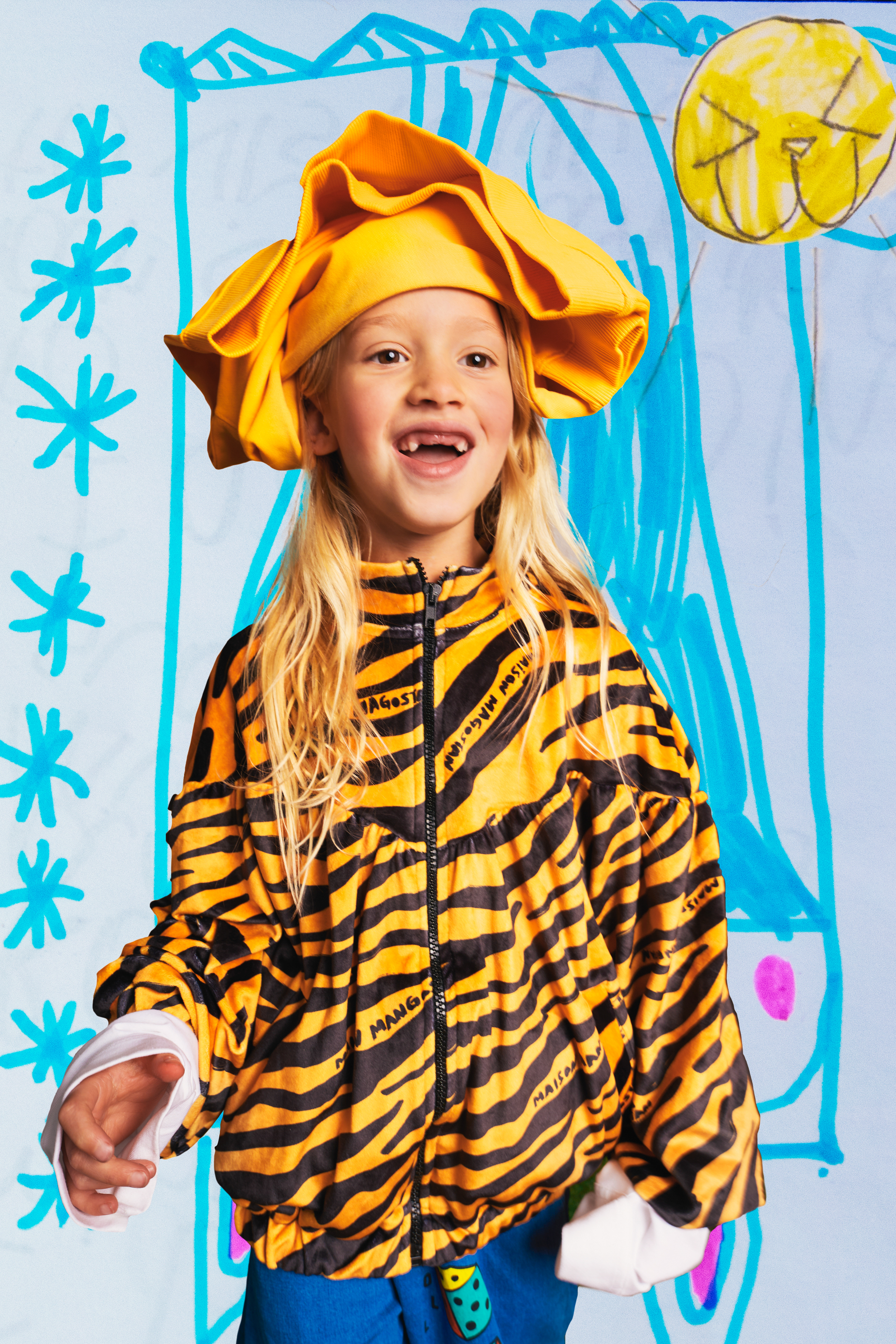 Una: tiger print velvet zip jacket by Maison Mangostan, roll the dice light denim pants by Bobo Choses, yellow sweater (worn on head) by Polarn O. Pyret