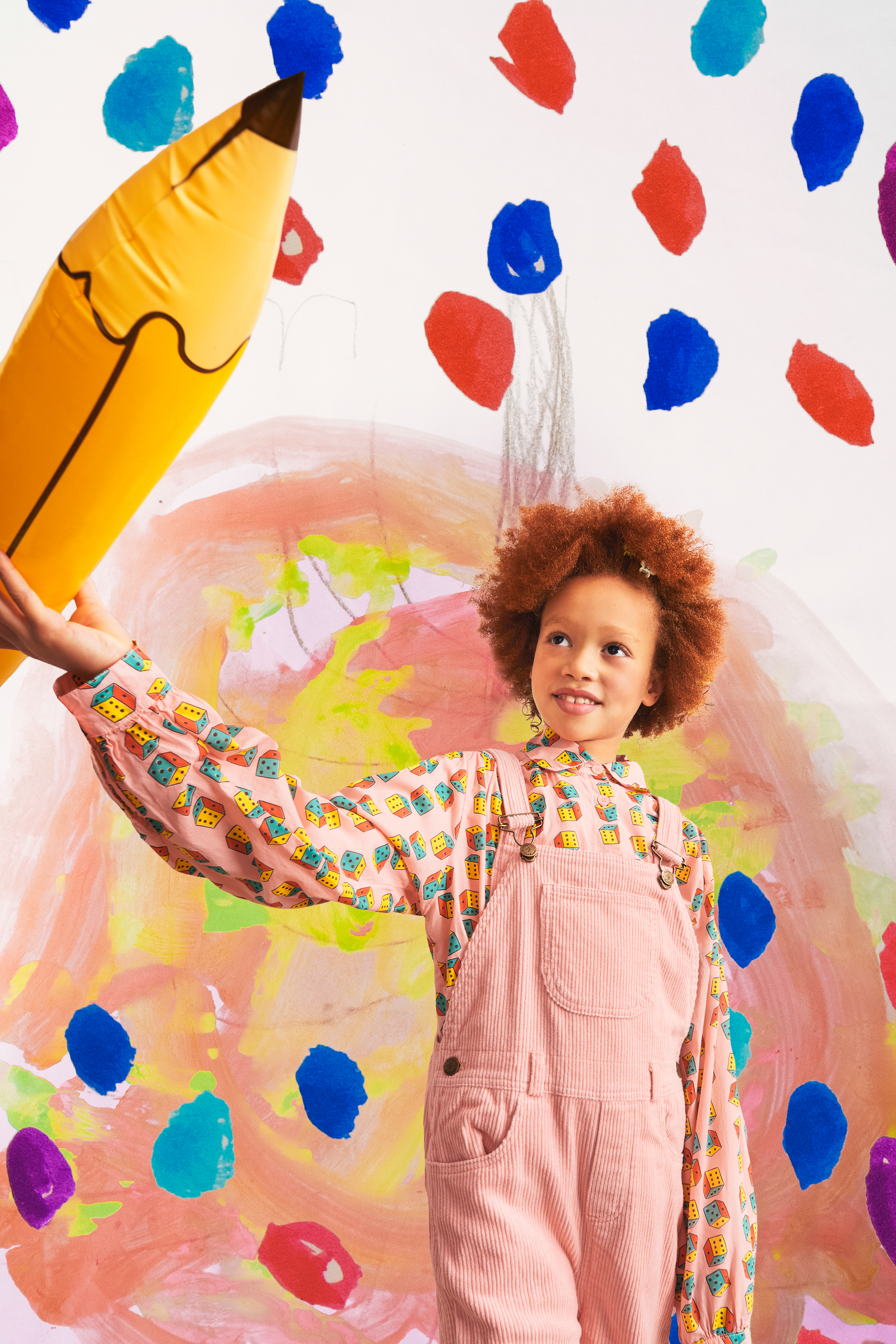 Marley: pink cord dungarees by Dotty Dungarees, dice print blouse by Bobo Choses