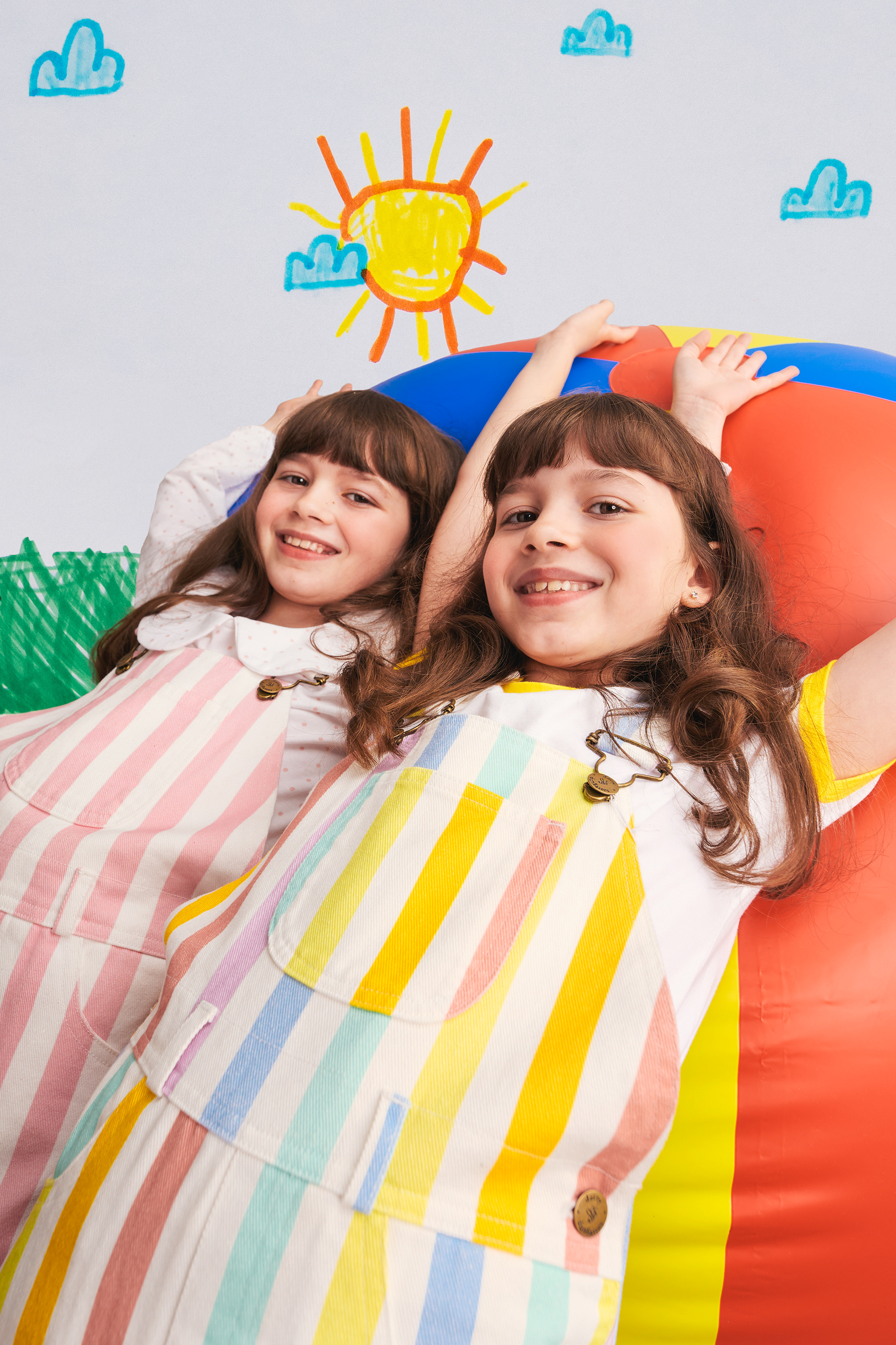 Evelyn: colored striped dungarees and T-shirt with yellow trim by Dotty Dungarees