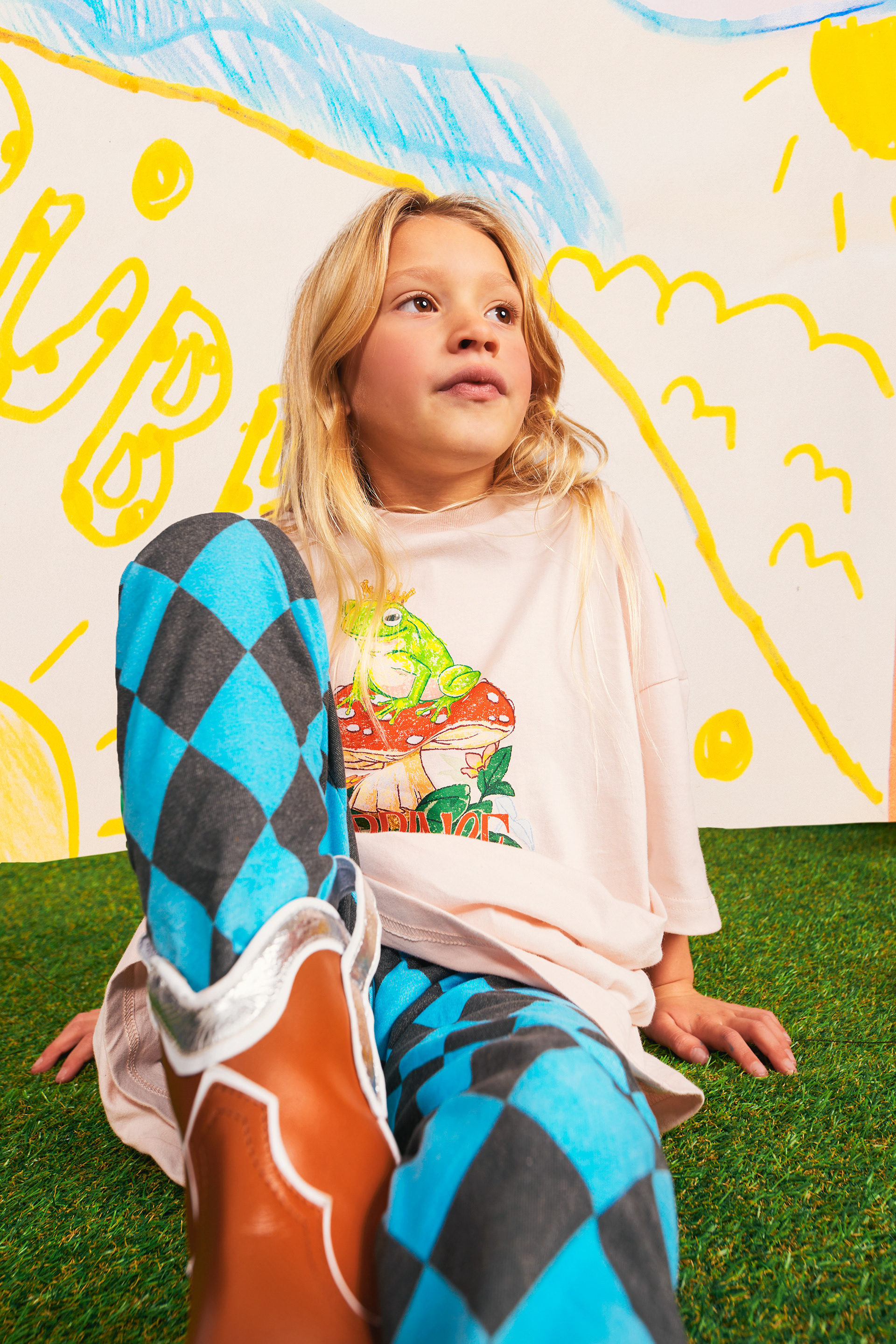 Una: blush ‘no prince needed’ T-shirt, harlequin leggings, cowboy boots all by Maison Mangostan