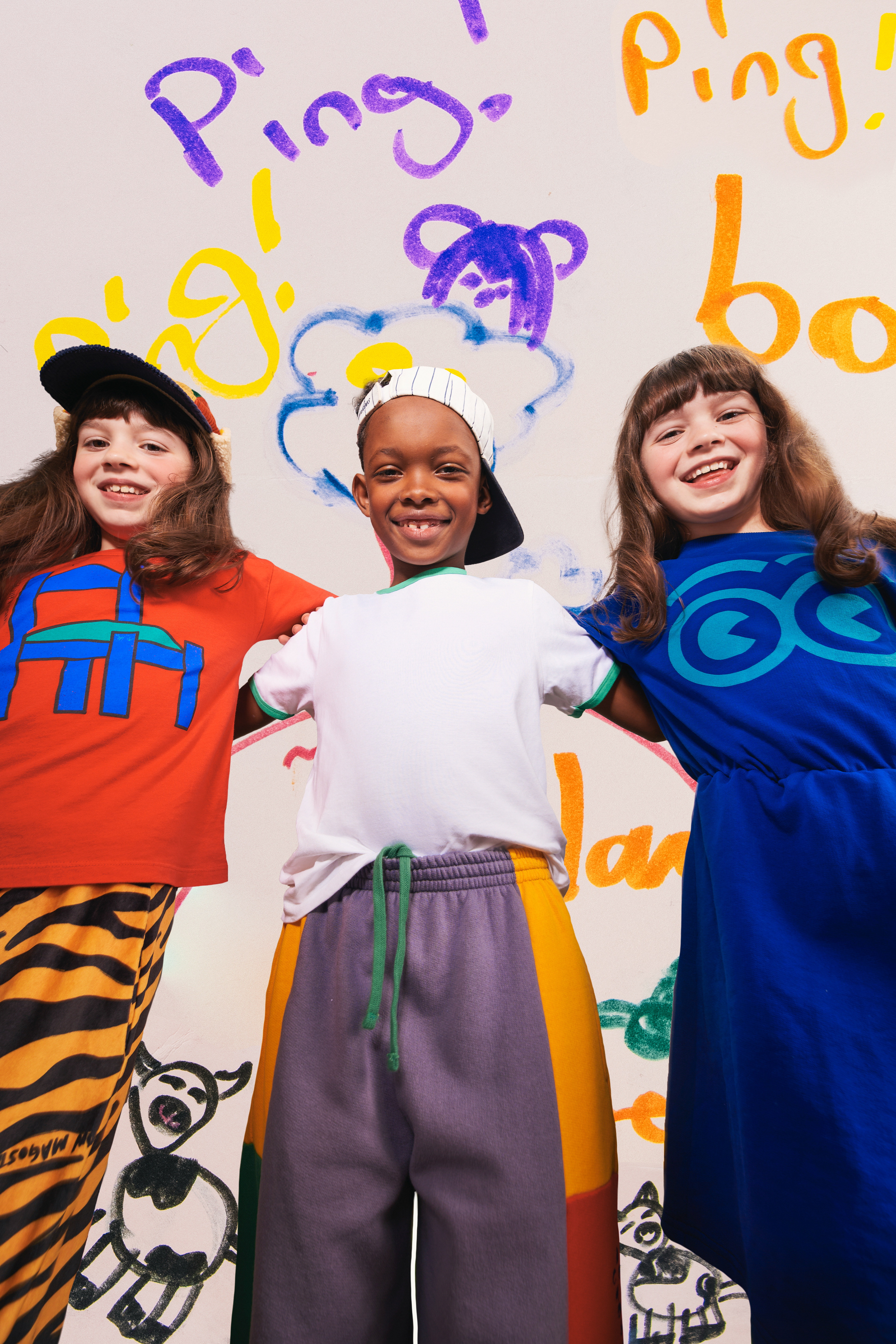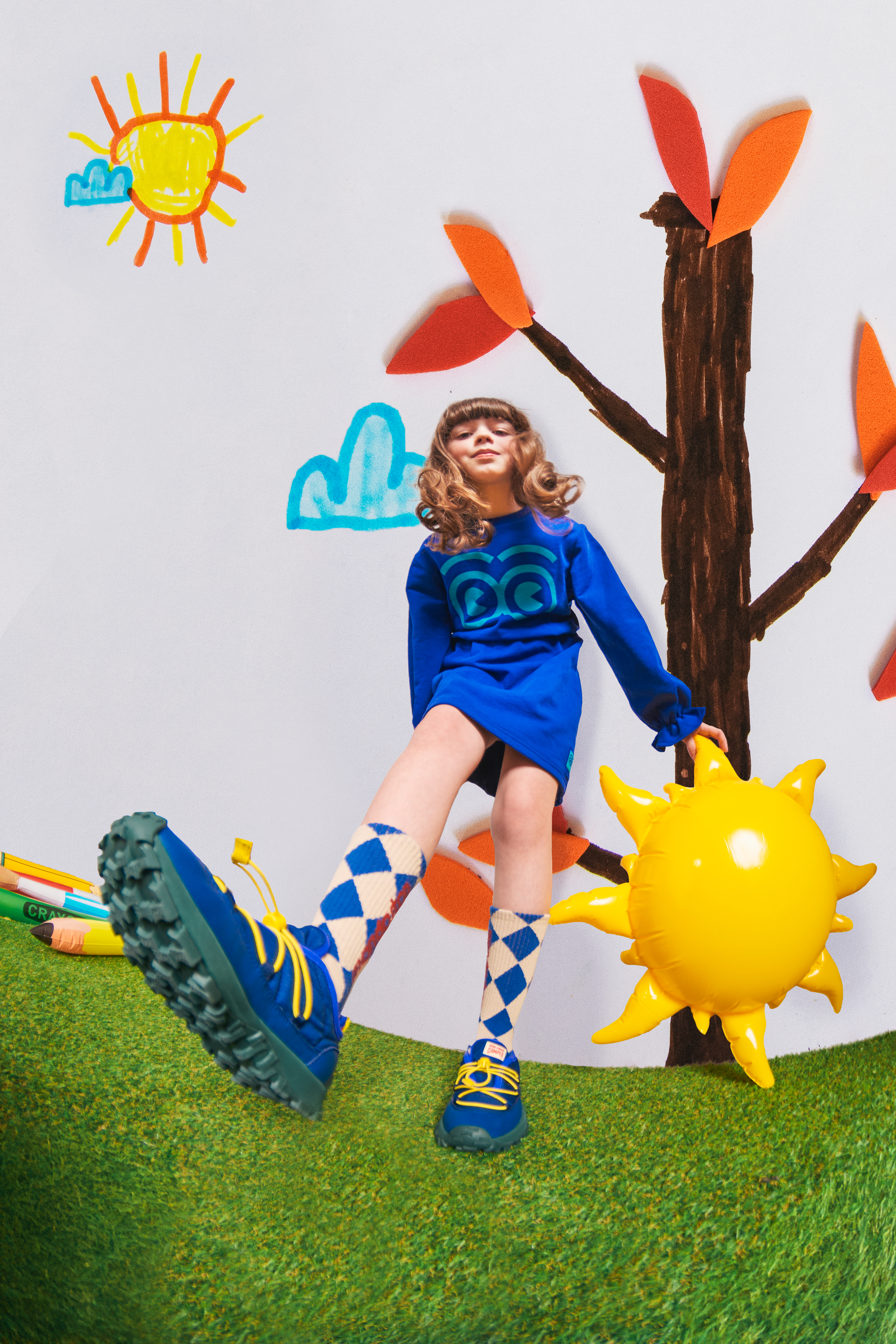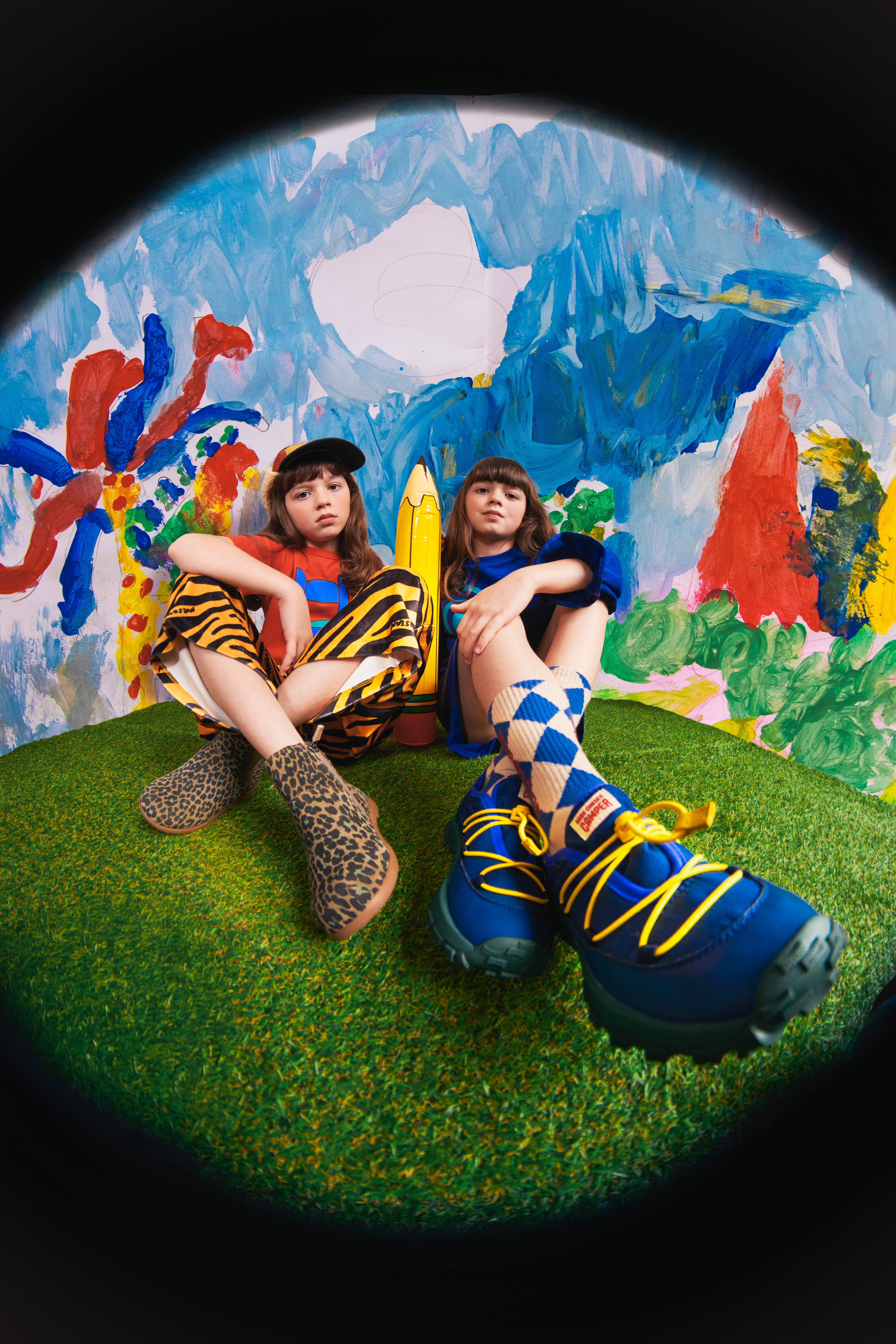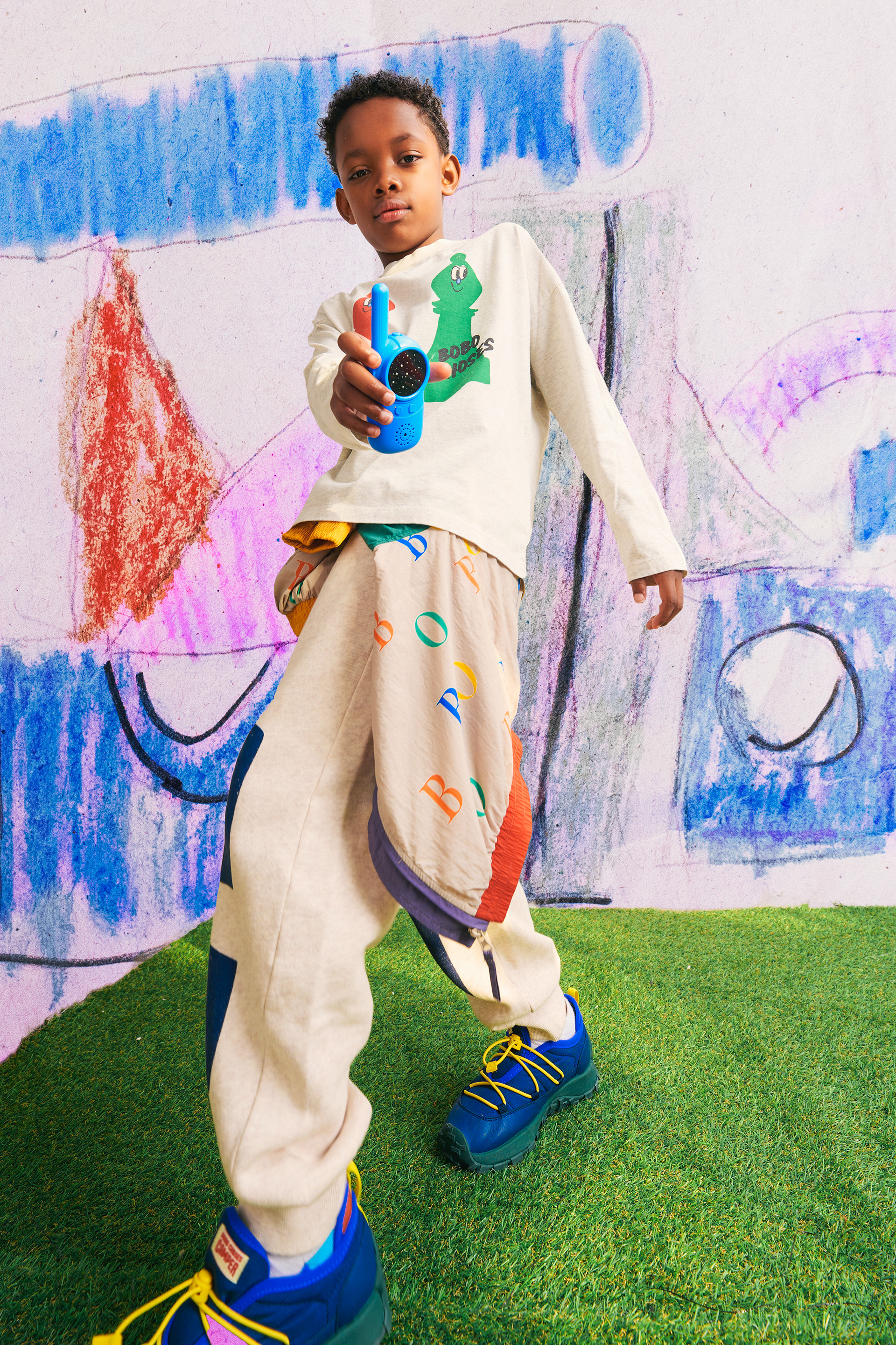 Mason: checkmate T-shirt, BC jogging pants and multicolour tracksuit jacket (tied around waist) by Bobo Choses, shoes by Bobo Choses x Camper