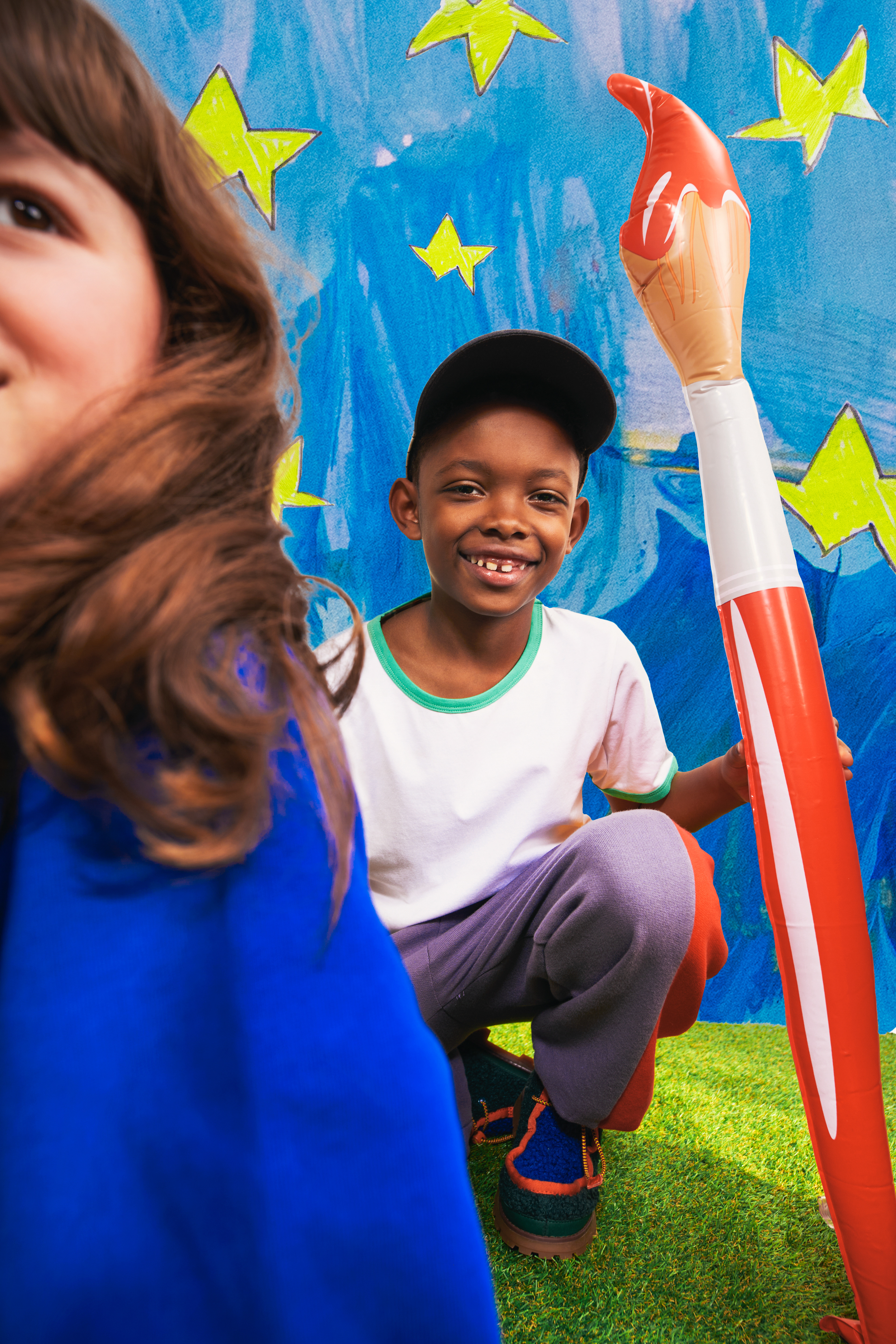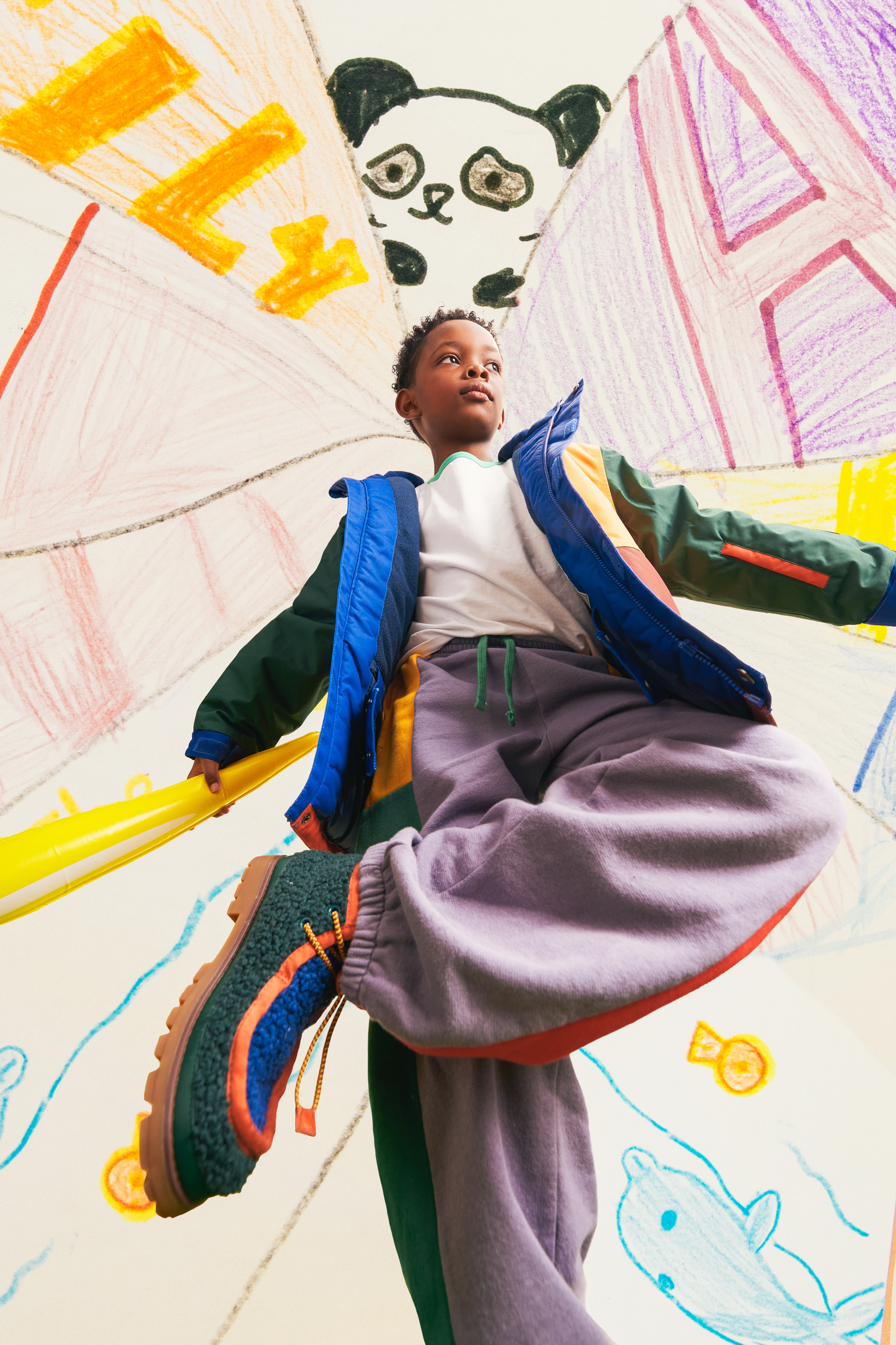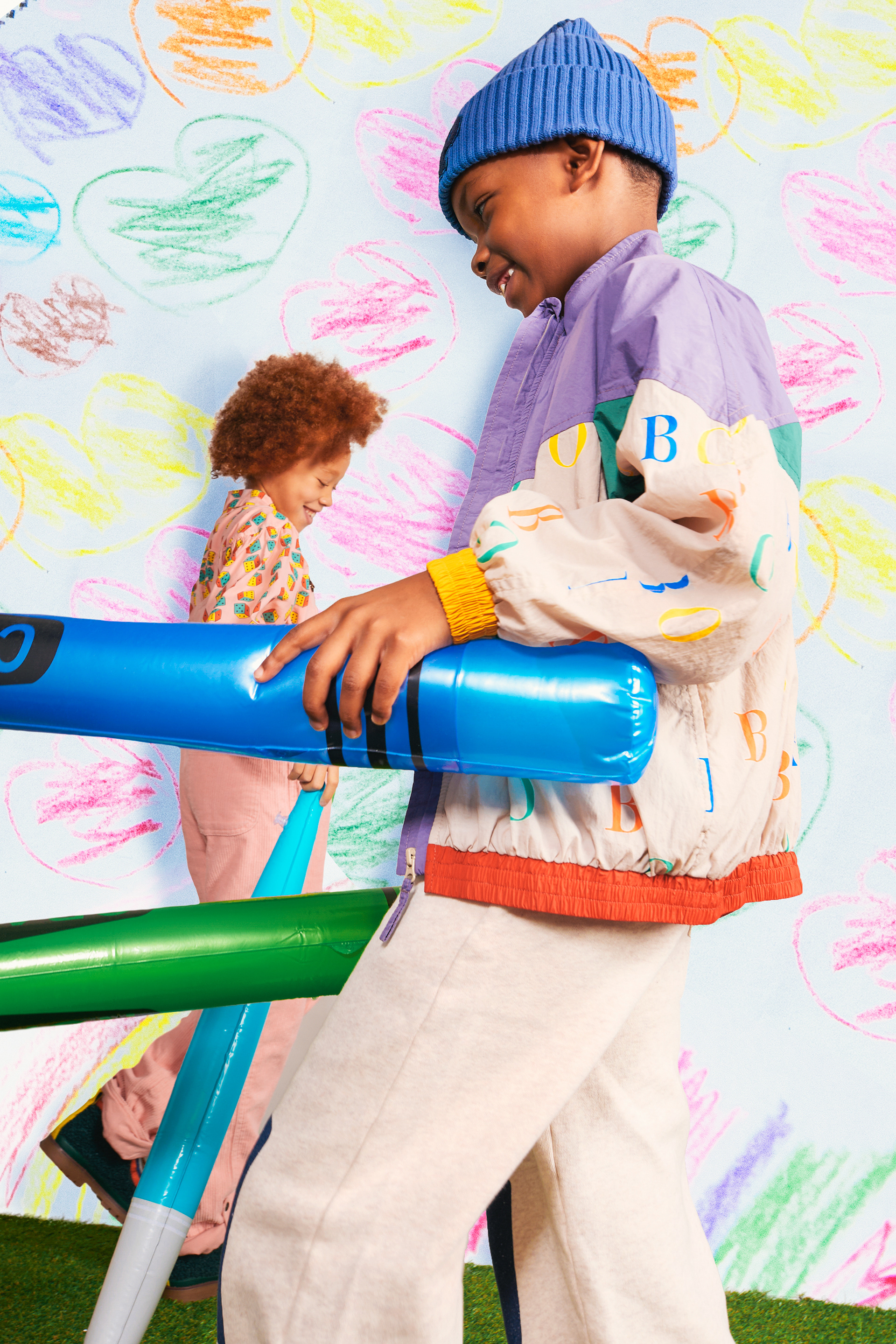 Mason: T-shirt with green trim by Dotty Dungarees, color block jogging pants and jacket by Bobo Choses, shoes by Bobo Choses x Camper