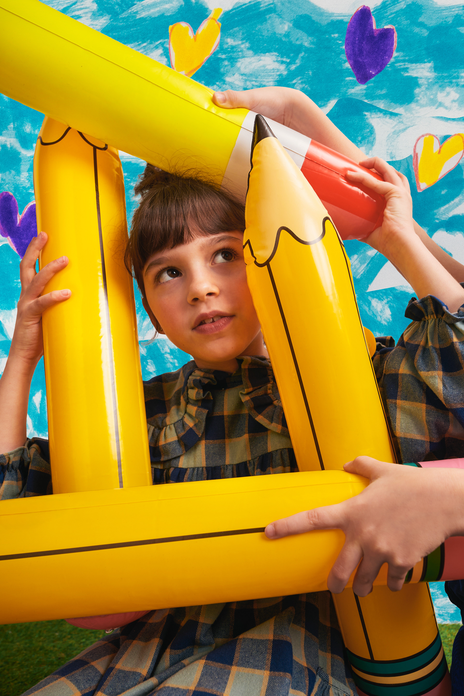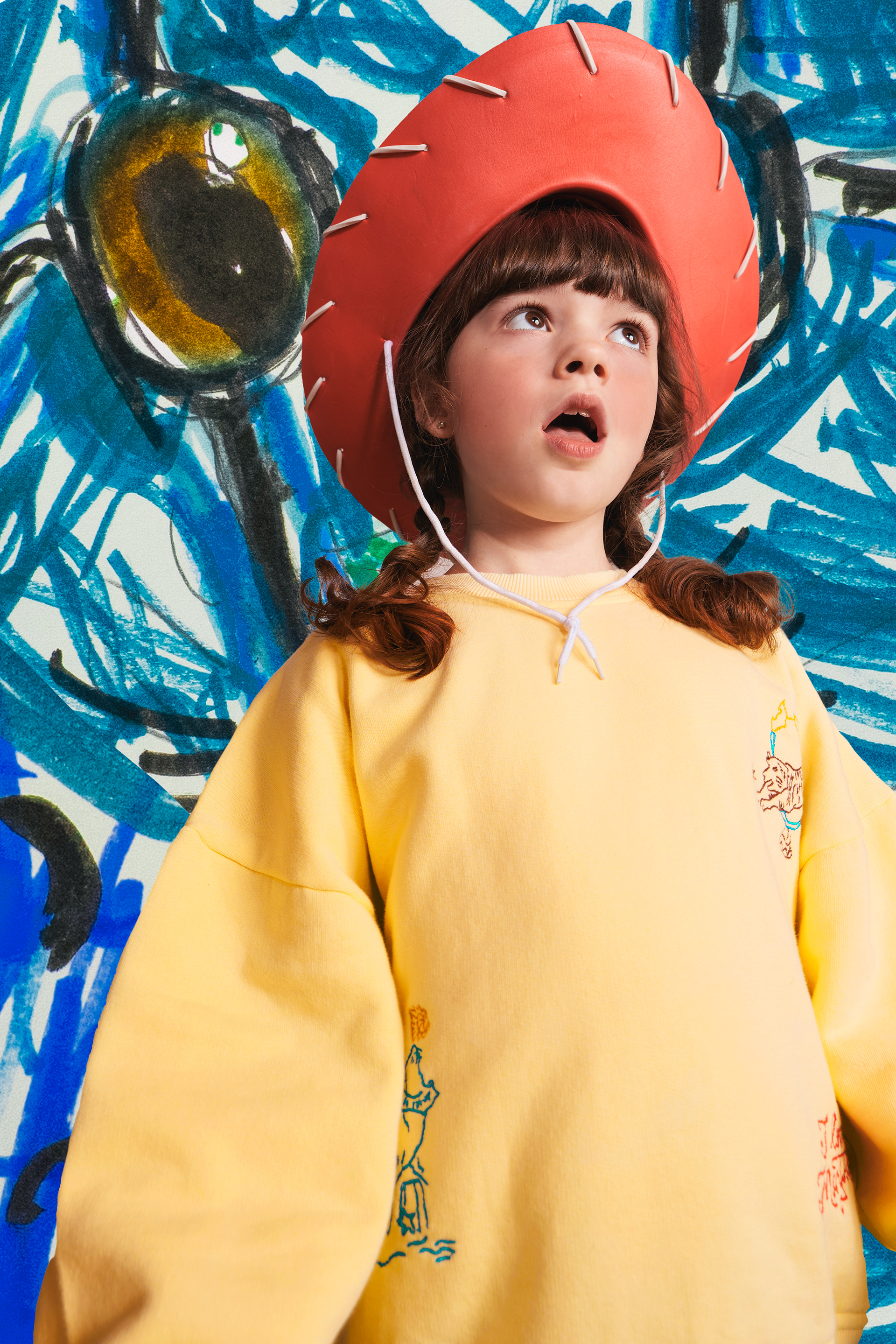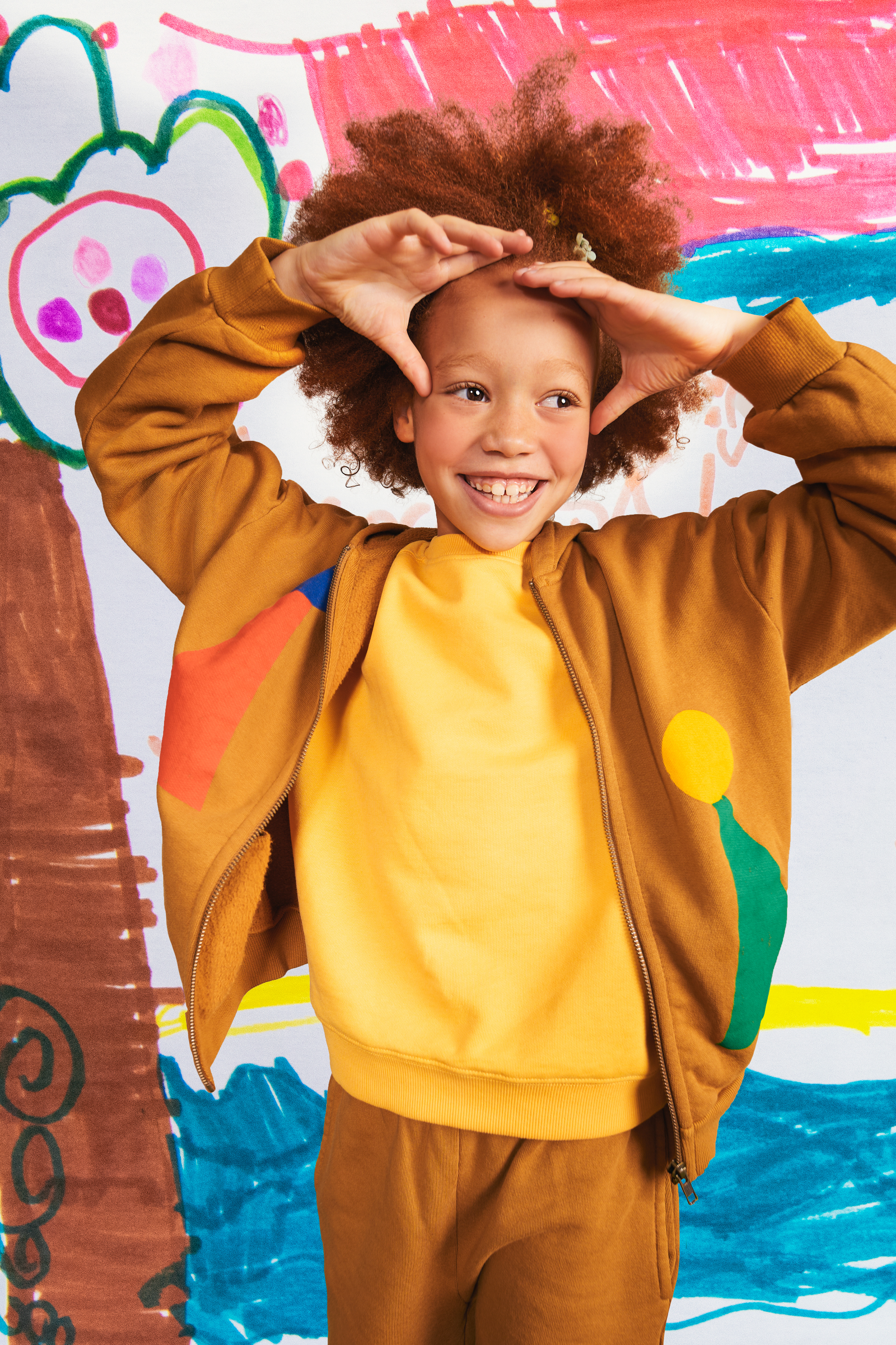 Marley: chess hoodie and matching joggers by Bobo Choses, yellow sweater by Polarn O. Pyret