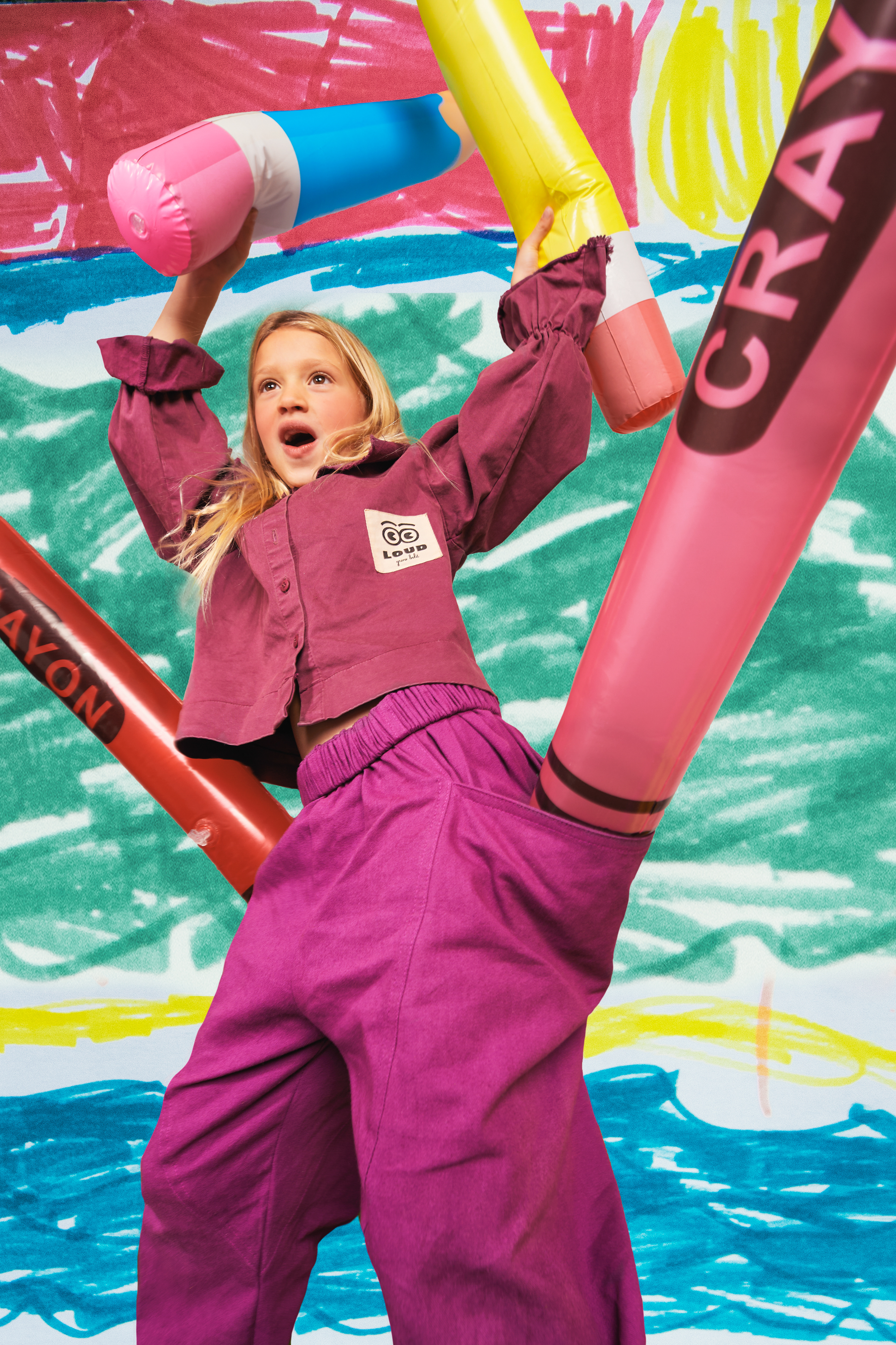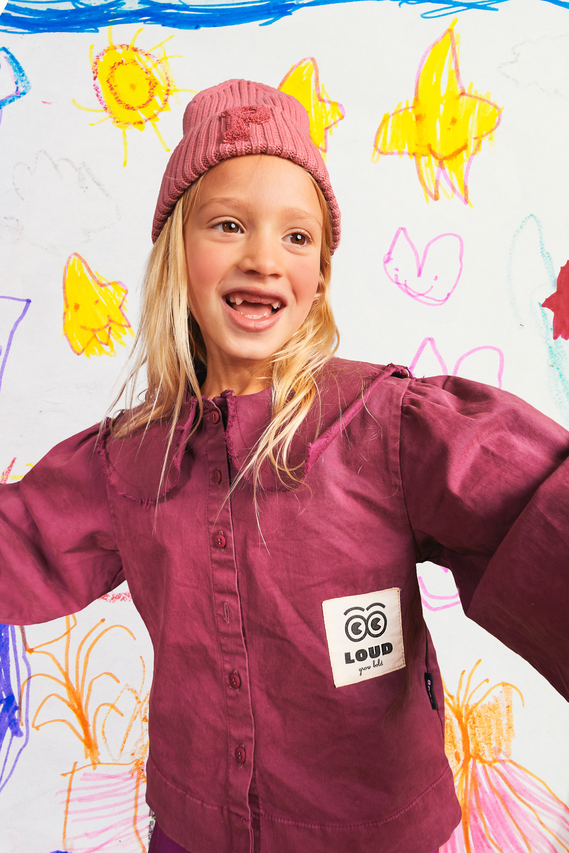 Una: grape wine stone wash shirt with large collar by LOUD, pink knitted P beanie by Polarn O. Pyret