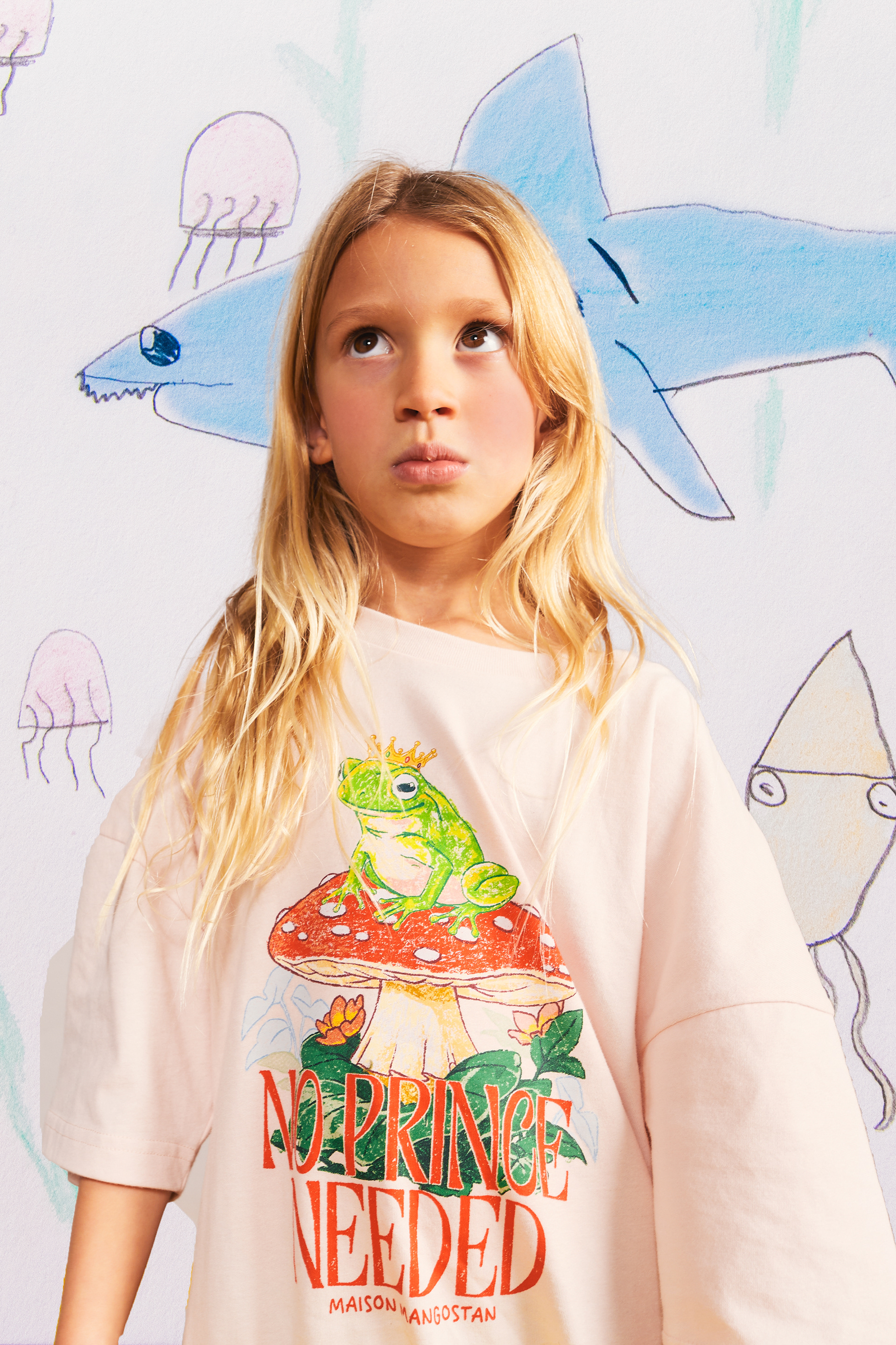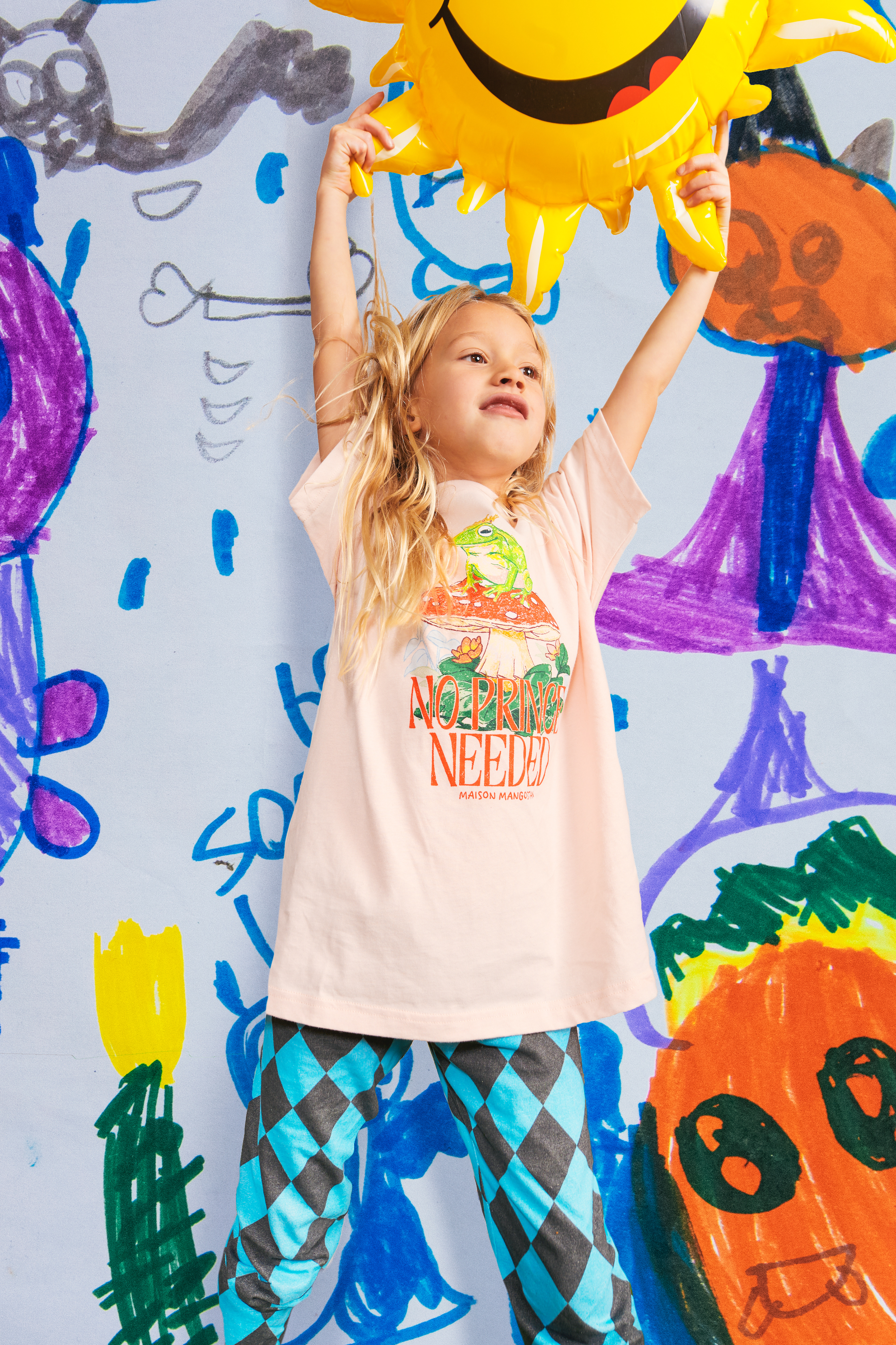 Una: blush ‘no prince needed’ T-shirt, harlequin leggings