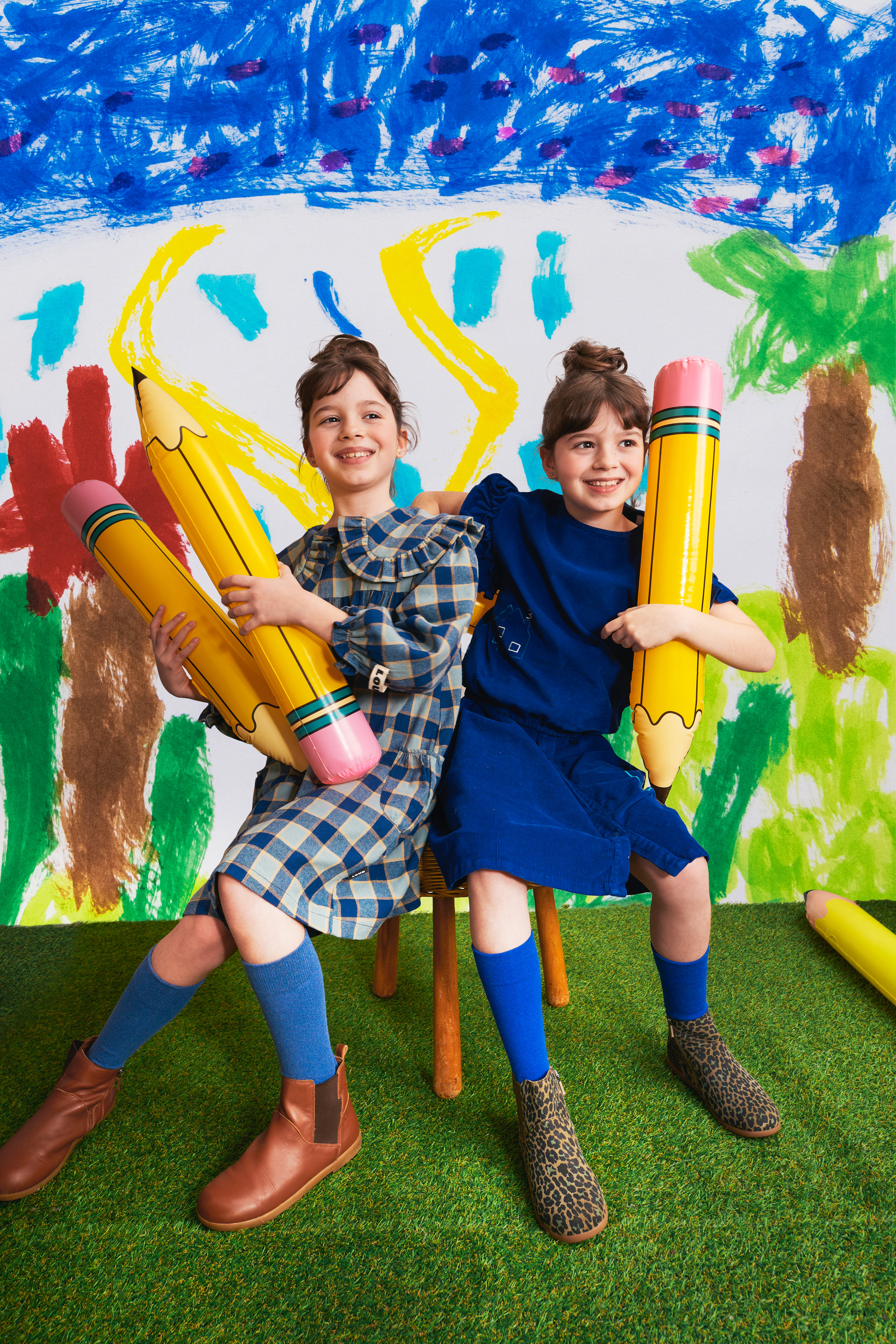 Aria: navy waisted dress by LOUD, harlequin socks by Maison Mangostan, shoes by Bobo Choses x Camper