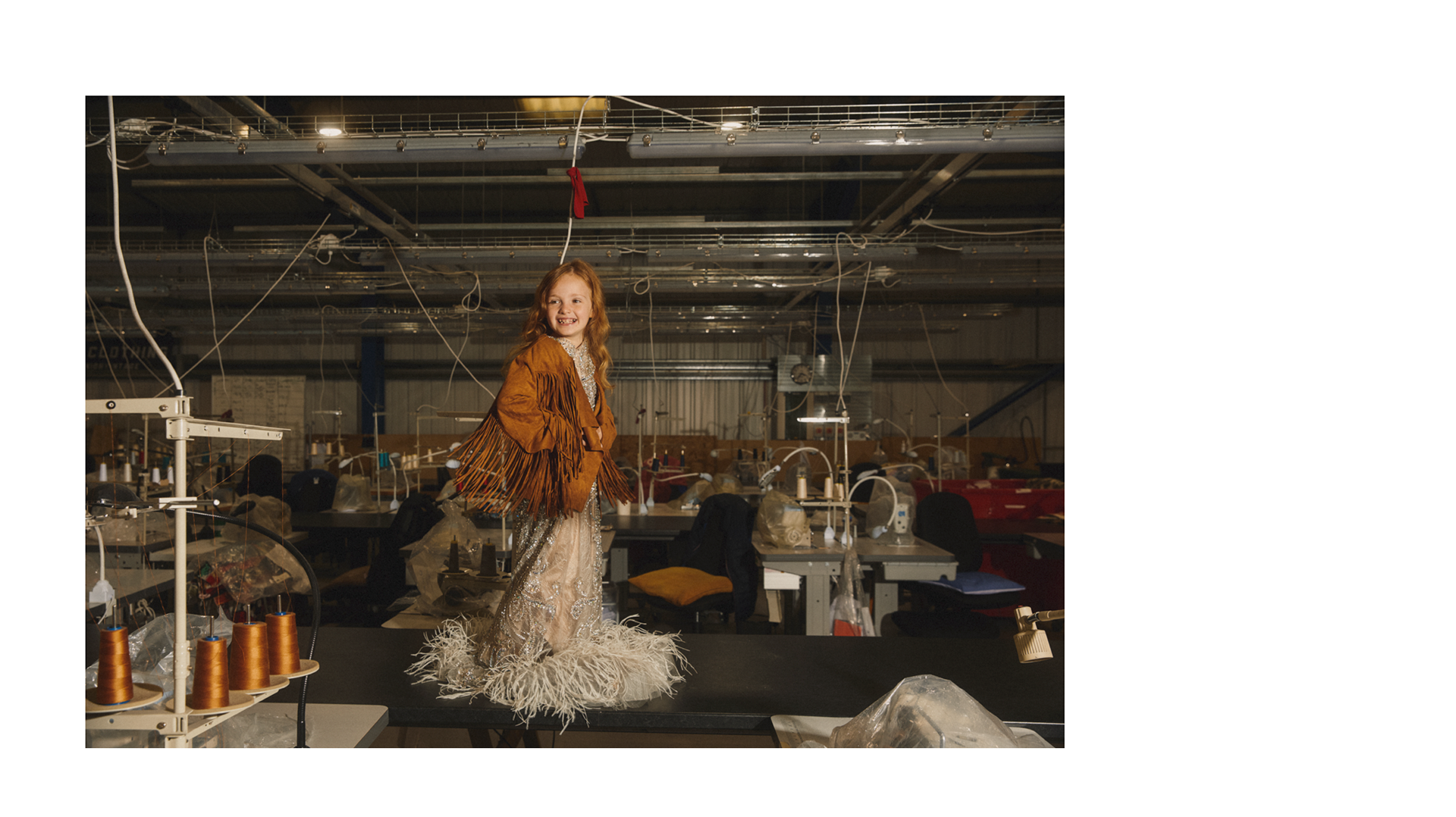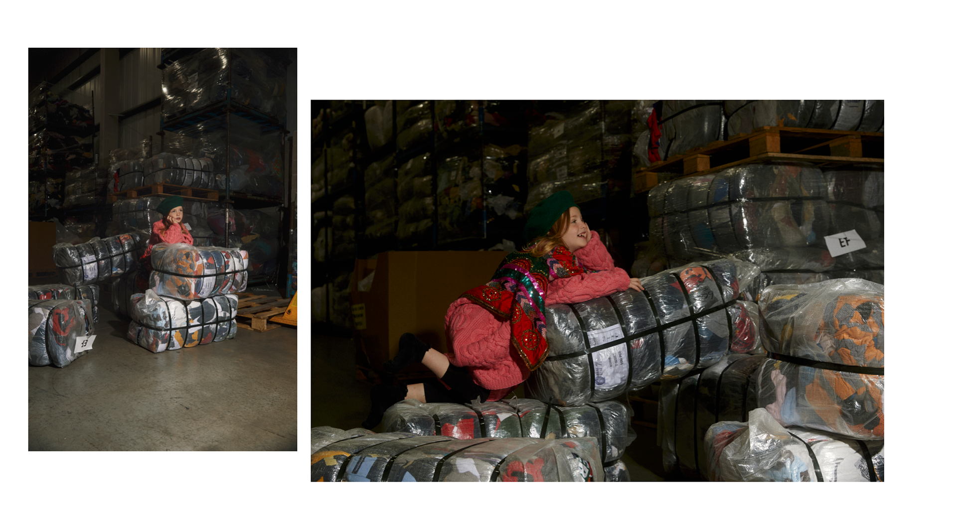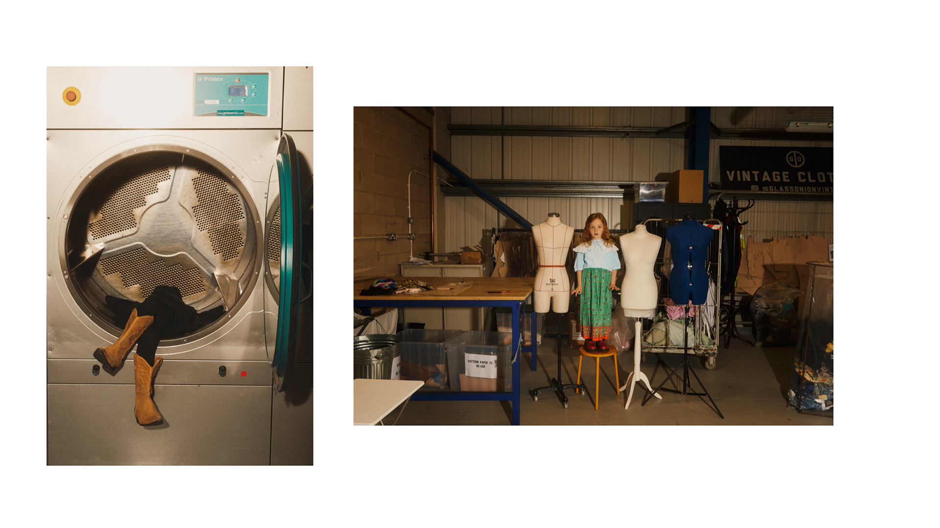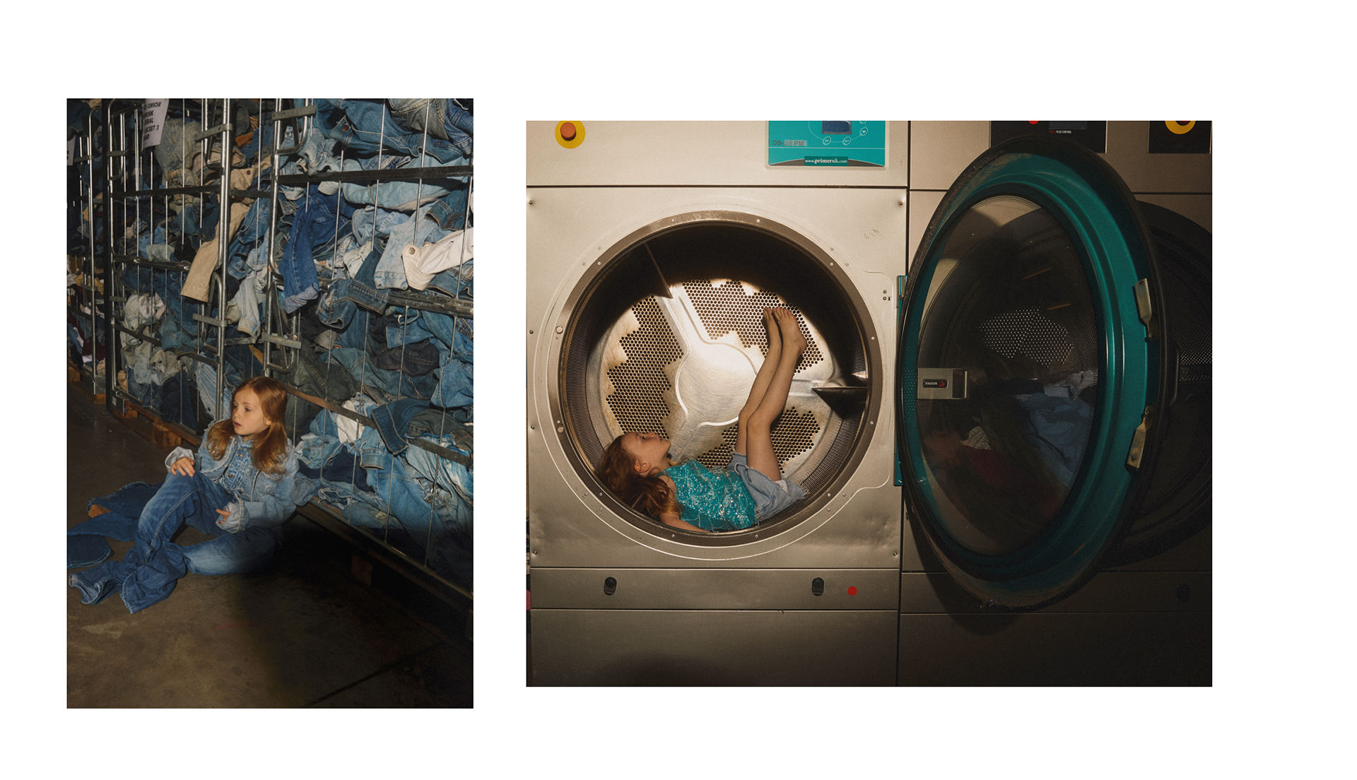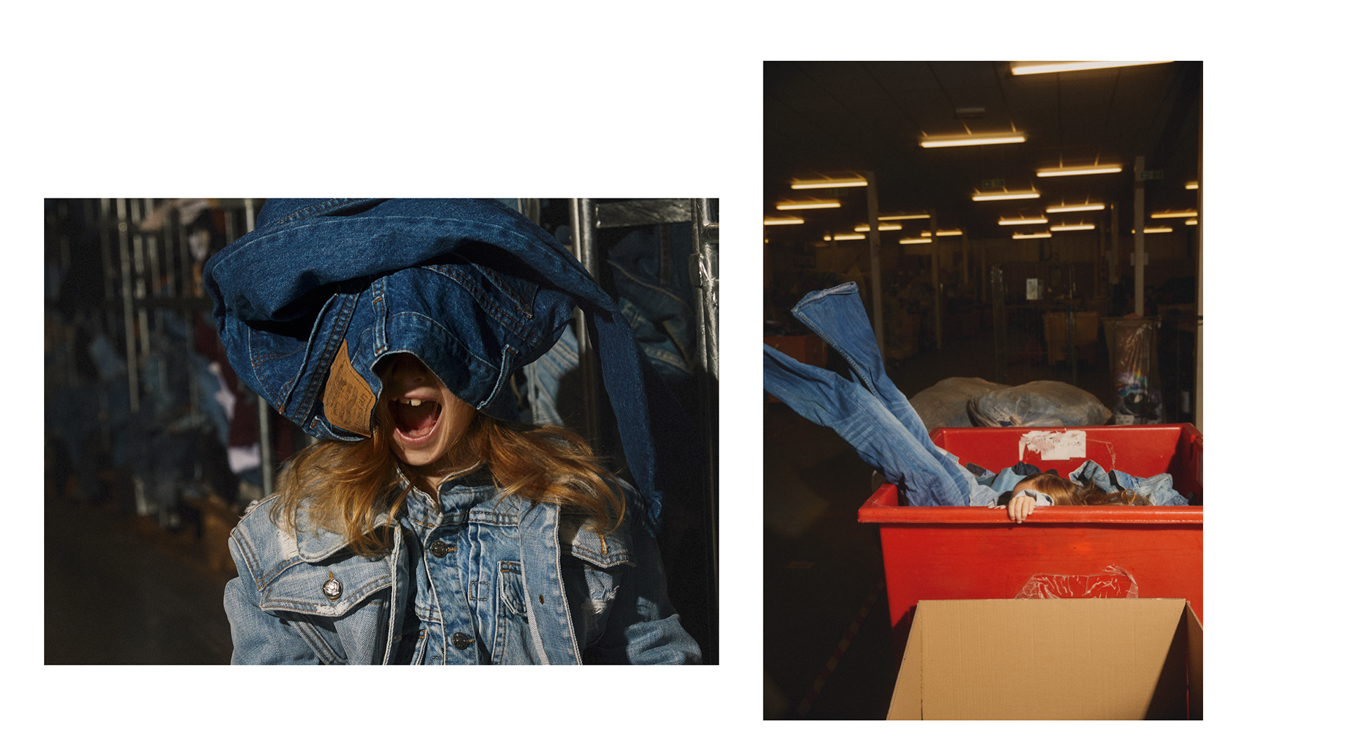 As the planet drowns under the millions of pieces of fast fashion clothing that is made quickly and worn briefly we wanted to create a story that focused on sustainable vintage clothing. Shot on location in the largest vintage fashion warehouse in the UK we shot a story about a girl that plays and dresses up and creates outfits out of the vintage fashion that she finds. The story is styled with all vintage clothing from Glass Onion Vintage. Featuring iconic brands like Levi's We wanted to imagine how a child would dress themselves if able to play in such a huge dressing up box!