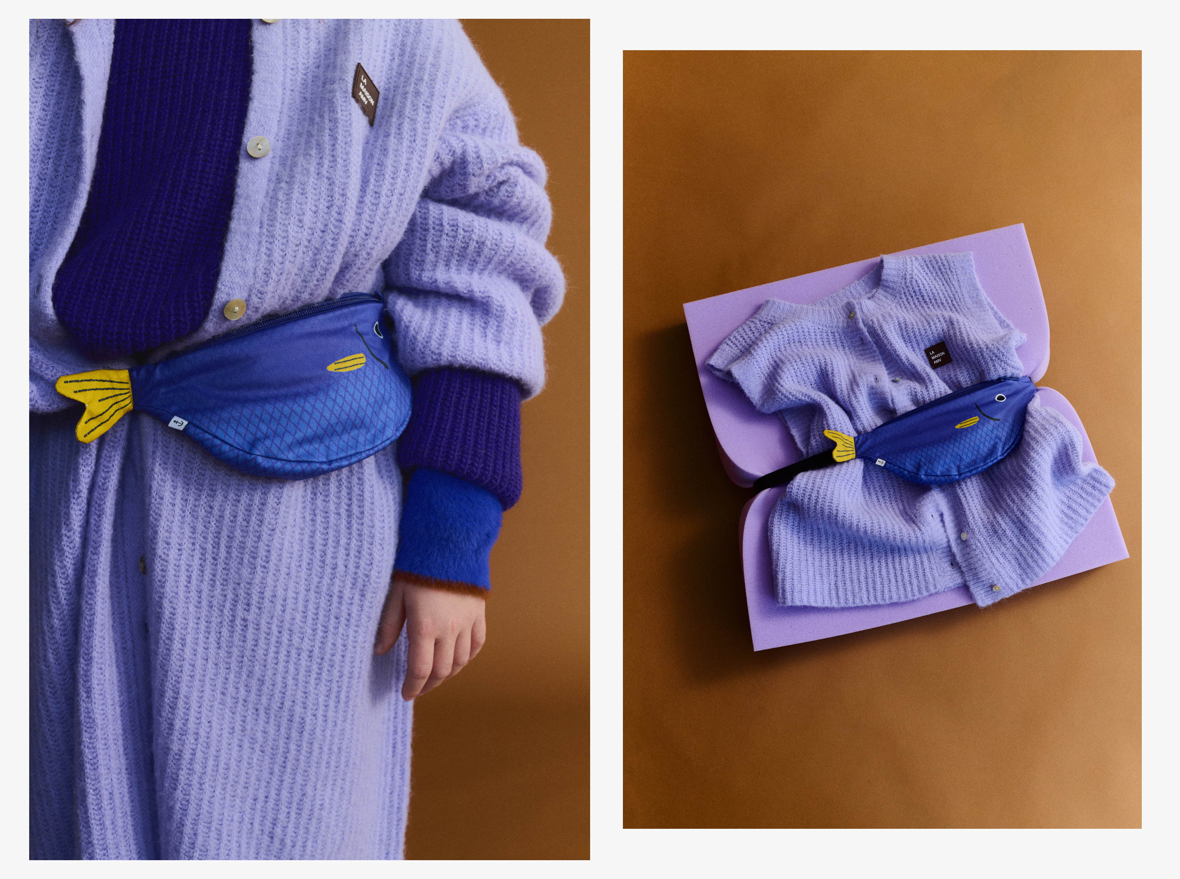 Valentina: Cardigan and Purple Sweater American Vintage, Blue Sweater Bellerose, Pants Tangerine, Fanny Pack Don Fisher