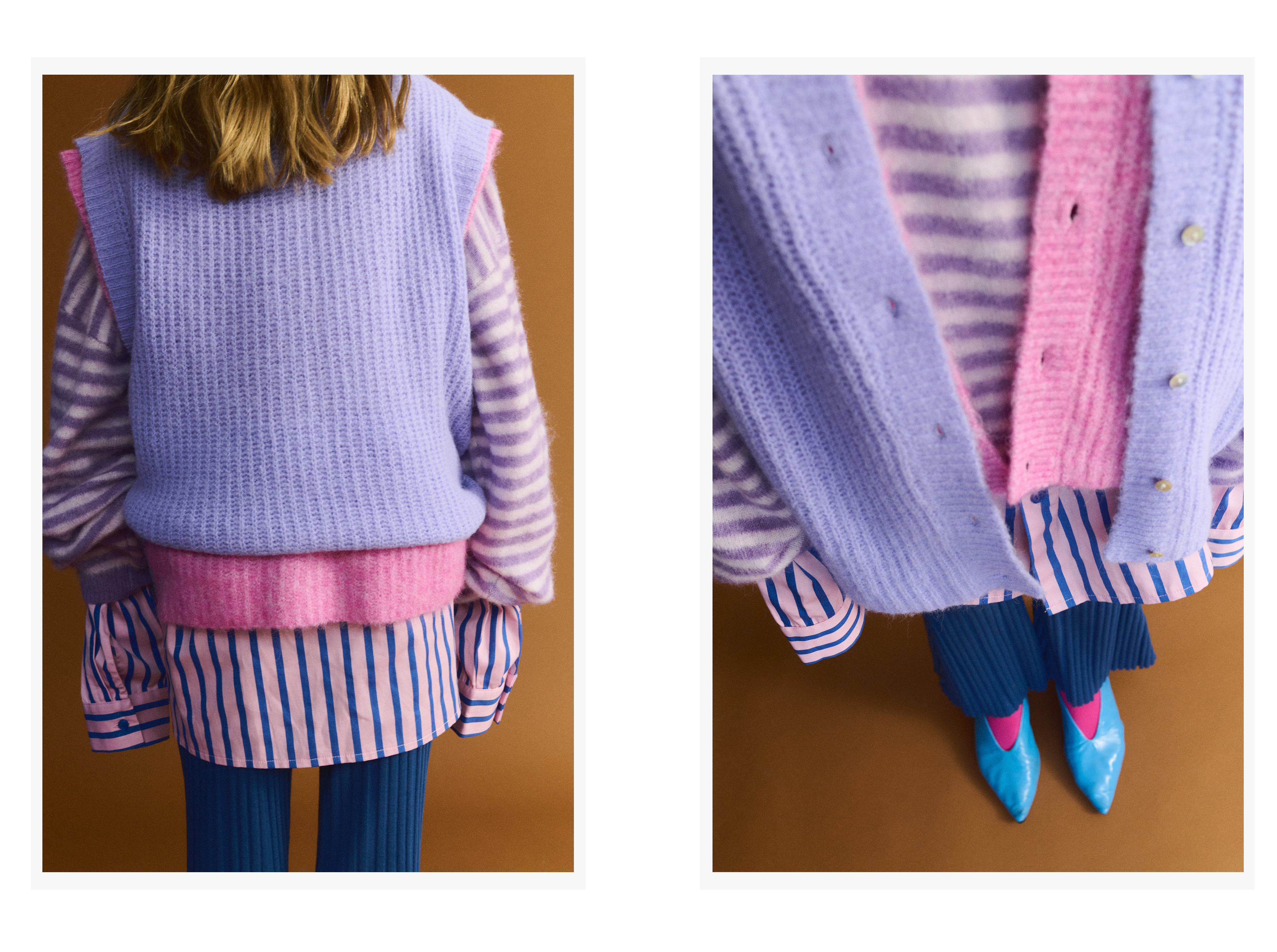 Valentina: Cardigan American Vintage, Pink Vest and Purple Vest American Vintage, Sweater American Vintage, Shirt The Sunday Collective, Pants Tangerine, Shoes Bimba y Lola