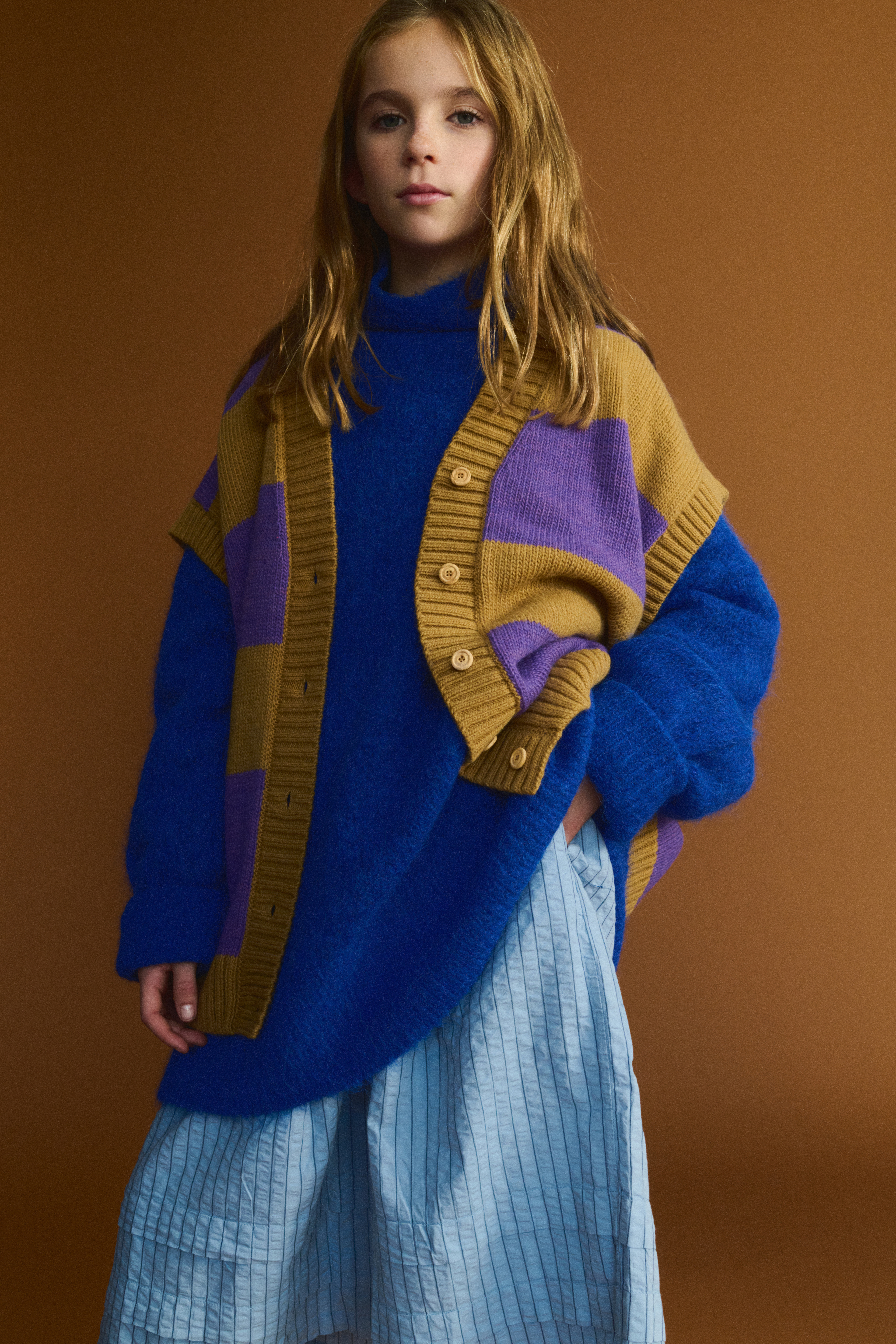 Giulia: Blue Sweater Bellerose, Vest The Animals Observatory, Dress Tangerine