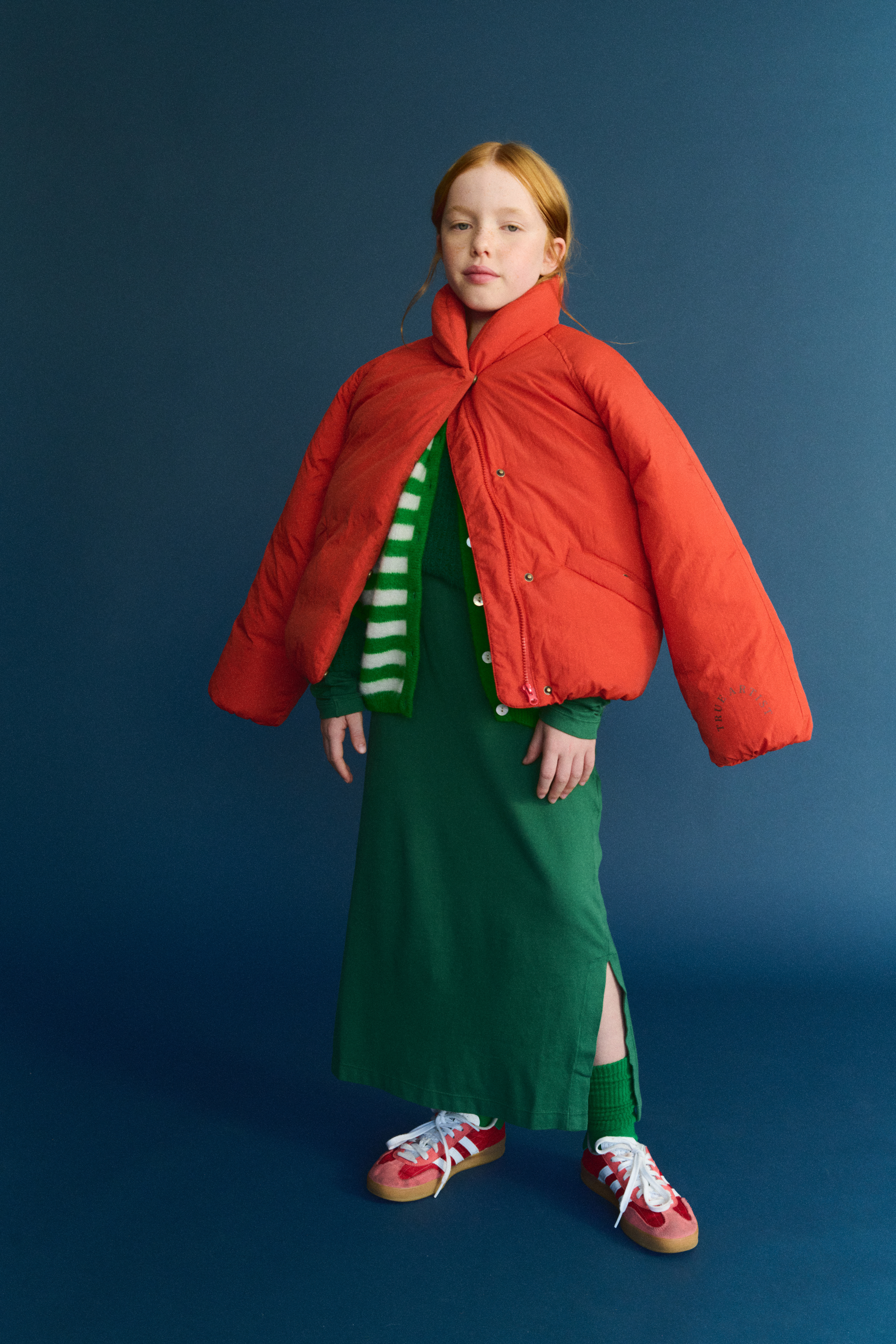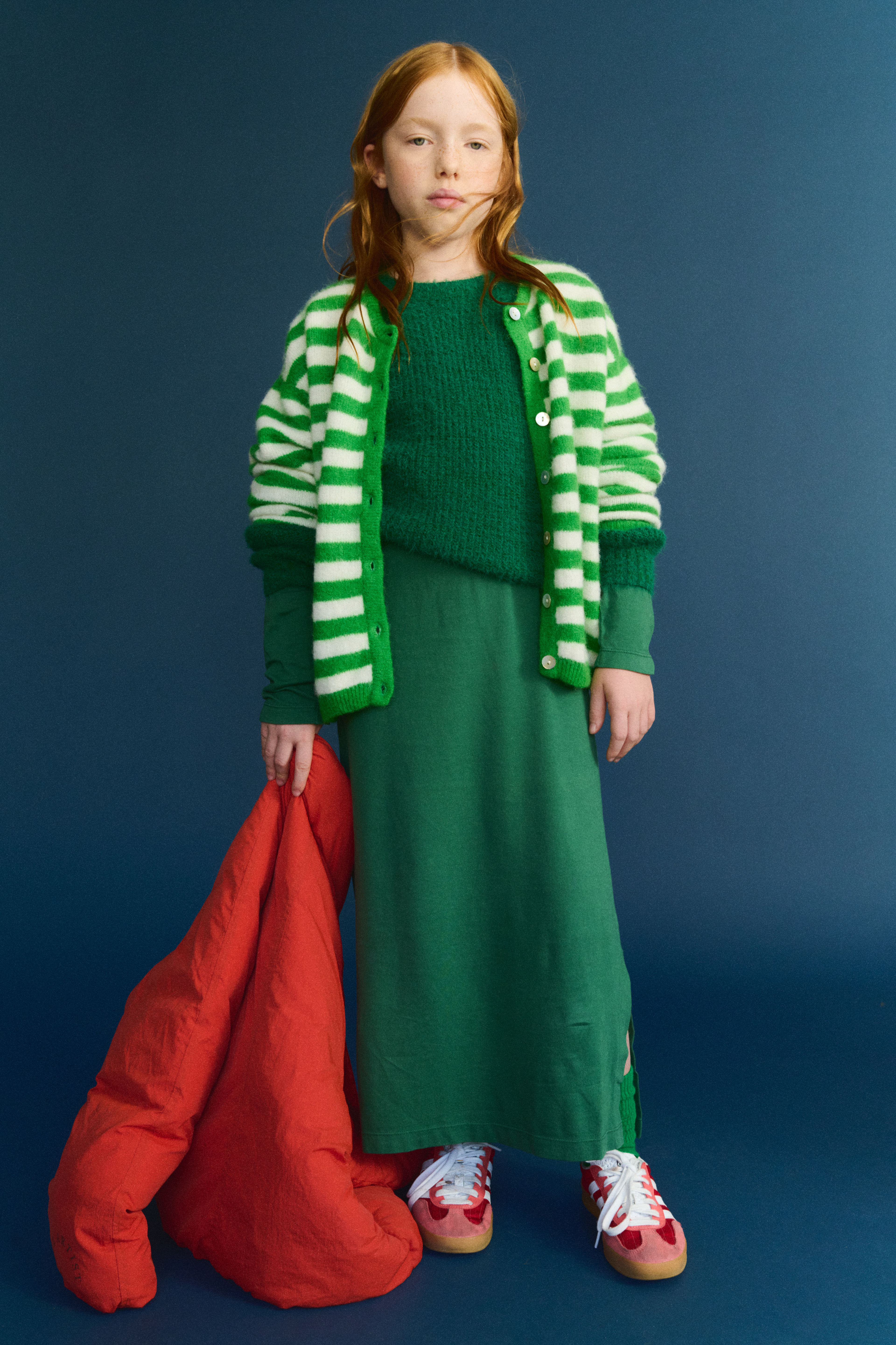 Giulia: Jacket True Artist, Striped Cardigan American Vintage, Green Sweater Compañia Fantastica Mini, Dress The Animals Observatory, Shoes Adidas