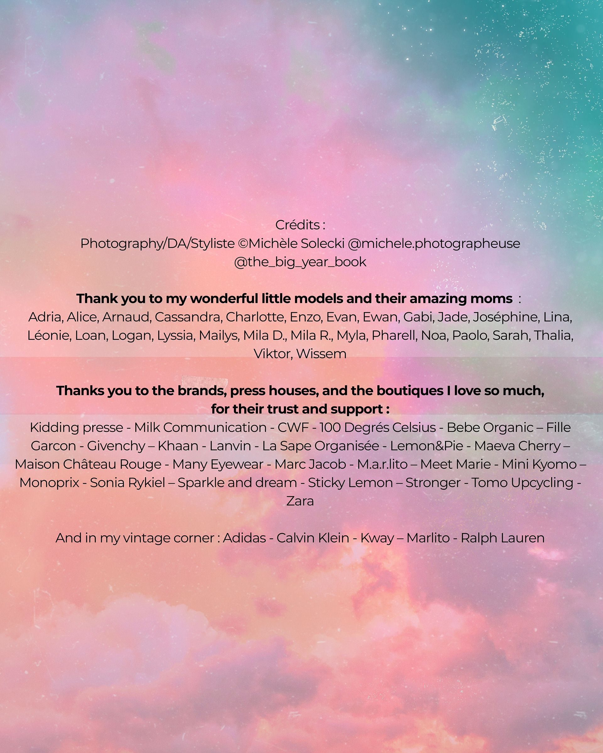 Kidding presse - Milk Communication - CWF– 100 Degrés Celsius - Bebe Organic – Fille Garcon - Givenchy – Khaan - Lanvin - La Sape Organisée - Lemon&Pie - Maeva Cherry – Maison Château Rouge - Many Eyewear - Marc Jacob - M.a.r.lito – Meet Marie - Mini Kyomo – Monoprix - Sonia Rykiel – Sparkleanddream - Sticky Lemon – Stronger - Tomo Upcycling - Zara