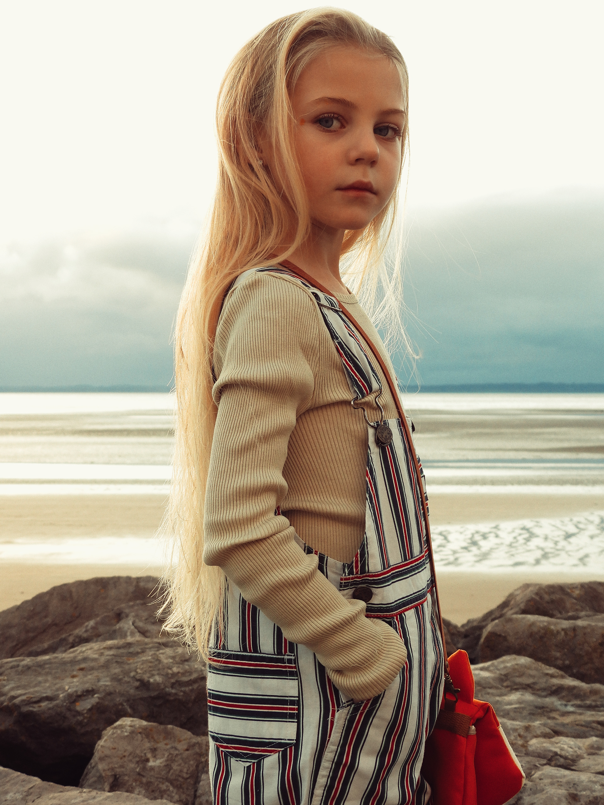Long sleeve beige T-shirt worn under dungarees MINIMALISMA @minimalisma_com