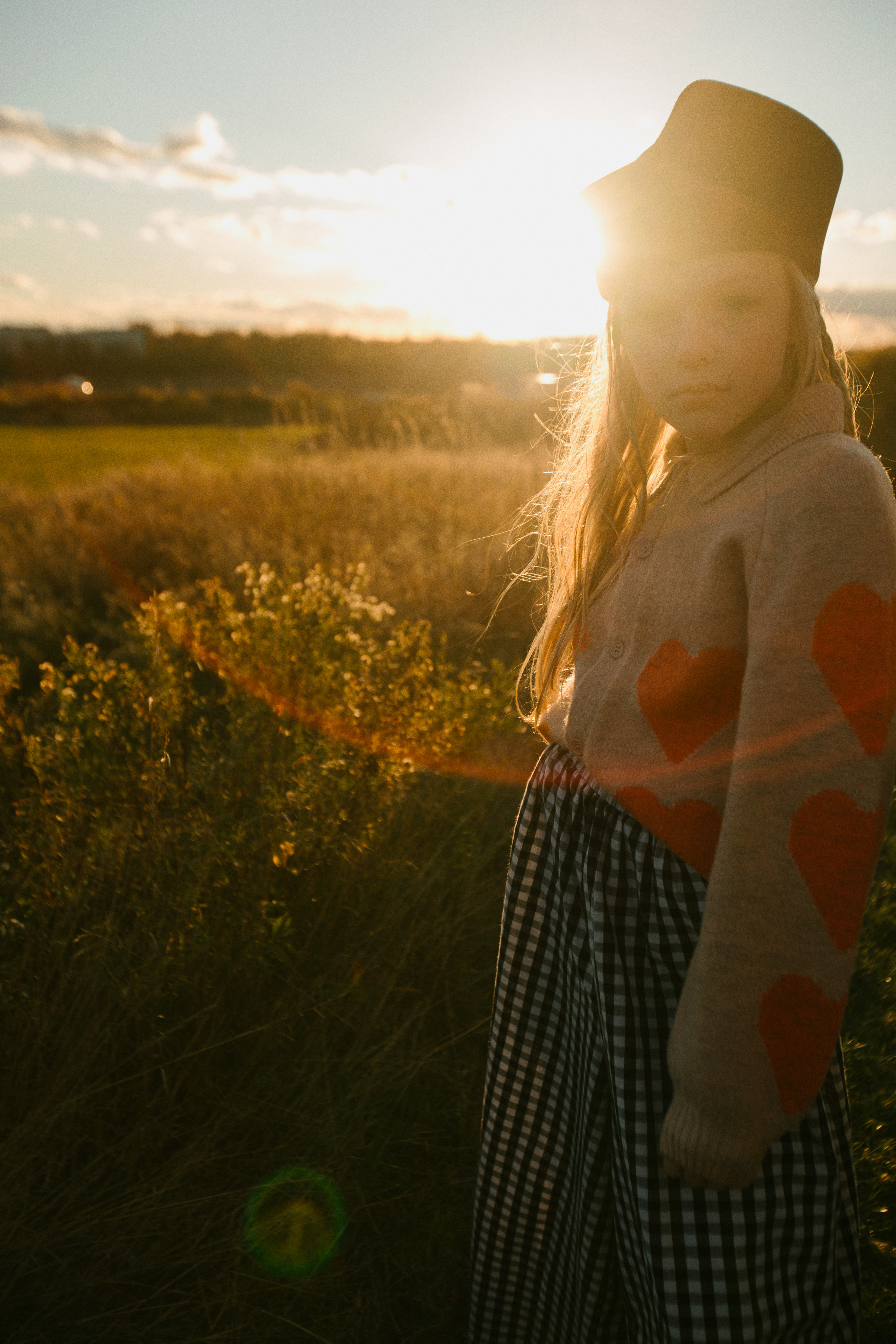 Lélia: Sweatshirt Eve Gravel, Cardigan Stella McCartney, Billie Le Kid, Skirt Petit Sézane, Shoes Converse, Hat Heirloom